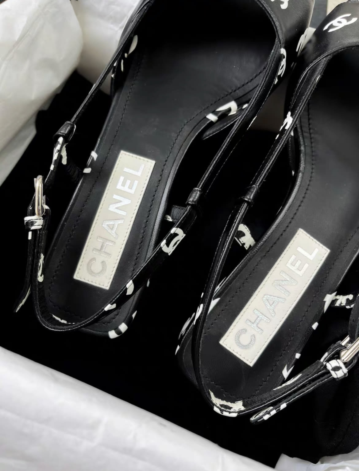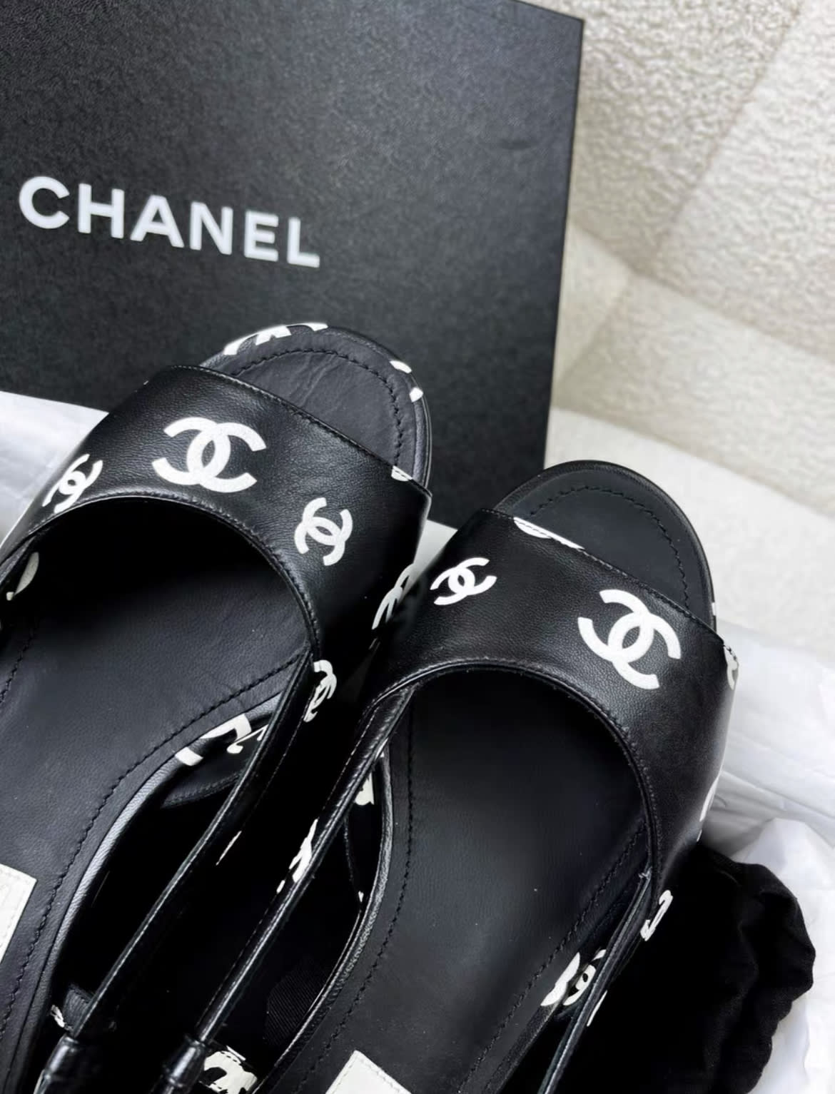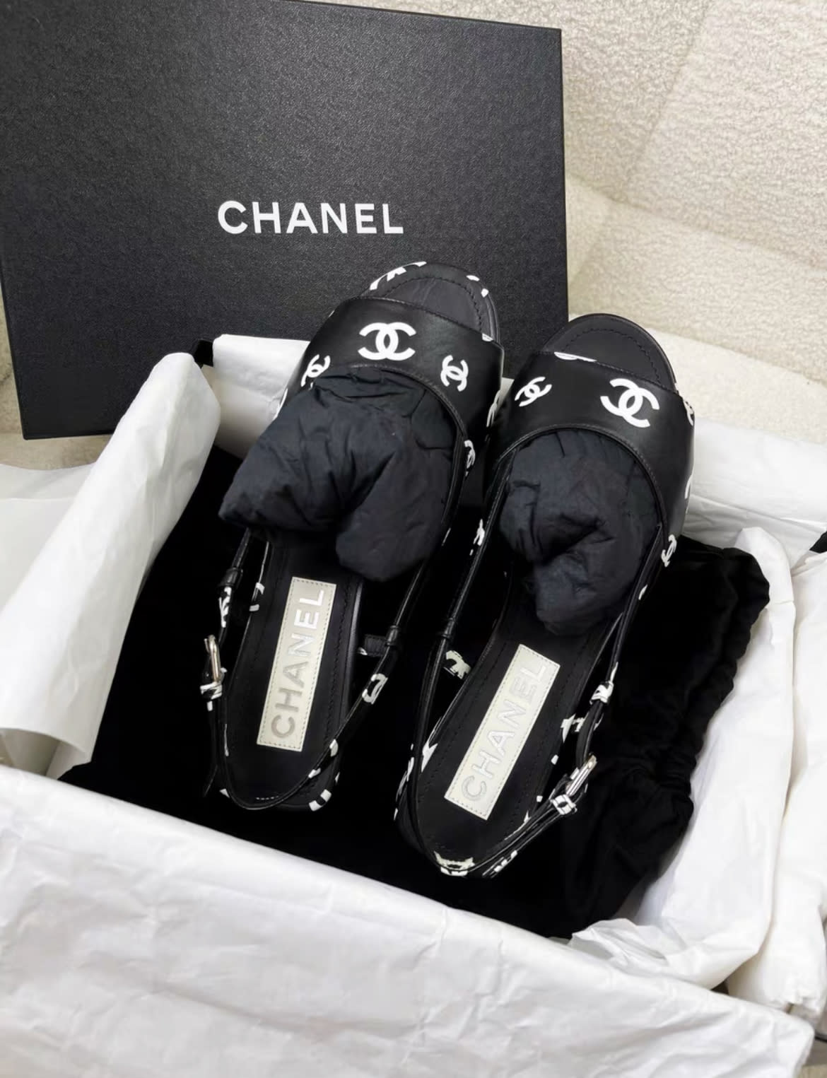 Chanel 22S Black and White Double C Full Logo Slingback sandals