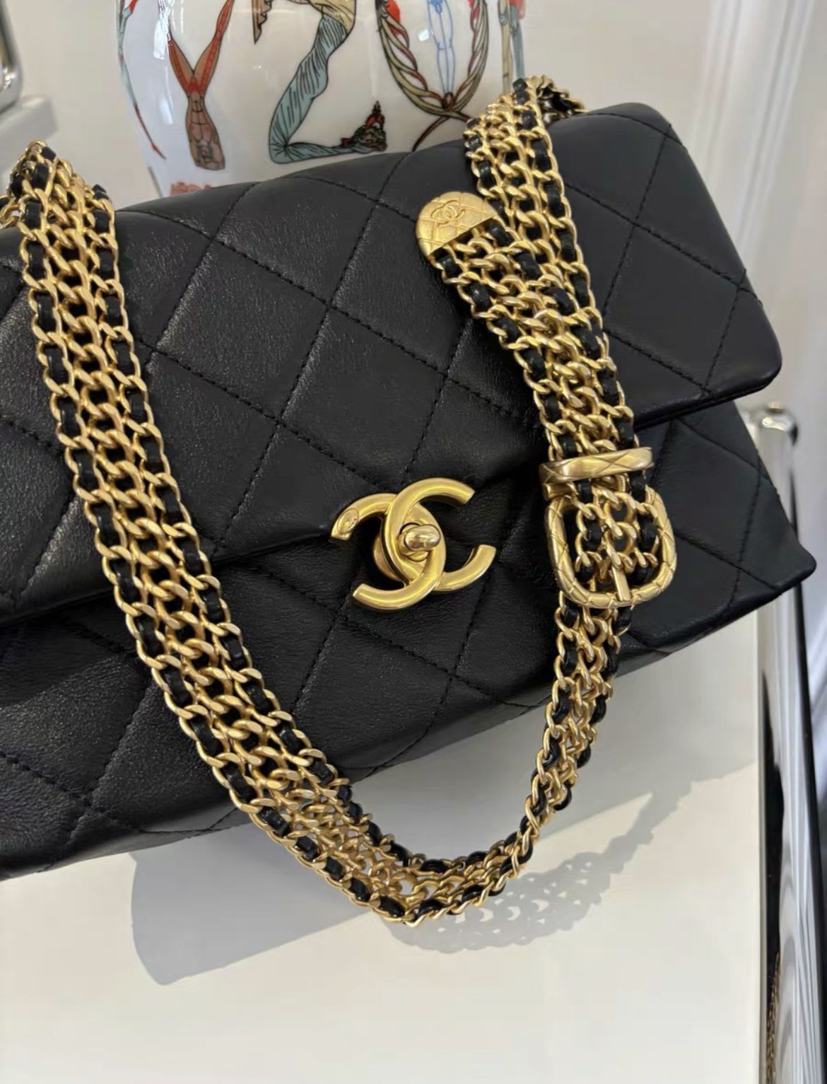 Chanel23s black gold cowhide metal braided belt shoulder strap