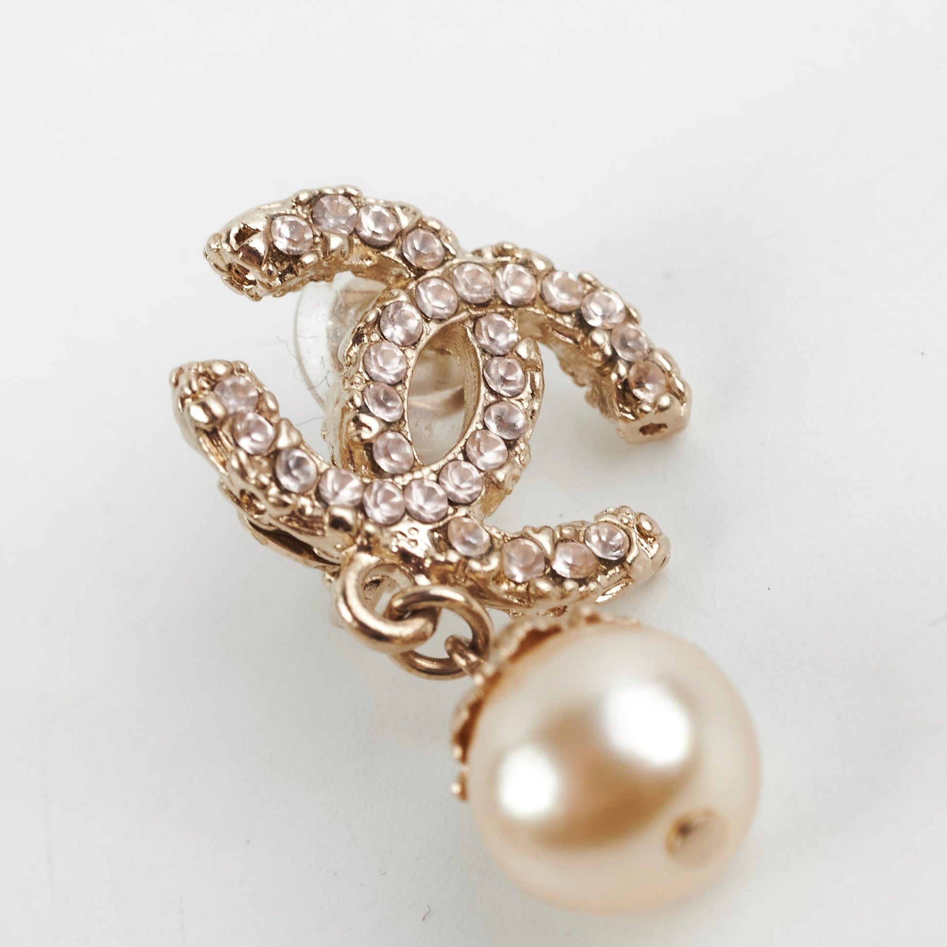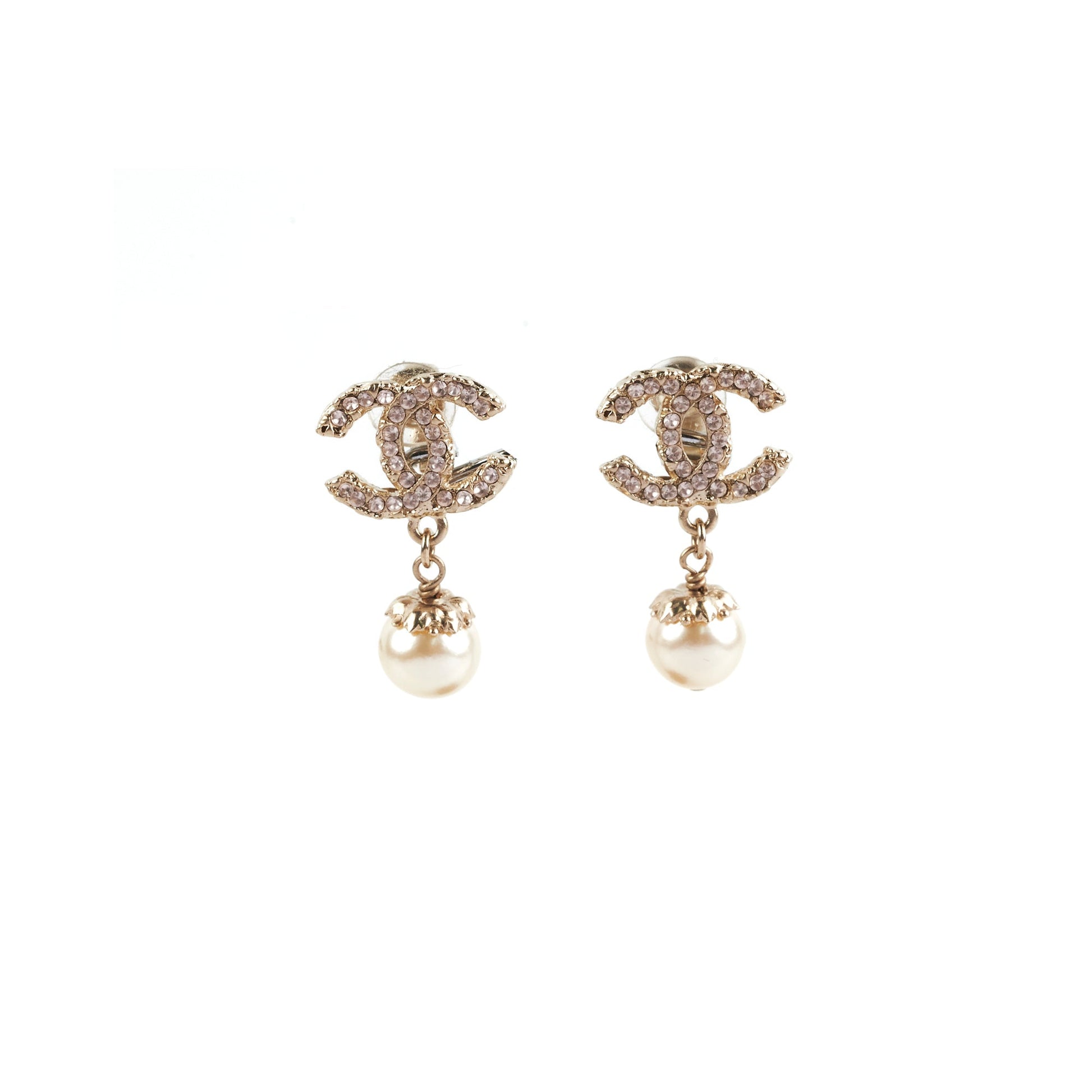Chanel Coco Logo Clip On Pink Rhinestone Pearl Drop Earrings Costume Jewellery