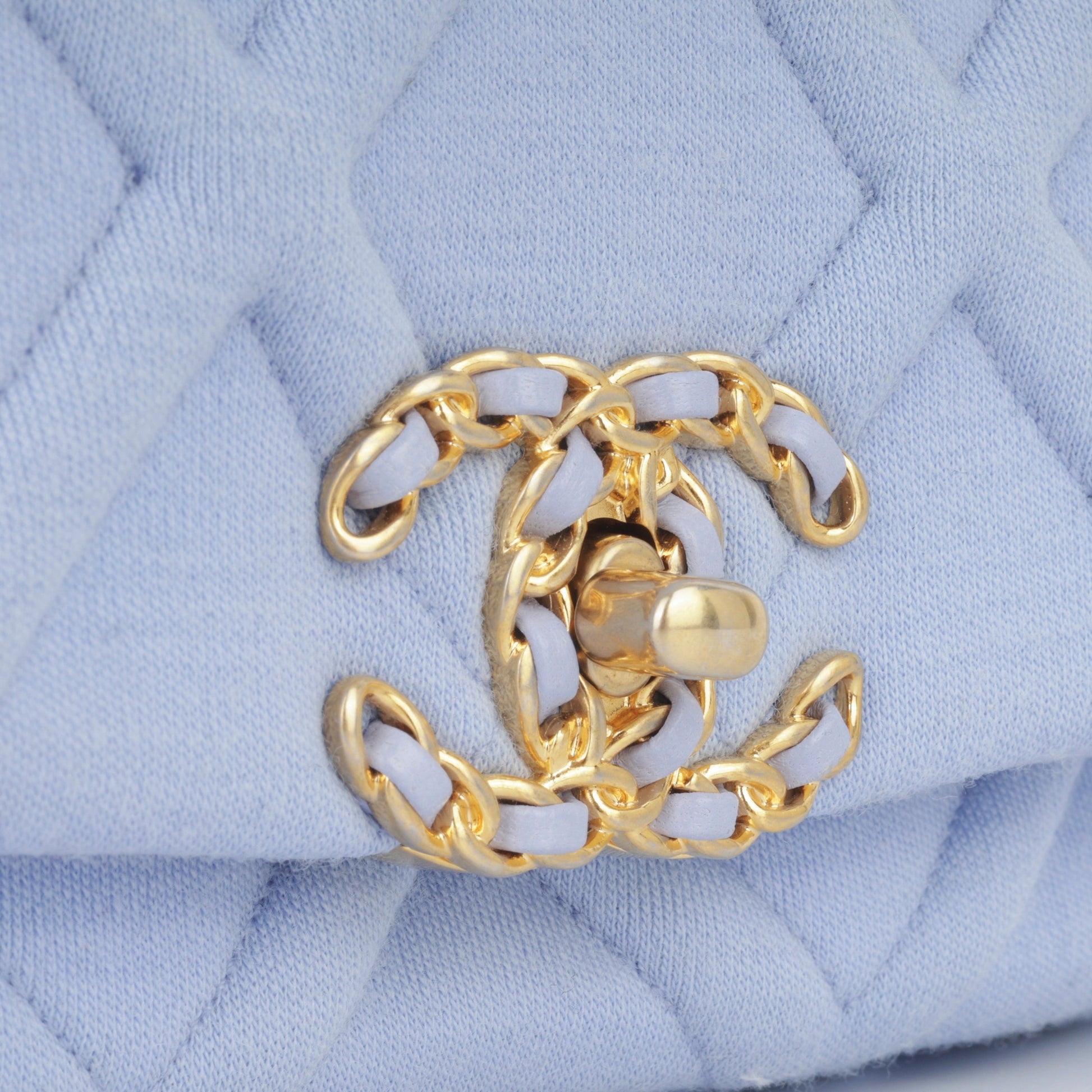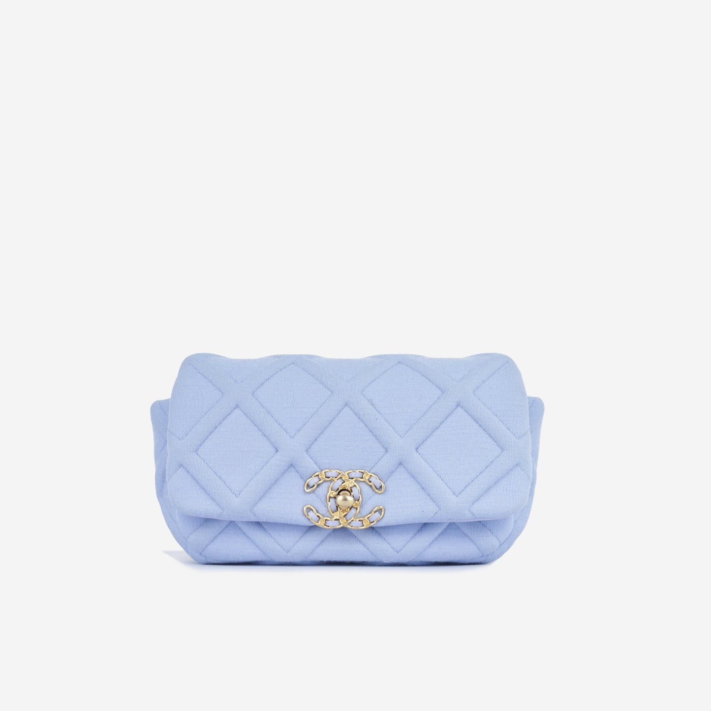 9Introducing the Chanel 19 Belt Bag – a stunning fusion of elegance, versatility, and contemporary design. This iconic accessory effortlessly marries classic Chanel aesthetics with modern functionality, making it a must-have for fashion enthusiasts. Crafted with meticulous attention to detail, the Chanel 19 Belt Bag in light blue is a true testament to the brand's commitment to luxury and style.The bag is crafted from a harmonious blend of high-quality materials, featuring a unique combination of jersey and lambskin. The jersey provides a lightweight and breathable feel, while the lambskin adds a touch of luxury and durability. The meticulous choice of materials reflects Chanel's dedication to creating accessories that stand the test of time.