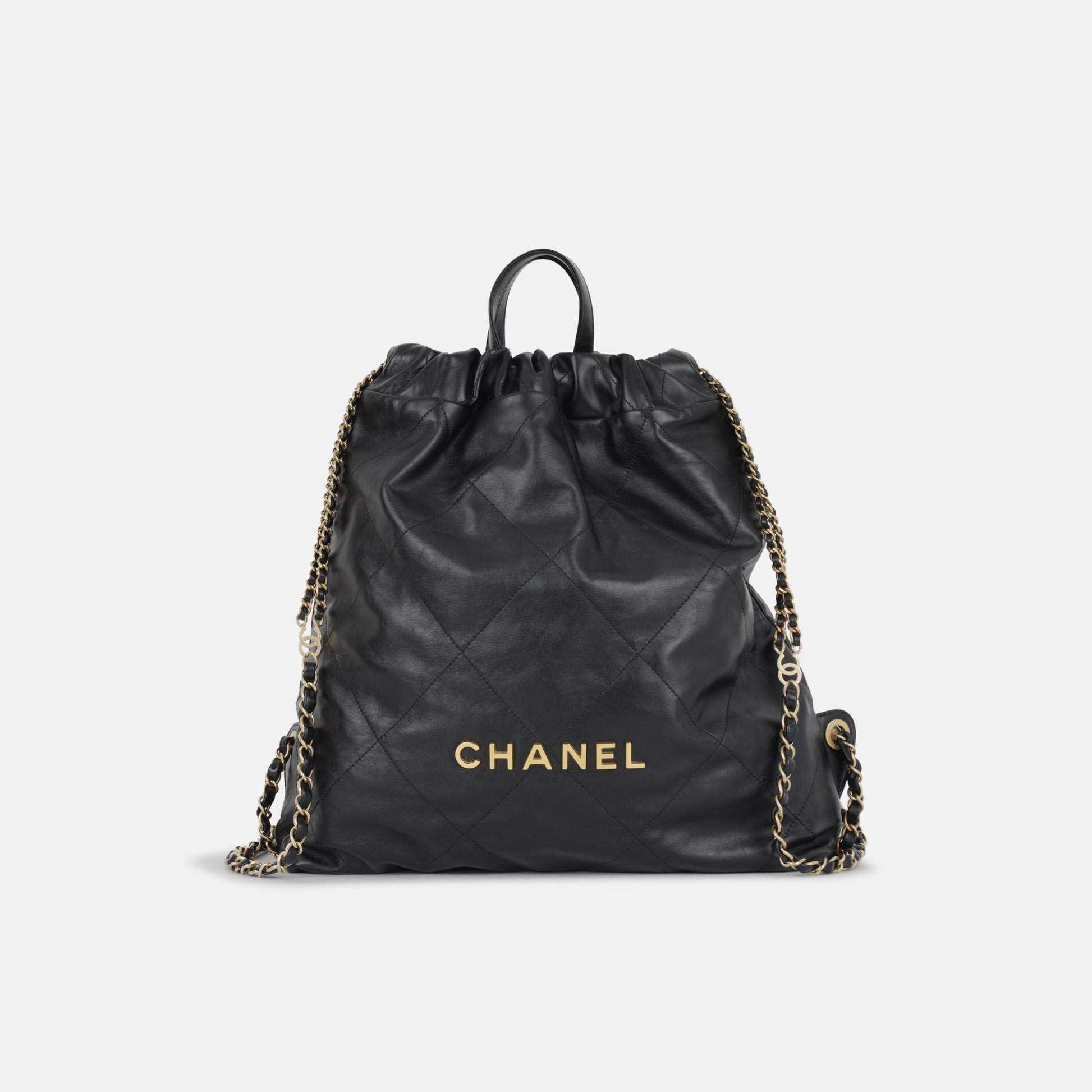 Carefully crafted from black quilted shiny calfskin leather, Chanel presents a variation of their 22 collection in the form of a backpack. The chicest item for the lady that wants to carry everything around with them, this bag features Chanels classic interwoven back straps along with top handles to carry it handheld. This piece from 2022 is a well worthy addition to any luxury handbag collection.
