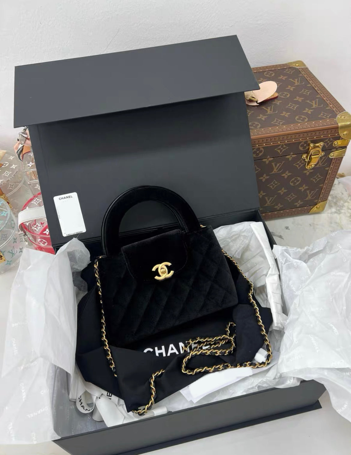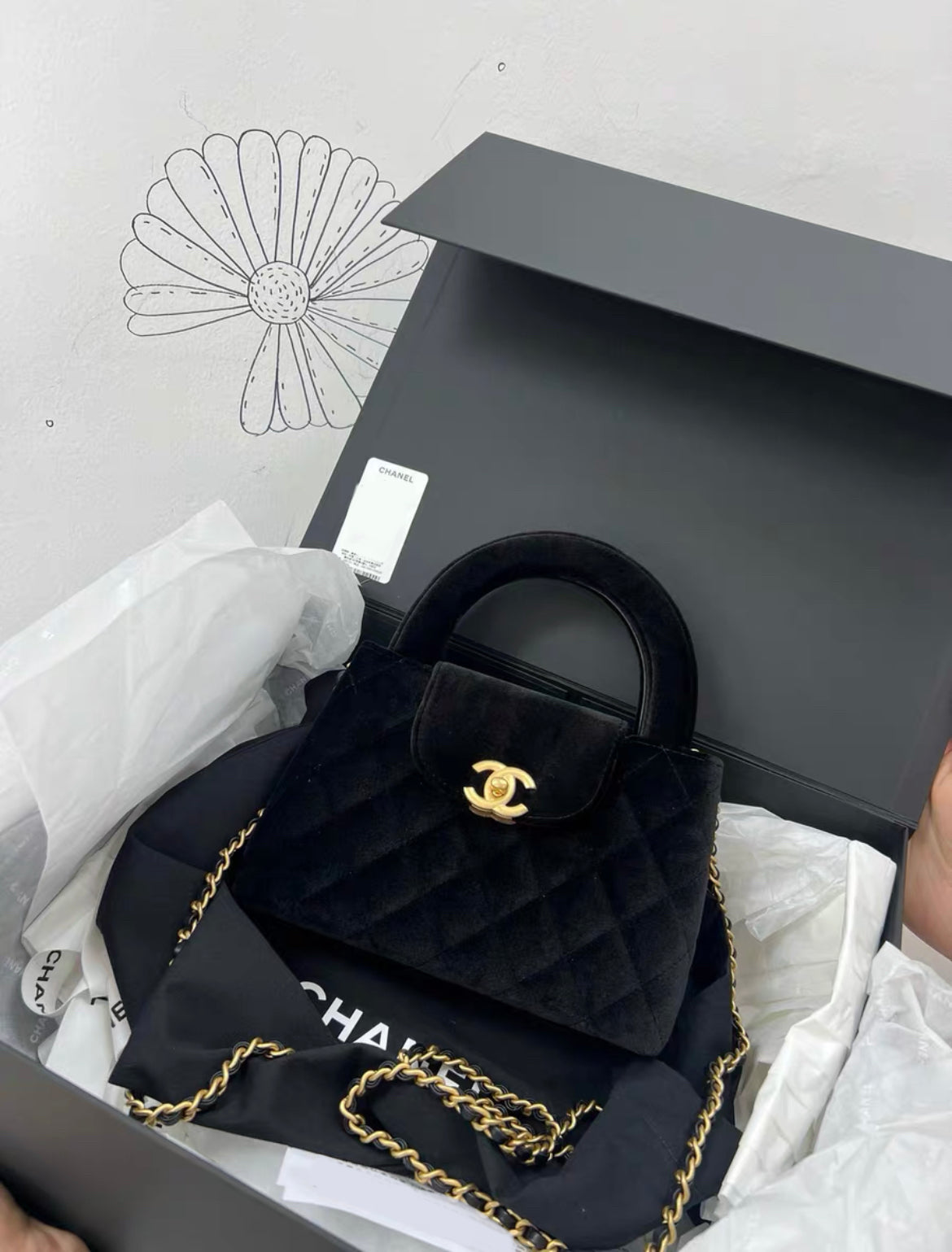 24A CHANEL KELLY Black VELVET Top Handle Shopping Bag Handbag Gold