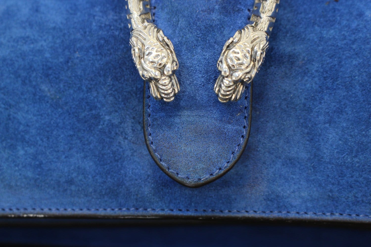 Crafted from oh-so soft, blue suede, the Dionysus shoulder bag from Gucci will become a staple in your wardrobe. This beautiful bag features textured tiger head closure which is why it is called the Dionysus, who in myth is said to have crossed the river Tigris on a tiger sent to him by Zeus.