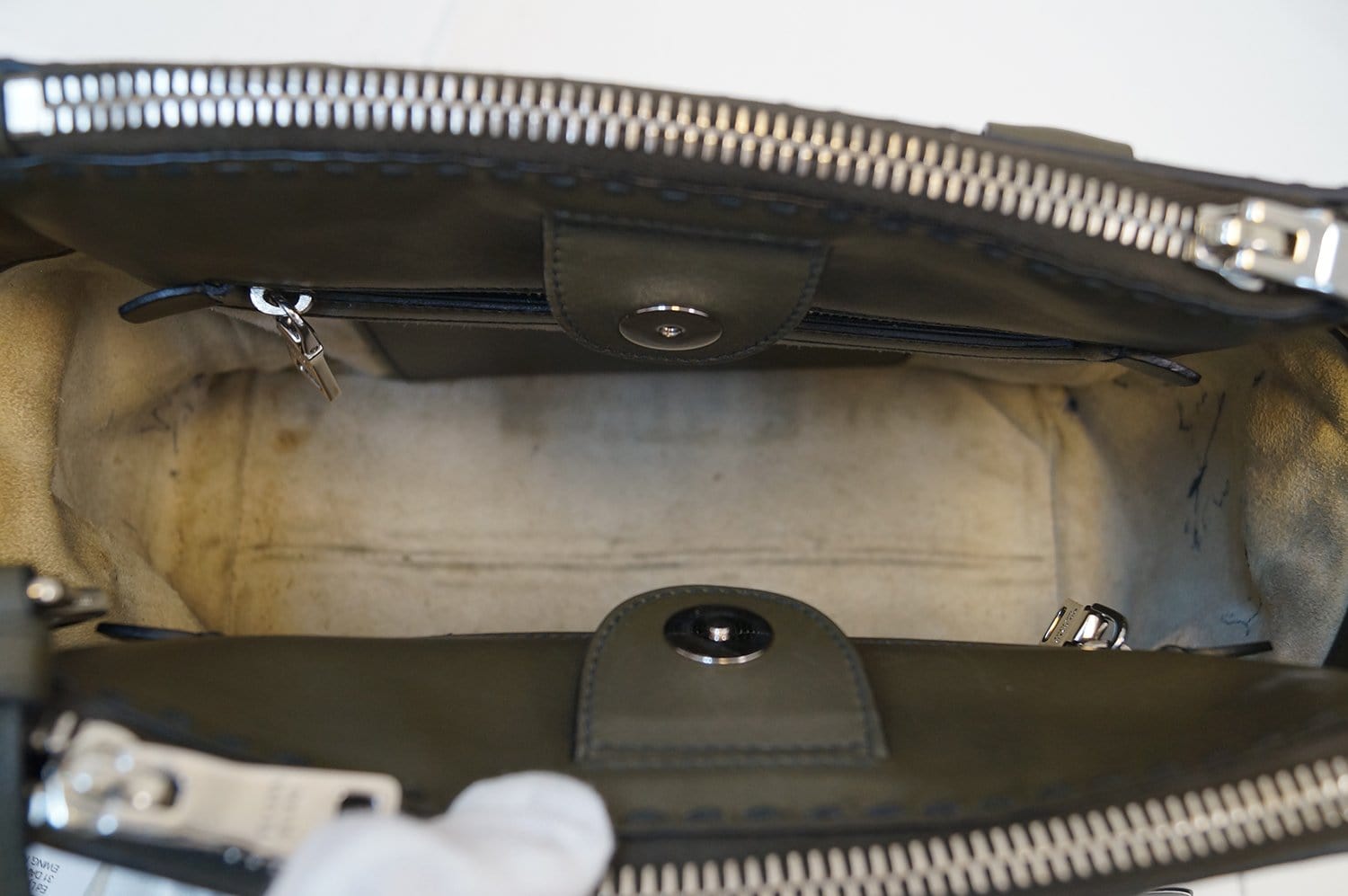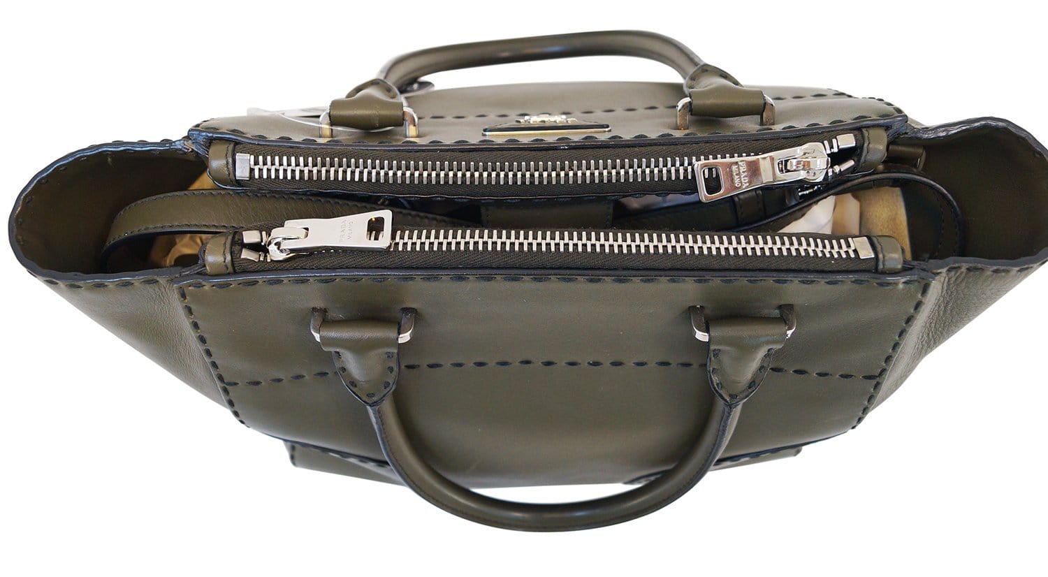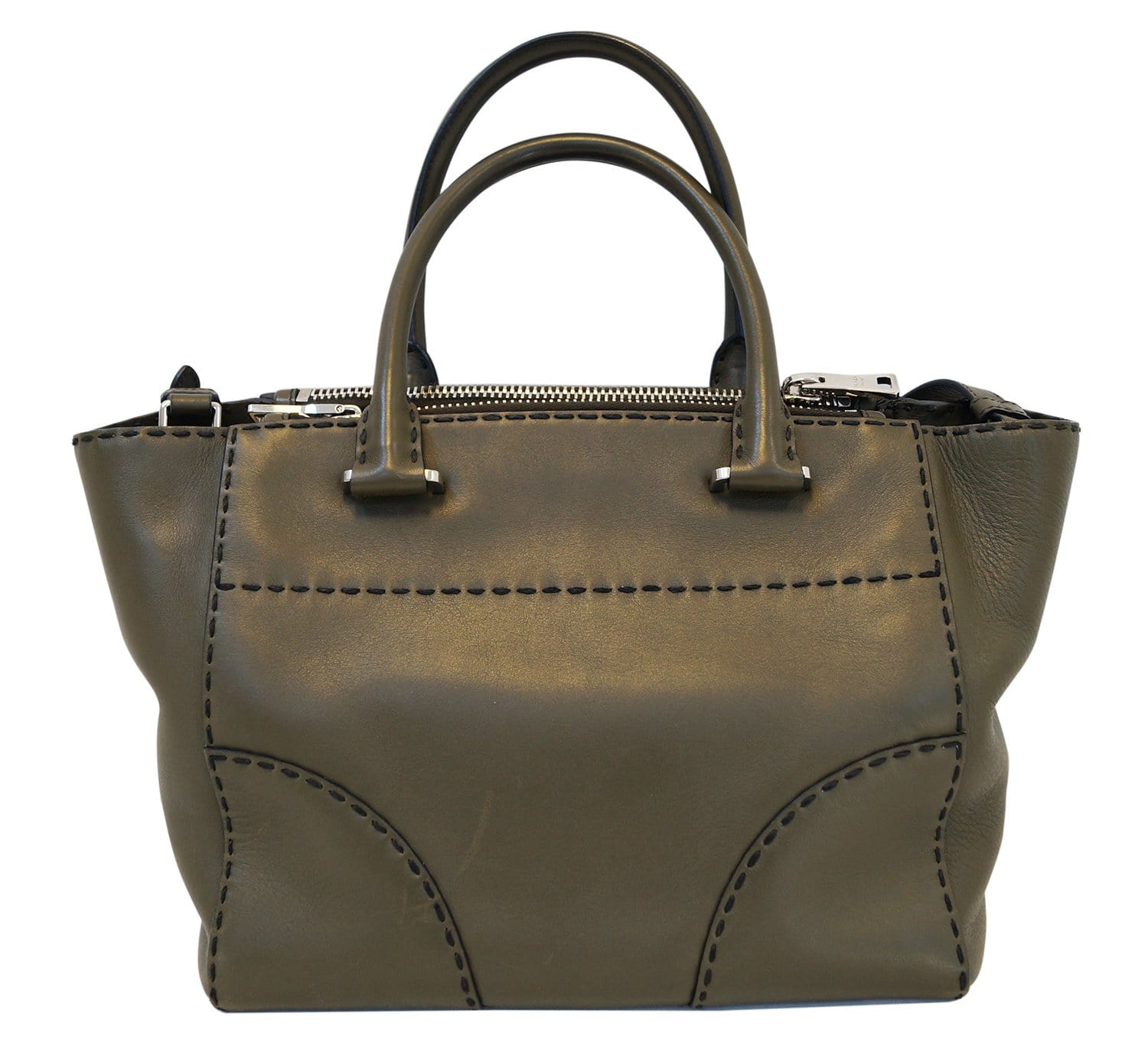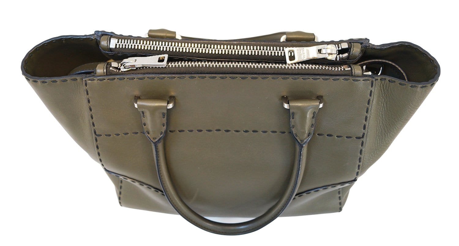 This stylish handbag is crafted of luxurious smooth calf leather in Military Green. The bag features rolled leather top handles with silver links, an optional leather shoulder strap, expanded sides and a top zipper. This opens to a spacious suede interior with zipper and patch pockets.