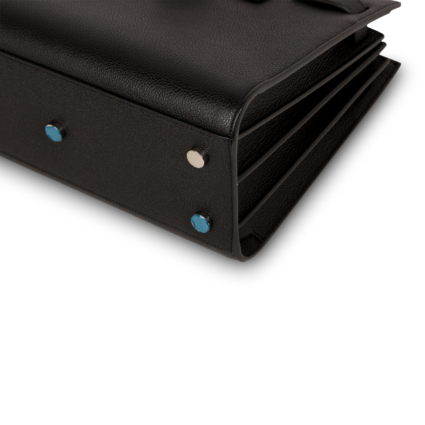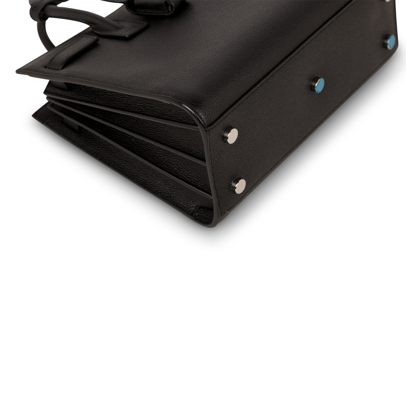Widely renowned for its contemporary take on traditionally understated glamour, Saint Laurent brings us this miniature version of the much celebrated sac du jour. This breathtaking tote is full of character with its black hue grained leather and adornment of silver toned hardware. Its interior encompasses multiple storage compartments and is lined with the finest black fabric lining. Style this bag with your favourite day outfit or detach its shoulder strap to create a jaw-dropping evening look that is sure to leave everyone in awe.