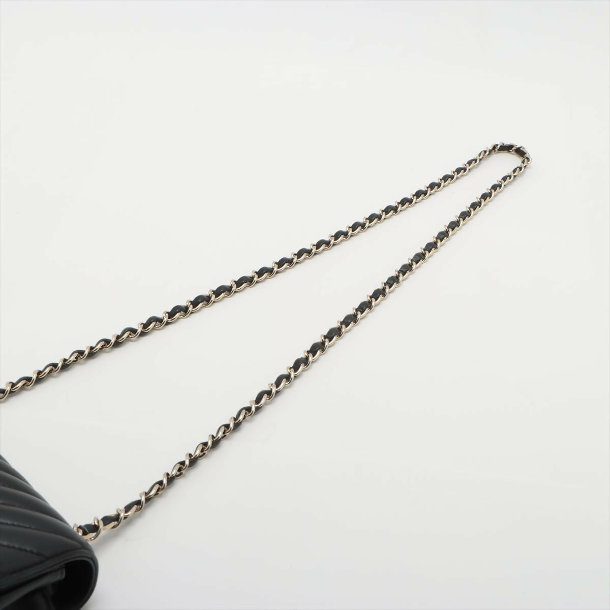 Expertly crafted from luxurious caviar leather, this medium-sized Chanel bag features a sleek black chevron quilted design and a double flap closure. With its timeless style and spacious interior, this bag is perfect for any occasion and will add a touch of sophistication to any outfit.