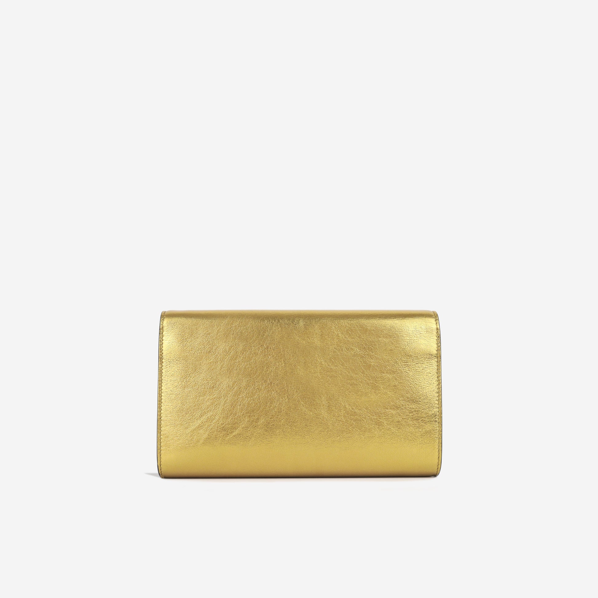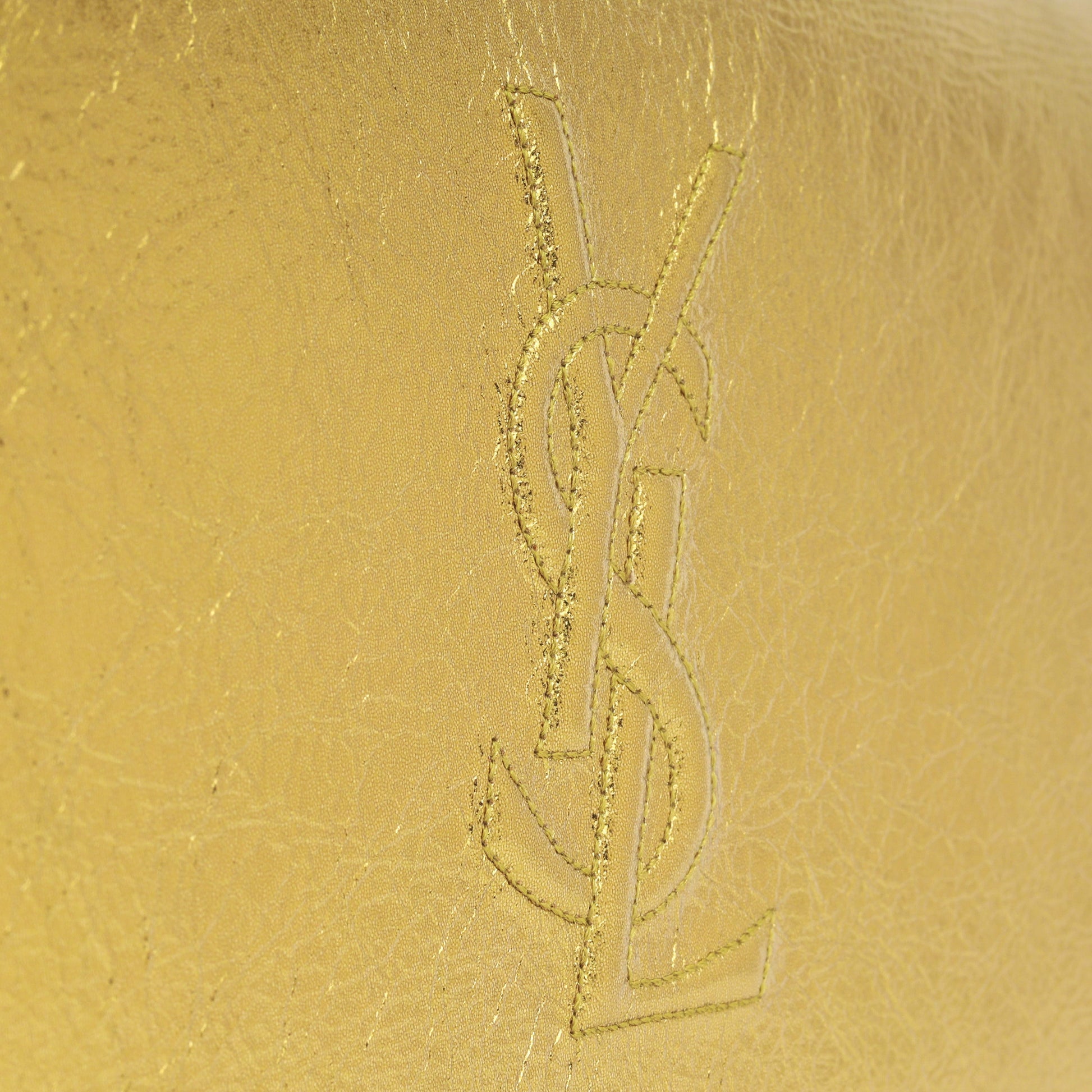Introducing the Belle De Jour Wallet on Chain (WOC) by Saint Laurent, crafted from gold crumpled calfskin leather. This elegant accessory combines sophistication with practicality, featuring a compact design perfect for carrying essentials. With its timeless appeal and iconic YSL logo, the Belle De Jour WOC adds a touch of glamour to any ensemble, making it a must-have for fashion-forward individuals.