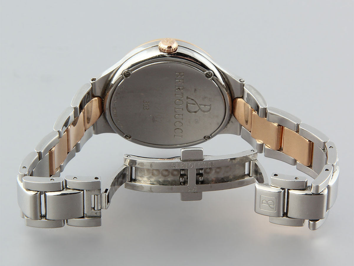 Bertolucci’s Two-Tone Serena Garbo Mid-Size Watch has about 1.25 carats of diamonds on the 18K rose gold bezel—nothing beats sparkle along with the time! Needing a polish, especially on the back of the stainless steel deployment bracelet, the mother of pearl face with Roman numerals is easy to read. A Swiss watch with a 37-millimeter curved head, it is extraordinary!