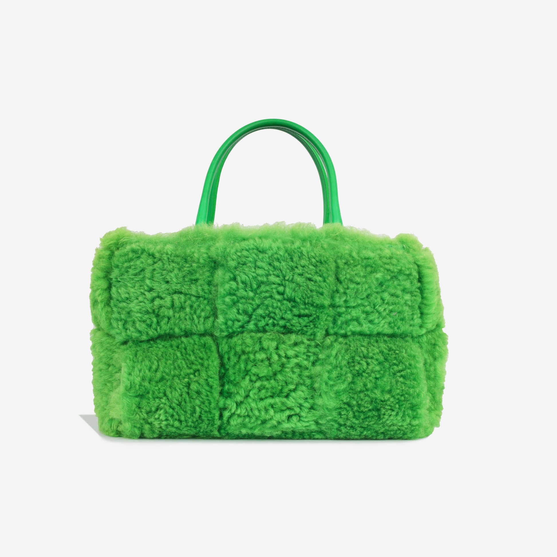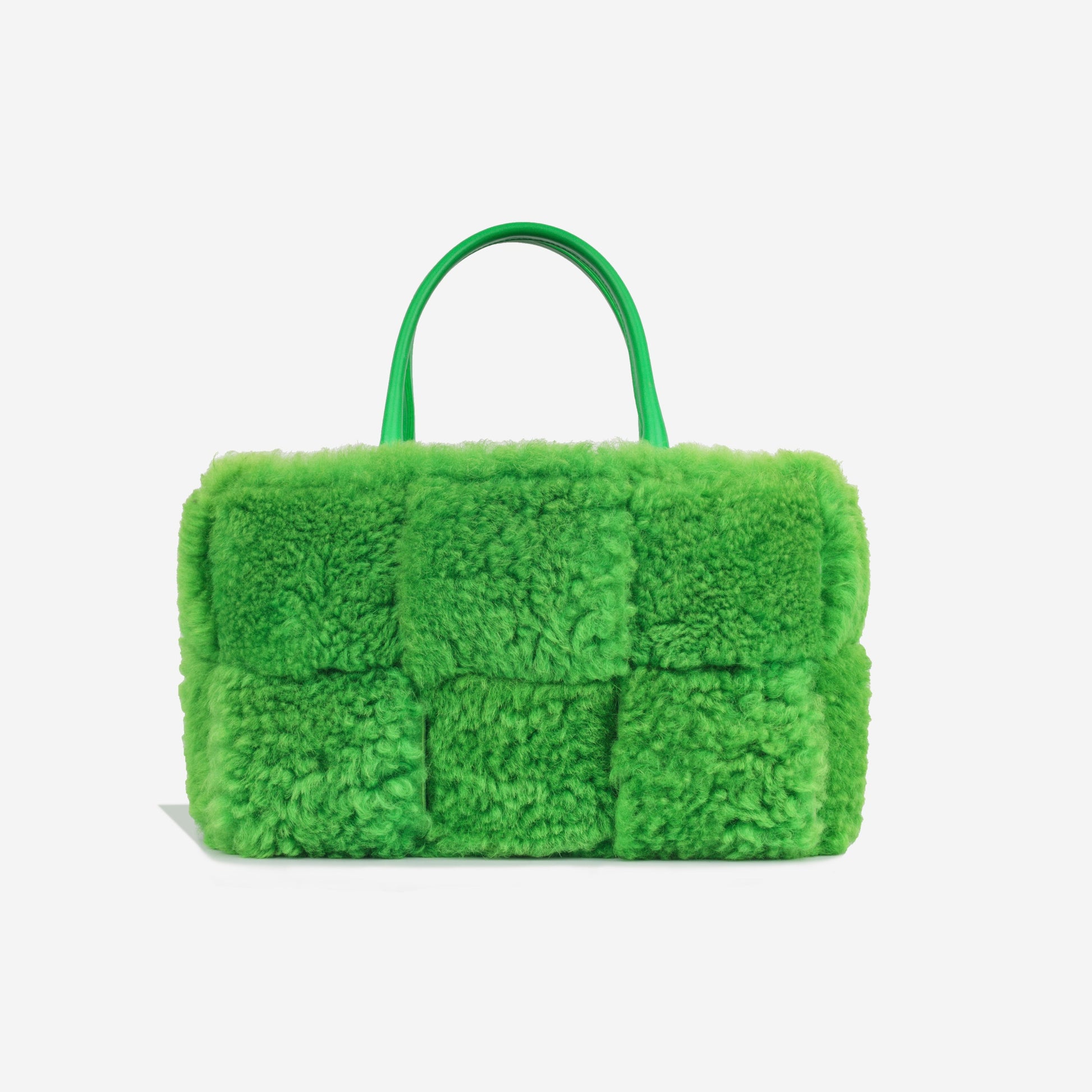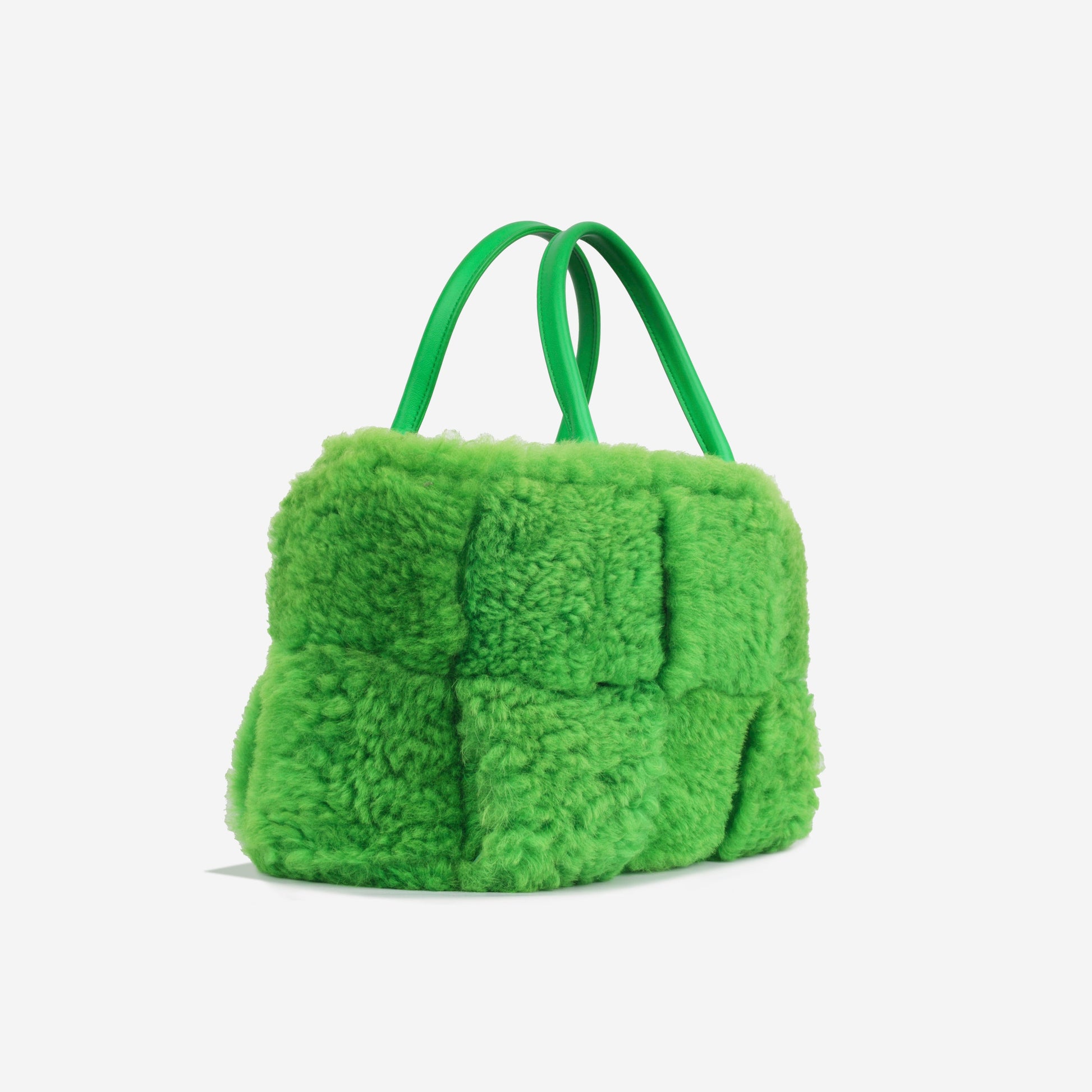 Experience luxury reimagined with the Bottega Veneta Green Shearling Arco Tote. Crafted from green shearling, this modern masterpiece features the signature Intrecciato weave, Italian craftsmanship, and thoughtful design. With curved handles and an internal pouch for organization, it's both a fashion statement and a functional accessory. Elevate your style with Bottega Veneta's contemporary elegance.
