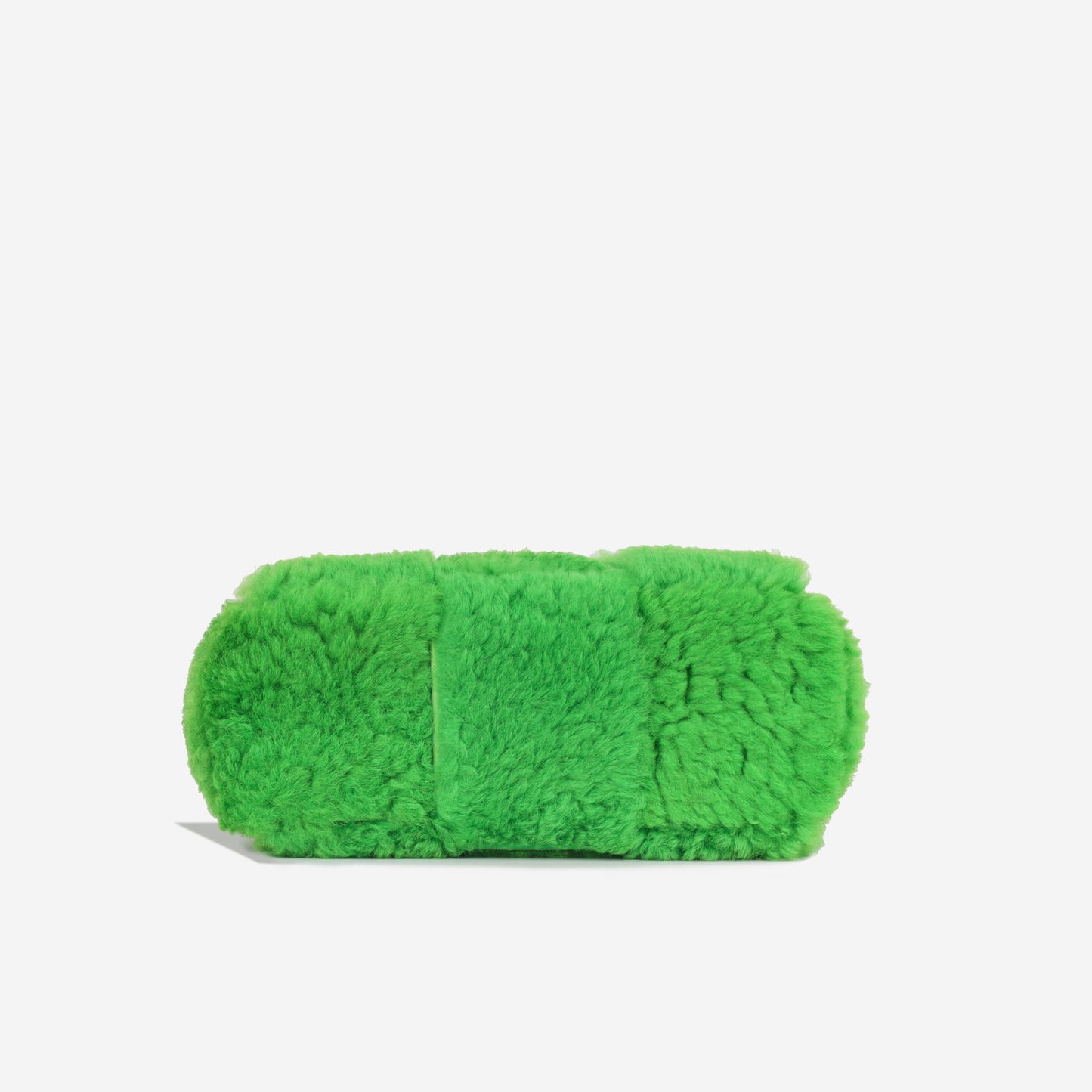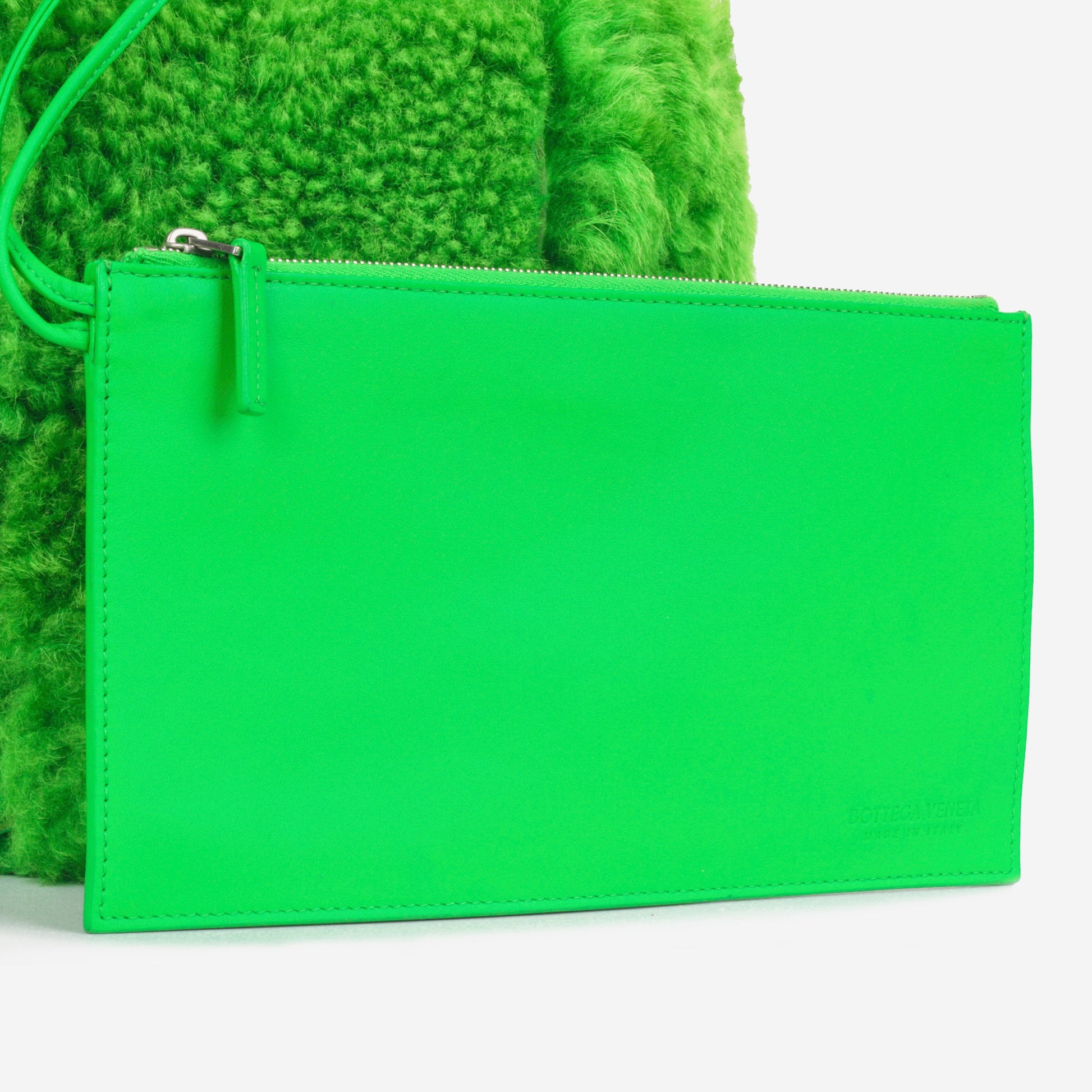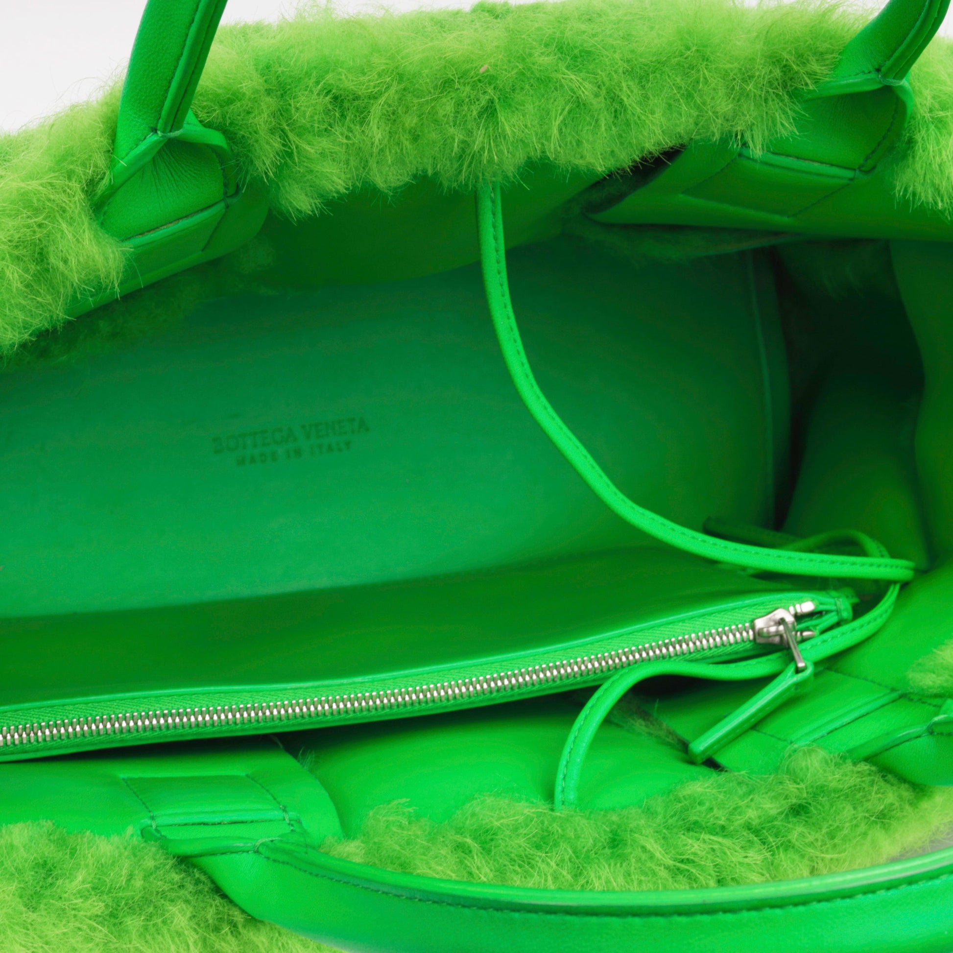 Experience luxury reimagined with the Bottega Veneta Green Shearling Arco Tote. Crafted from green shearling, this modern masterpiece features the signature Intrecciato weave, Italian craftsmanship, and thoughtful design. With curved handles and an internal pouch for organization, it's both a fashion statement and a functional accessory. Elevate your style with Bottega Veneta's contemporary elegance.