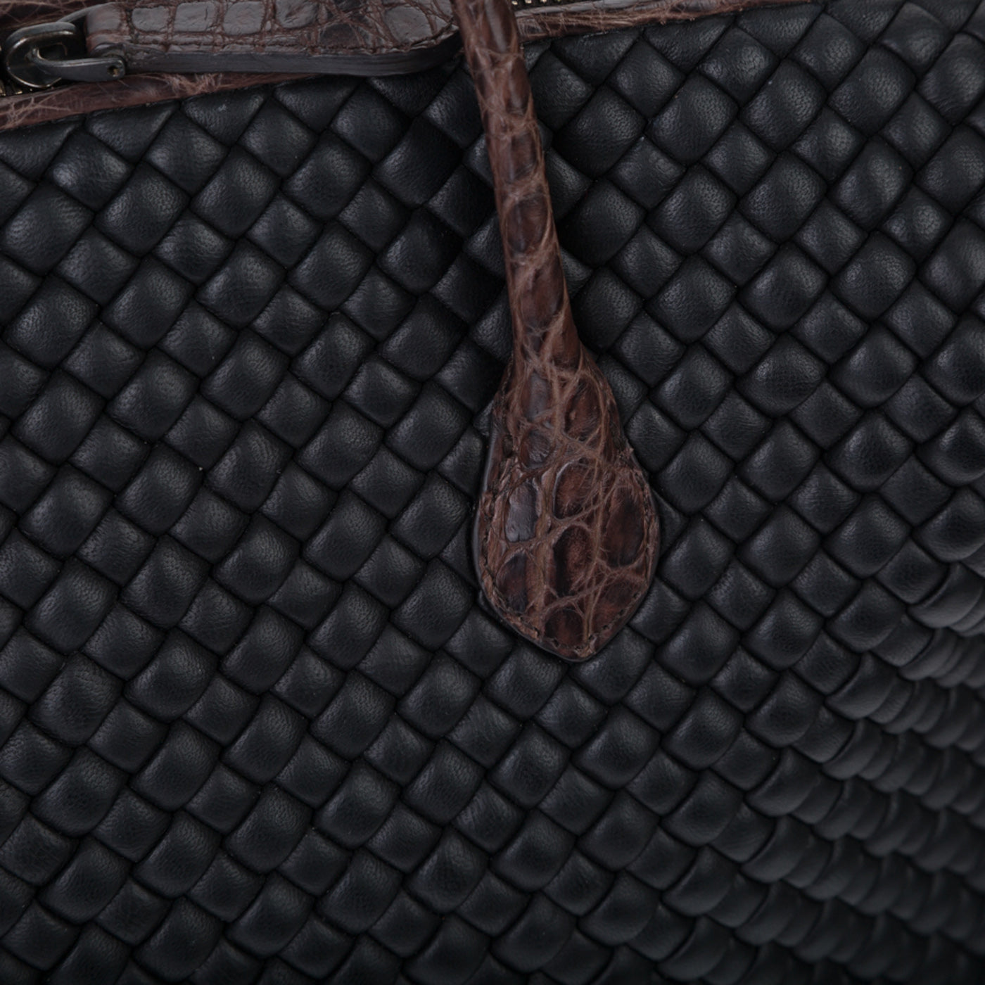 Carefully crafted from black, bubbled leather featuring dark brown, crocodile embossed leather handles and trimming, this briefcase from Bottega Veneta is the perfect work option for any business man or woman. Comfortably carry your laptop and notebooks inside the slim, but still spacious, interior compartment. The discreet, understated appearance of this bag allows you to pair this bag with any work-like attire. A truly luxurious piece that exudes timeless sophistication and class.