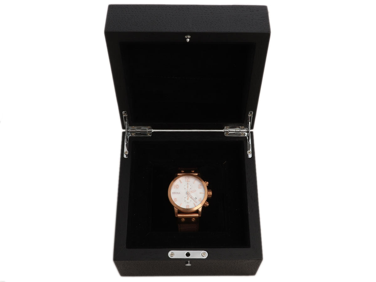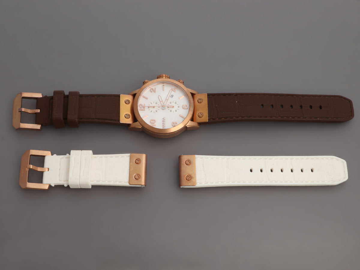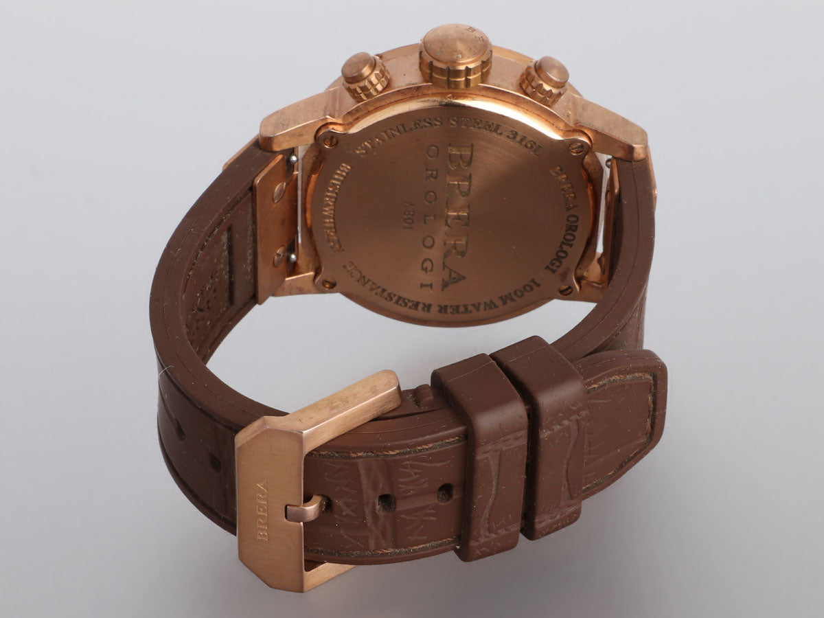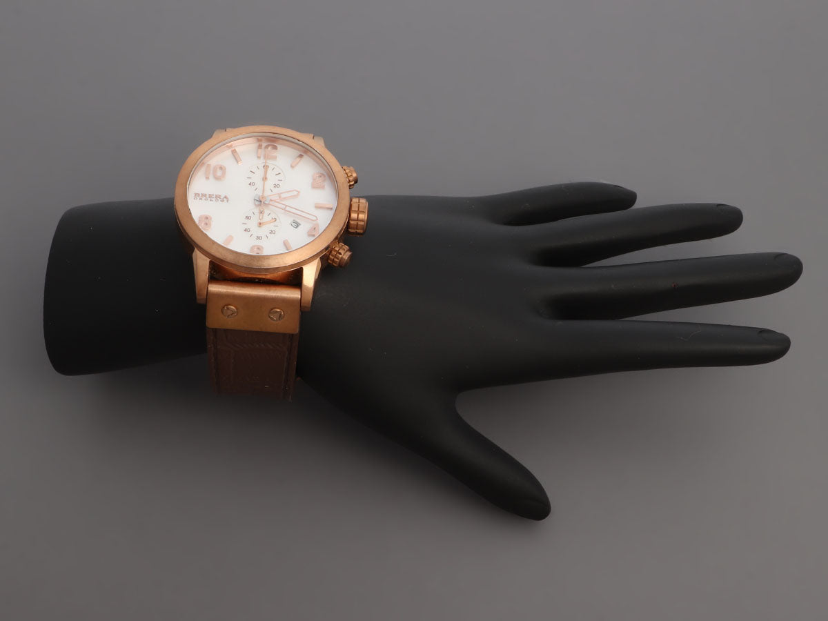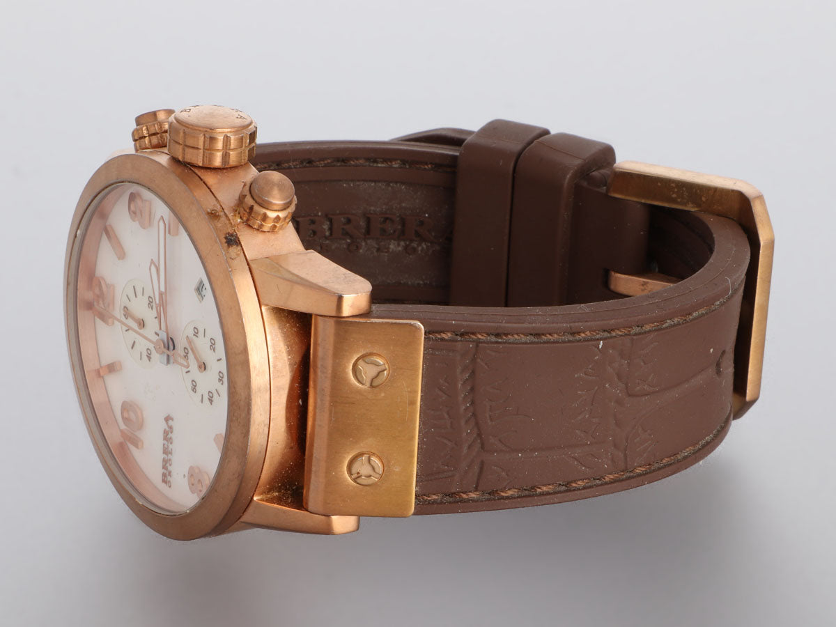 Brera Orologi is an Italian luxury watchmaker and this 43mm chronograph from the Isabella collection delivers a big look! It’s made of rose-gold plated stainless steel with a mother of pearl face, rose gold Arabic numerals, two sub dials, and a date window at the 4 o’clock position, and secures on the wrist with a brown embossed-rubber strap whose size can be adjusted. In very good condition, it comes with a box, booklet, and an additional white-leather strap and has marks on the metal and a tiny chip on the crystal. This is a unisex watch that you just might find hard sharing!
