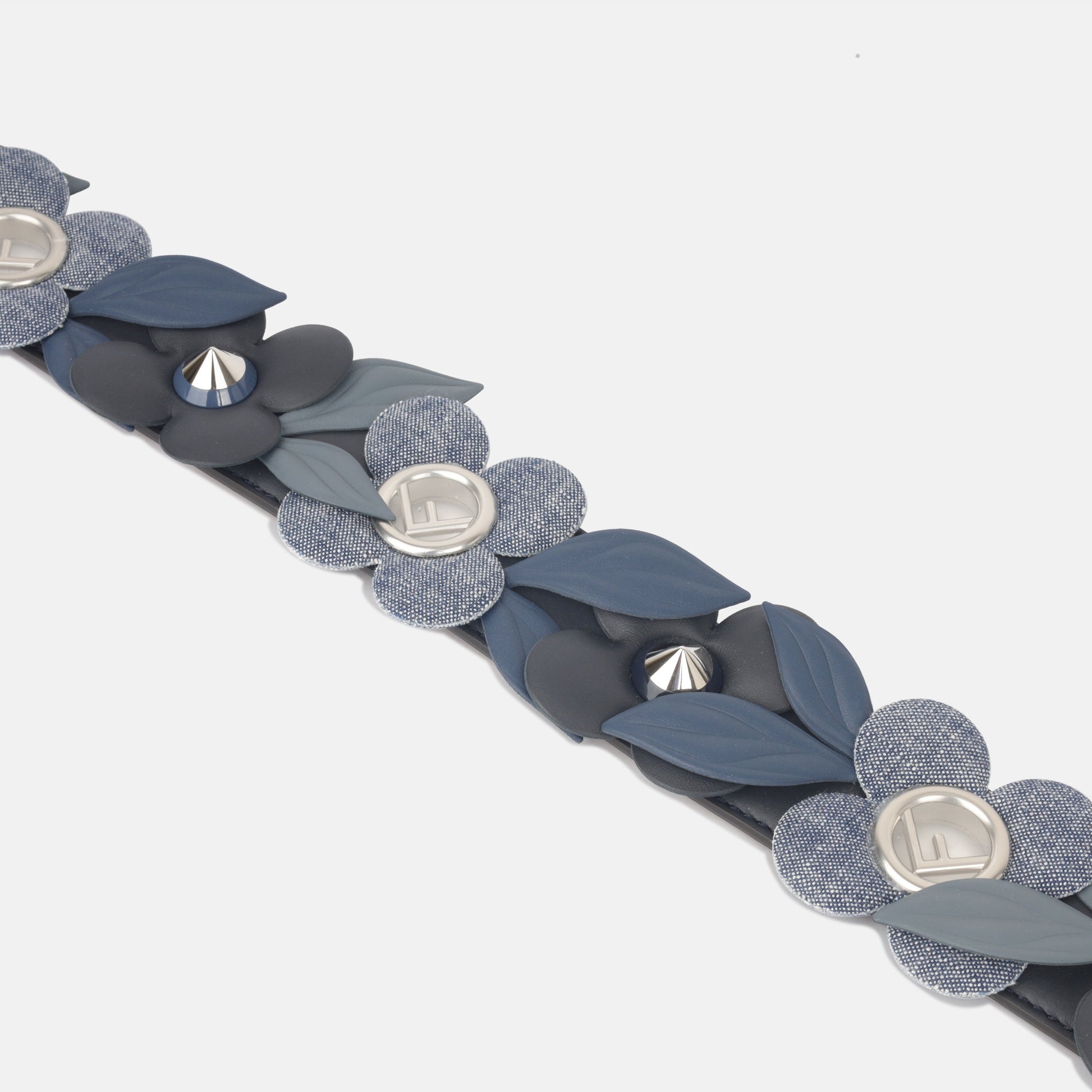 For someone that likes to customise their bags, a detachable strap is a perfect piece to switch things up. This delicate strap is a floral design created with denim and a leather blend, with silver hardware details.