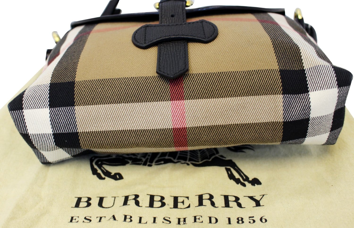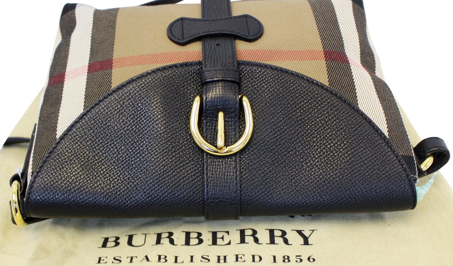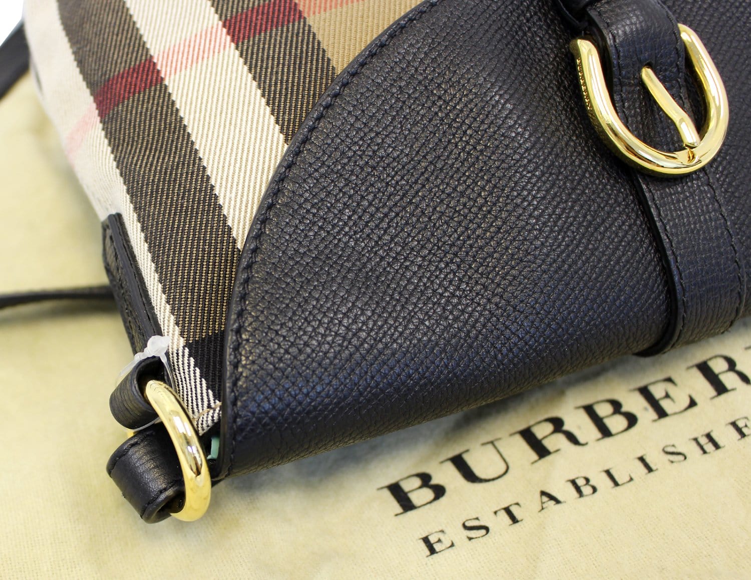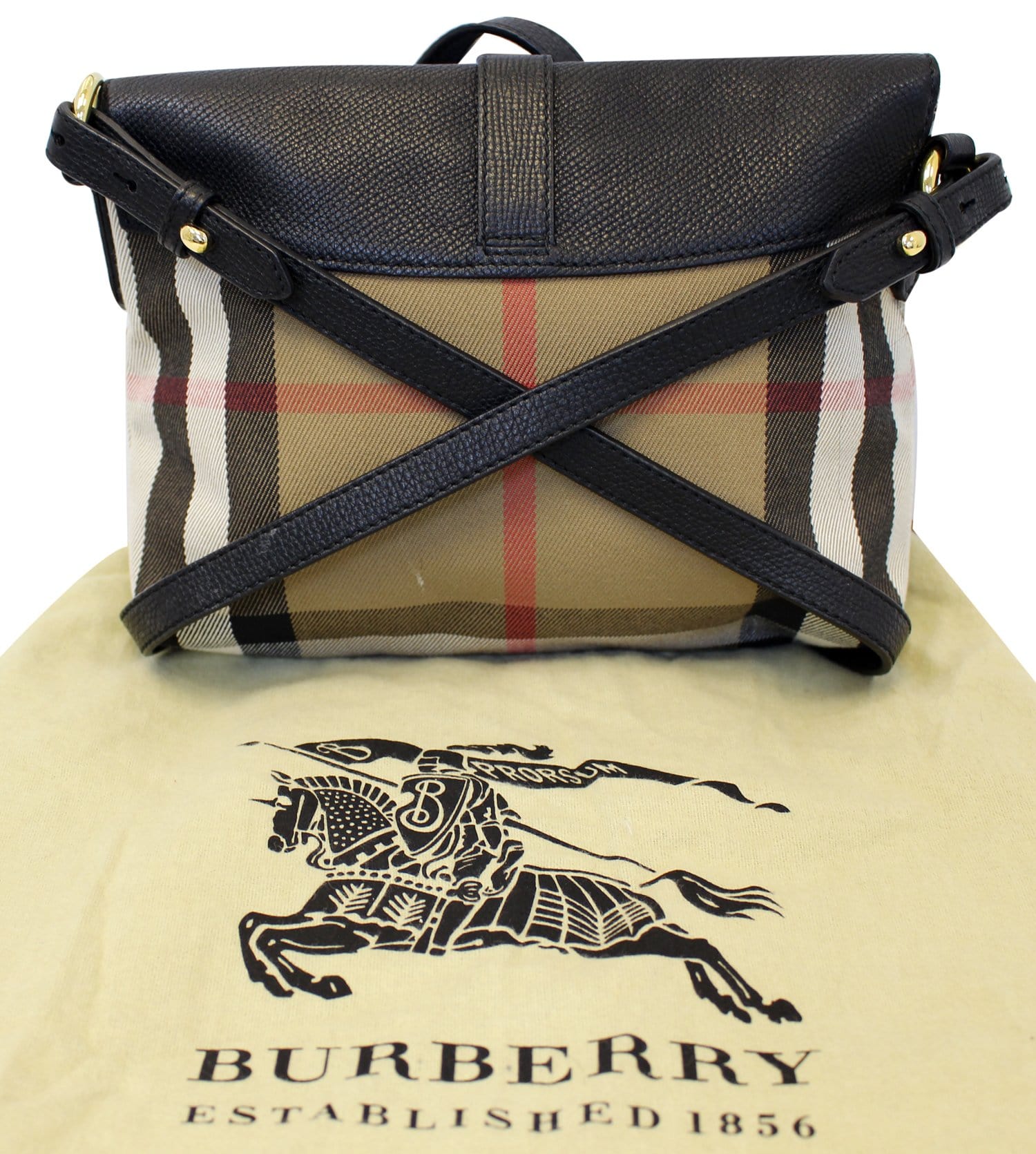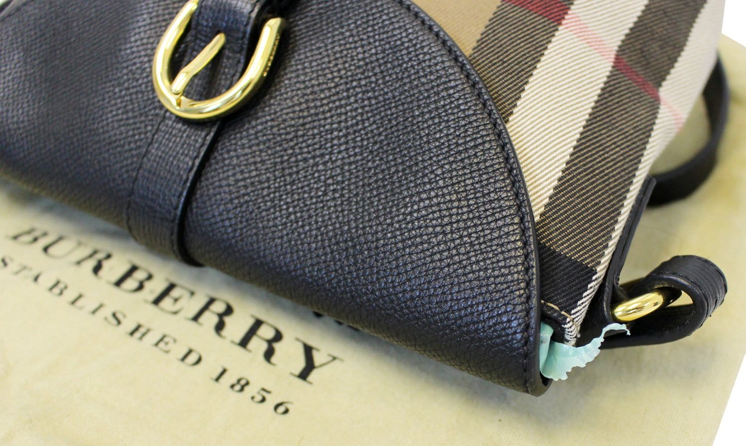 This adorable mini bag features Black colored leather trim with iconic House Check. Wear it as a Crossbody with the adjustable strap or remove it for a casual clutch look.