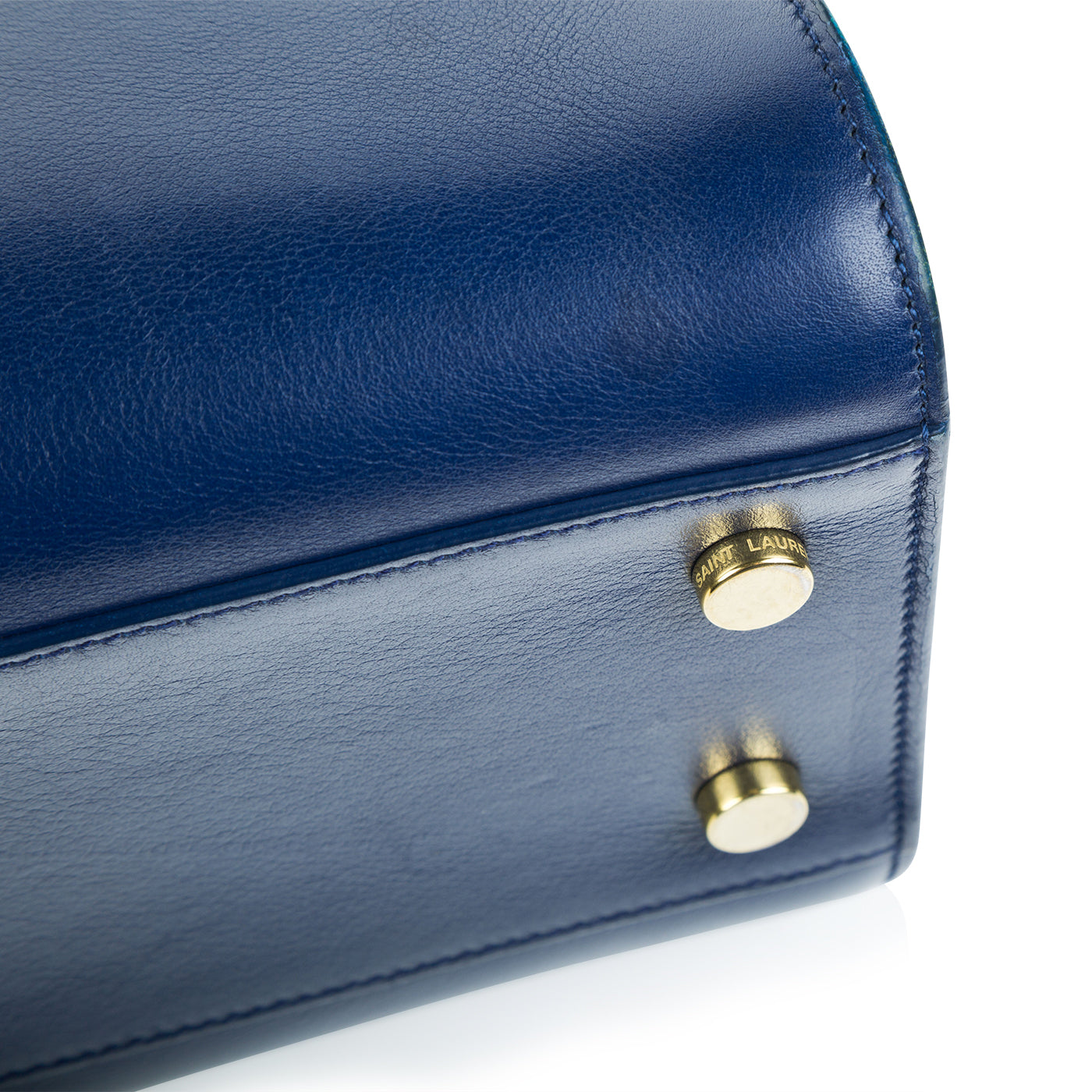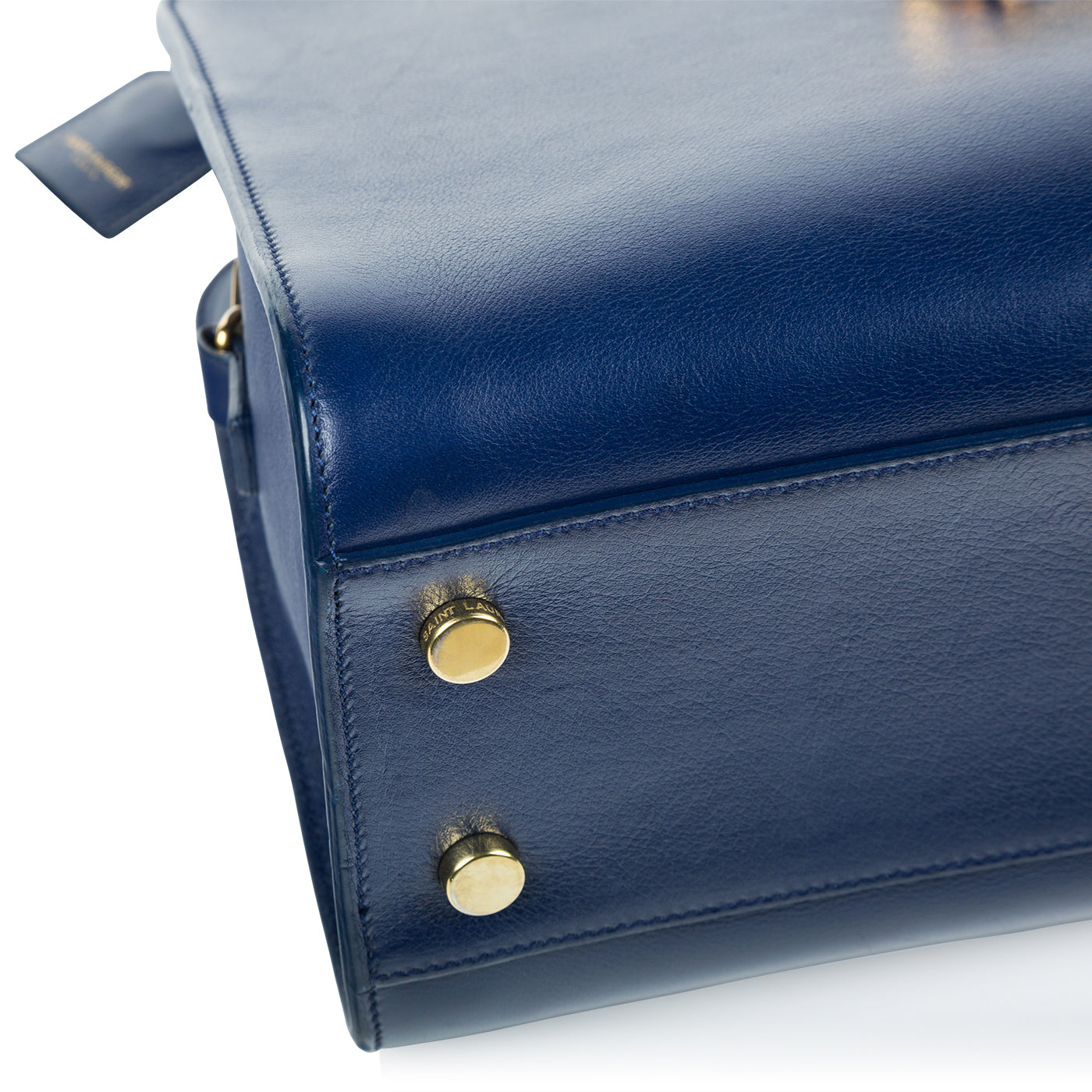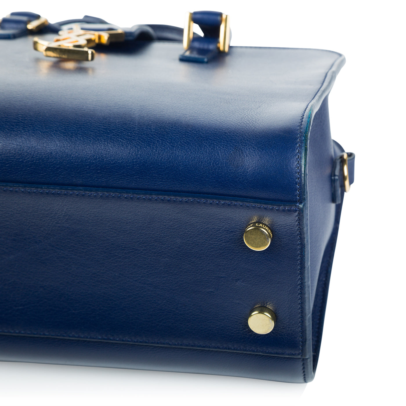 Carefully crafted from smooth leather, the Saint Laurent Cabas Baby tote is unquestionably a timeless handbag. With its elegant silhouette and midnight blue leather, the handbag radiates youthfulness and elegance. The handbag has gorgeous gold-toned hardware and the YSL gold logo plaque. Its interior features a smooth fabric and an array of storage compartments.