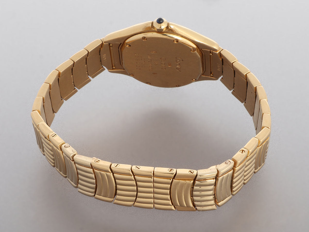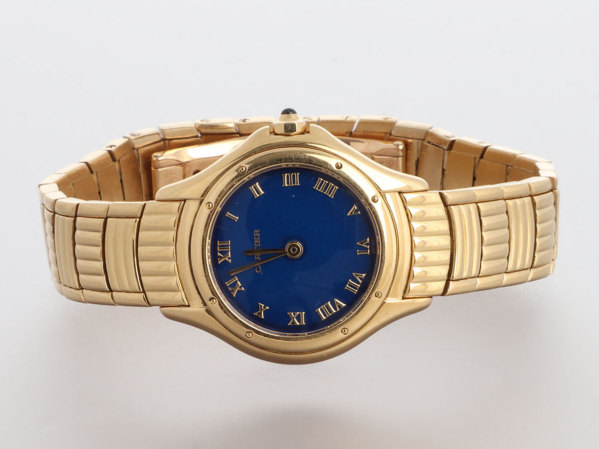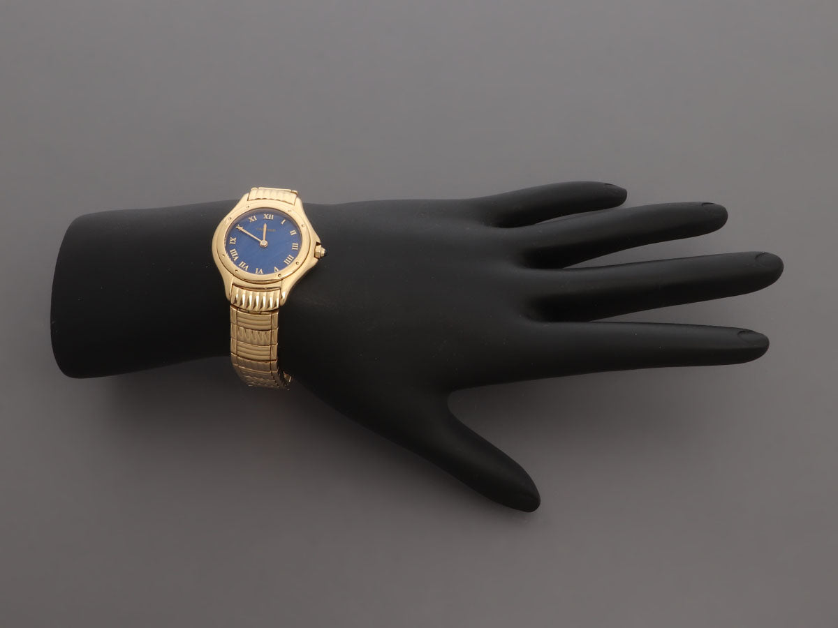 Release your catlike nature every time you wear Cartier’s 18K Yellow Gold Cougar Watch 27! With its round face and striking blue dial, this timepiece won’t be ignored. This Swiss-made quartz watch features Roman numeral hour markers, blue steel hands, and a sapphire winder. In very good condition, it is gently worn and comes with a box and extra links, and secures on the wrist with a deployment clasp!