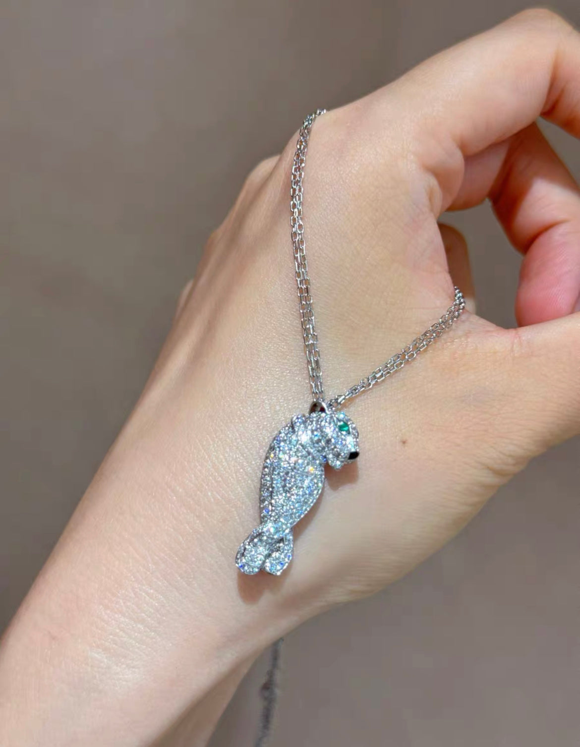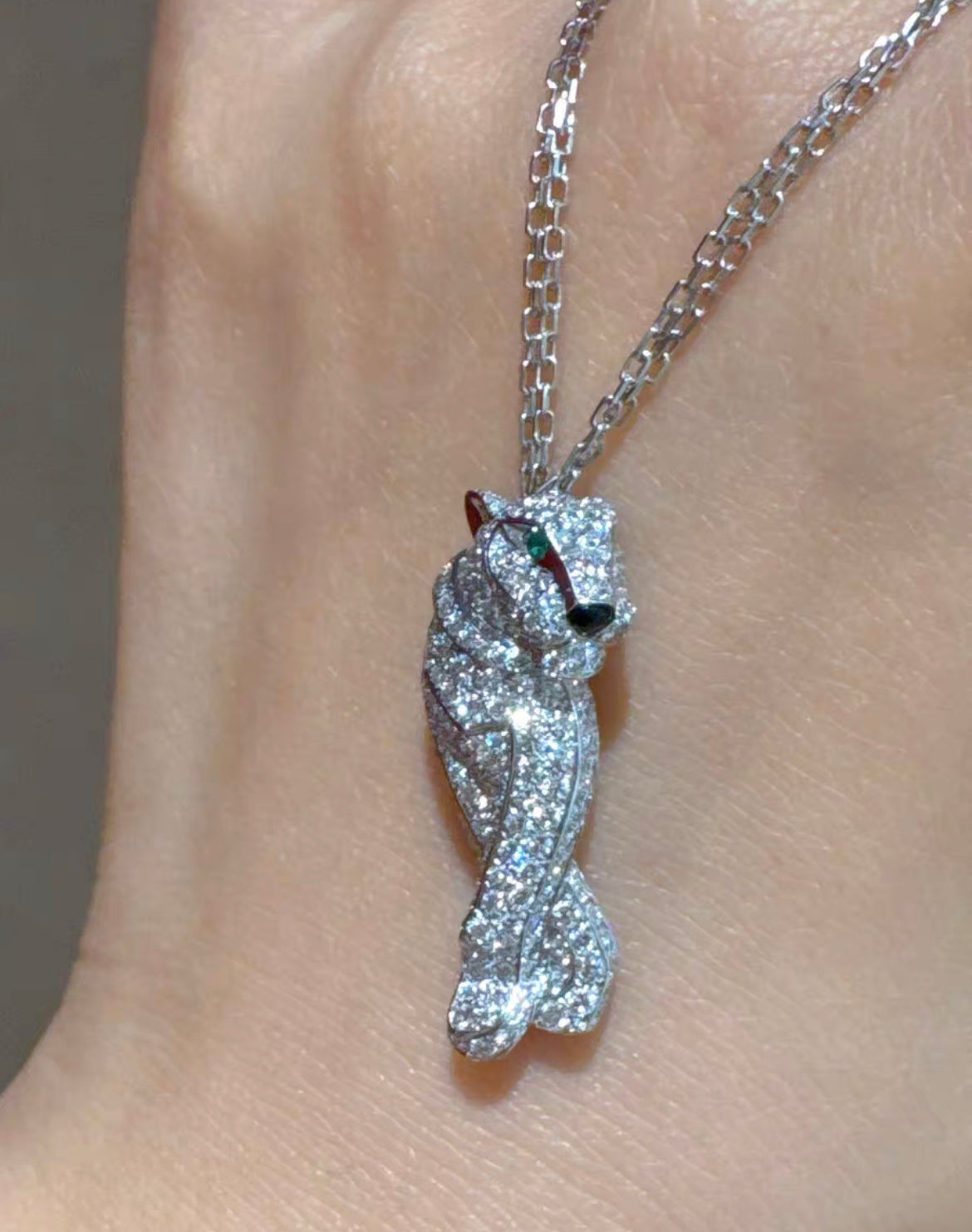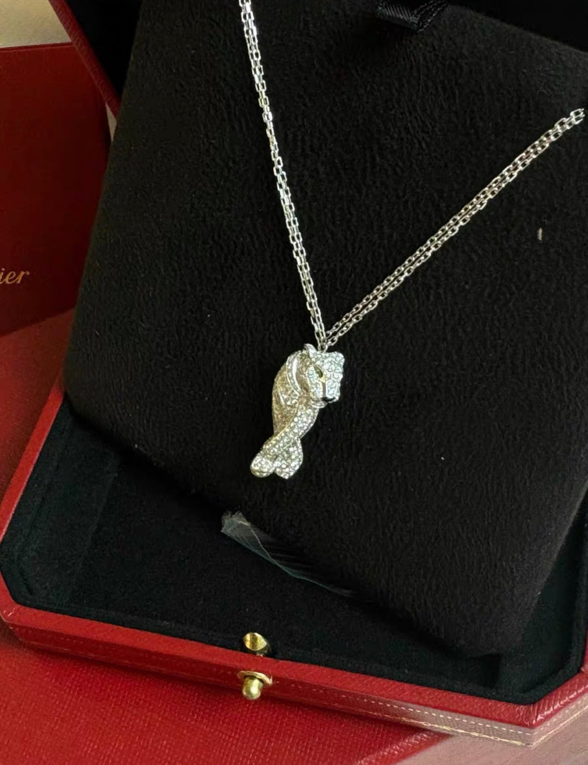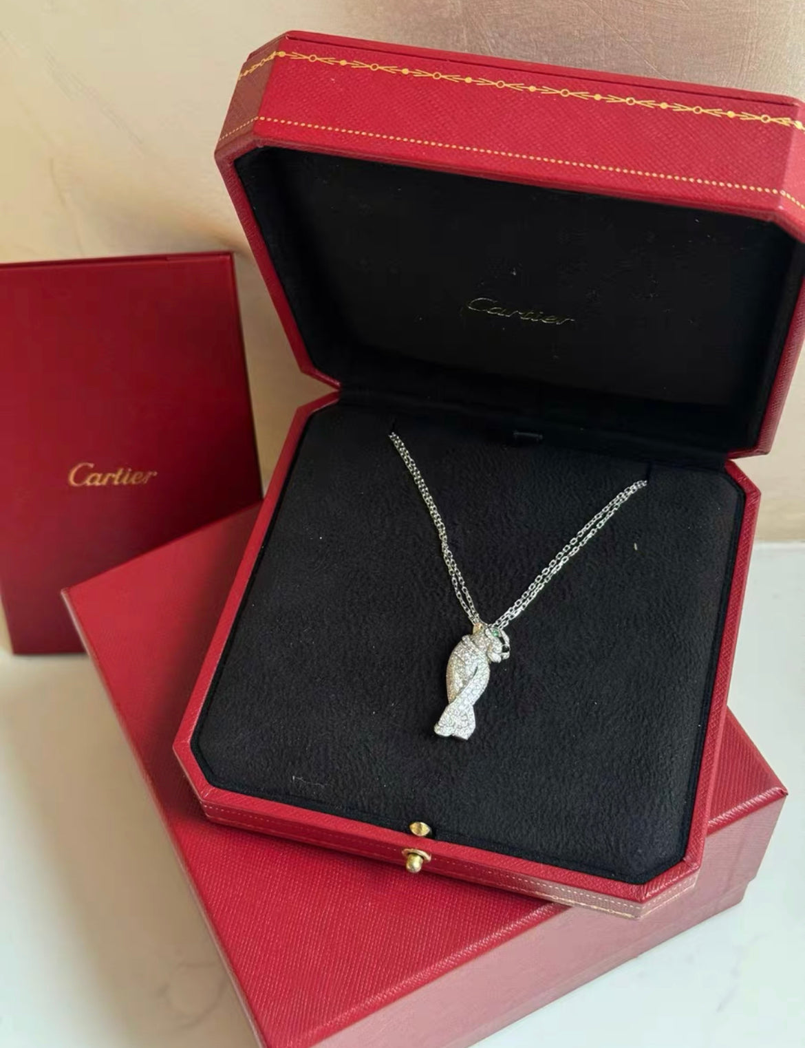 Indulge in a luxury statement piece with the Cartier Panthère de Cartier Diamond Necklace. This exquisite necklace from the renowned Panthère de Cartier collection boasts a total of 233 round brilliant cut diamonds, with a total weight of 1.03ct. Set in 18k white gold, the Panthère design is accented by two round cut emeralds and black lacquer. With a chain length of 41cm and a pendant size of 2.5cm x 1.2cm, this necklace is a striking addition to any outfit. Complete with Cartier Box.