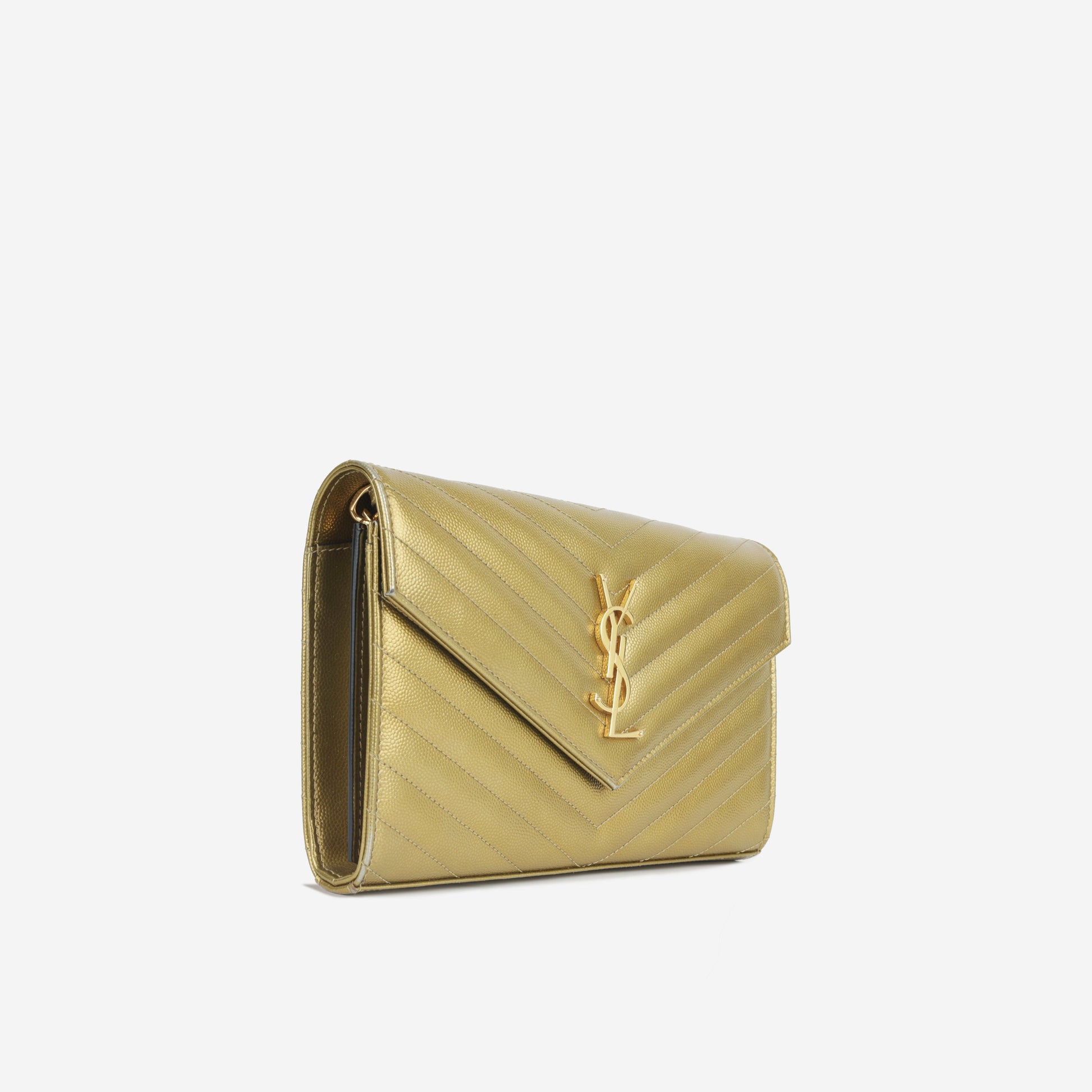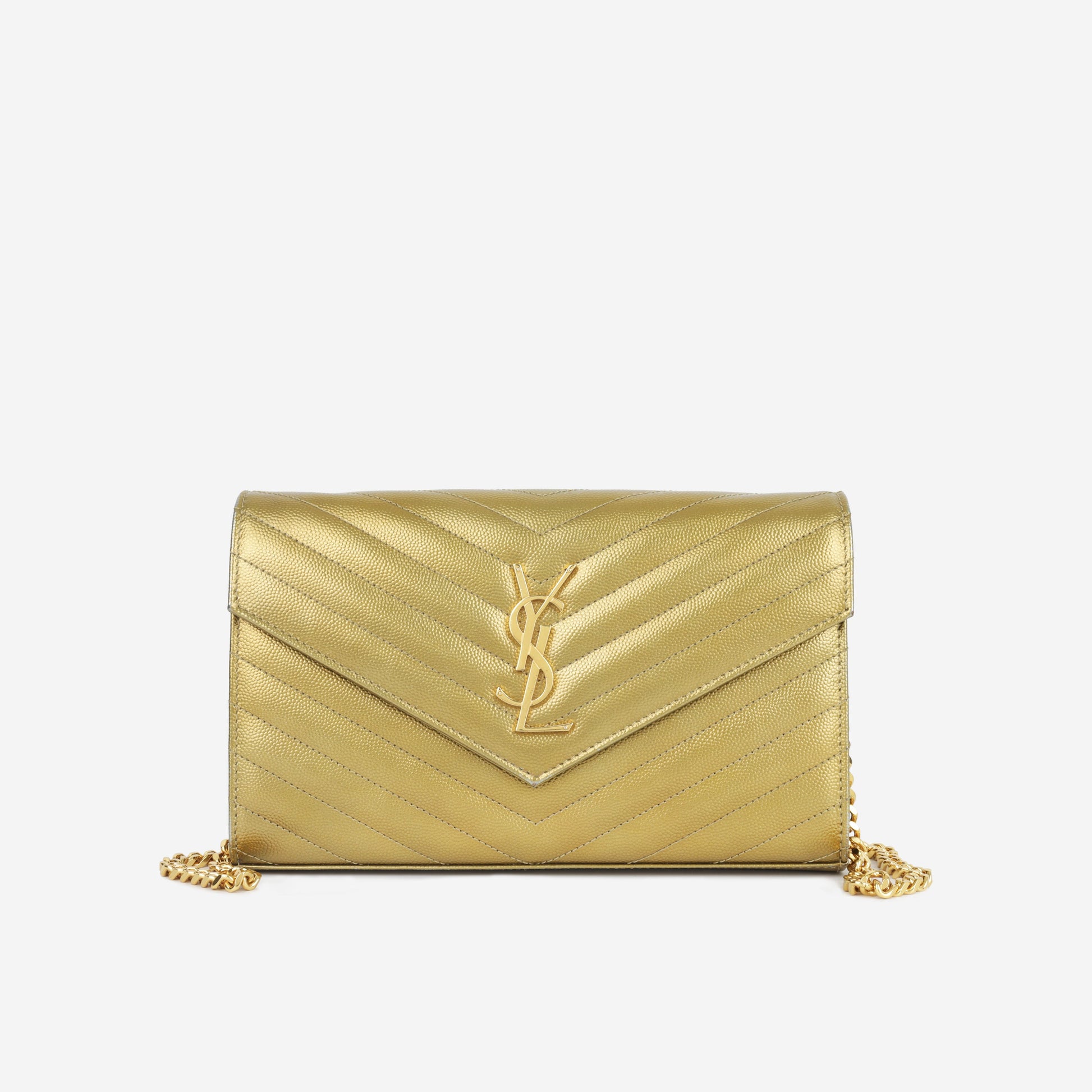 A classic piece from Saint Laurent, the Cassandre wallet-on-chain is the ideal accessory to compliment any look from day to night. Carefully crafted from grained, gold calfskin leather with a matelassé design, featuring a delicate gold chain and prominent YSL logo - this bag is suitable for any occasion.