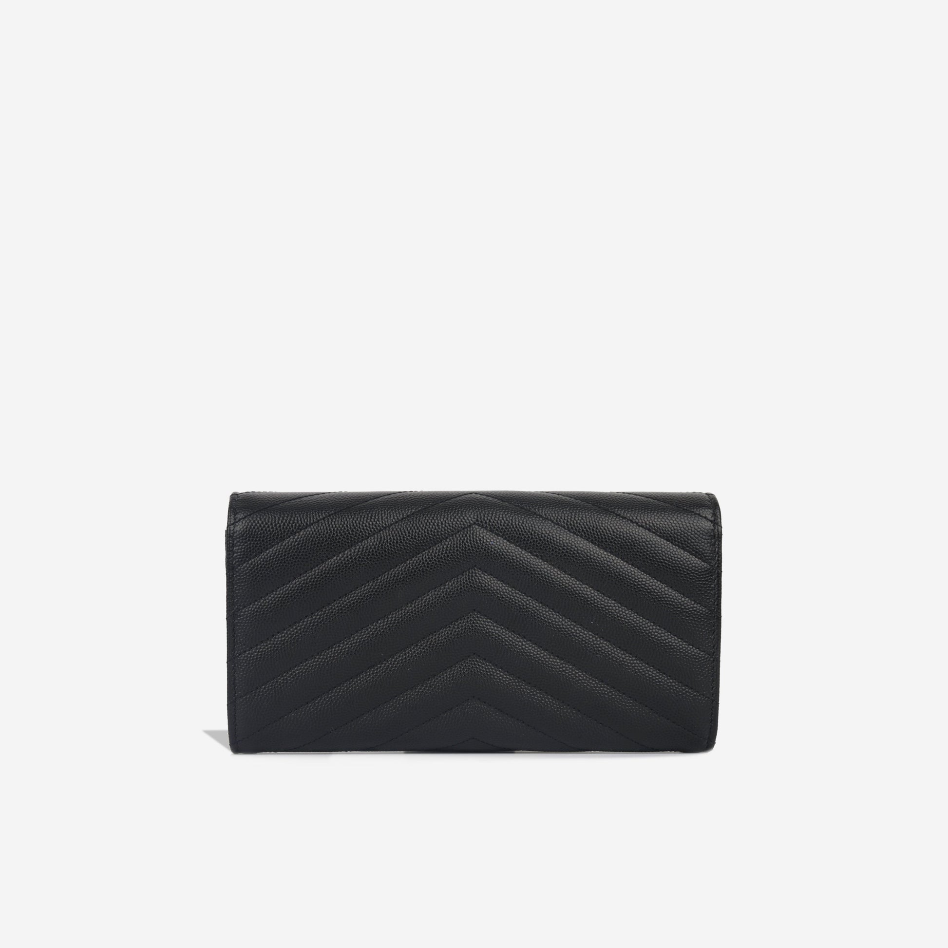 Elevate your accessory collection with Saint Laurent's black continental wallet, a refined piece adorned with the iconic YSL monogram in gold—a hallmark designed by Adolphe Mouron Cassandre in 1961. Expertly crafted in Italy from grained chevron-quilted leather, this wallet combines luxury with practicality. The interior features a thoughtfully designed layout with multiple card slots and pockets, providing seamless organization for your essentials. Embrace the timeless elegance of Saint Laurent with this meticulously crafted continental wallet, a perfect blend of iconic design and functional sophistication.
