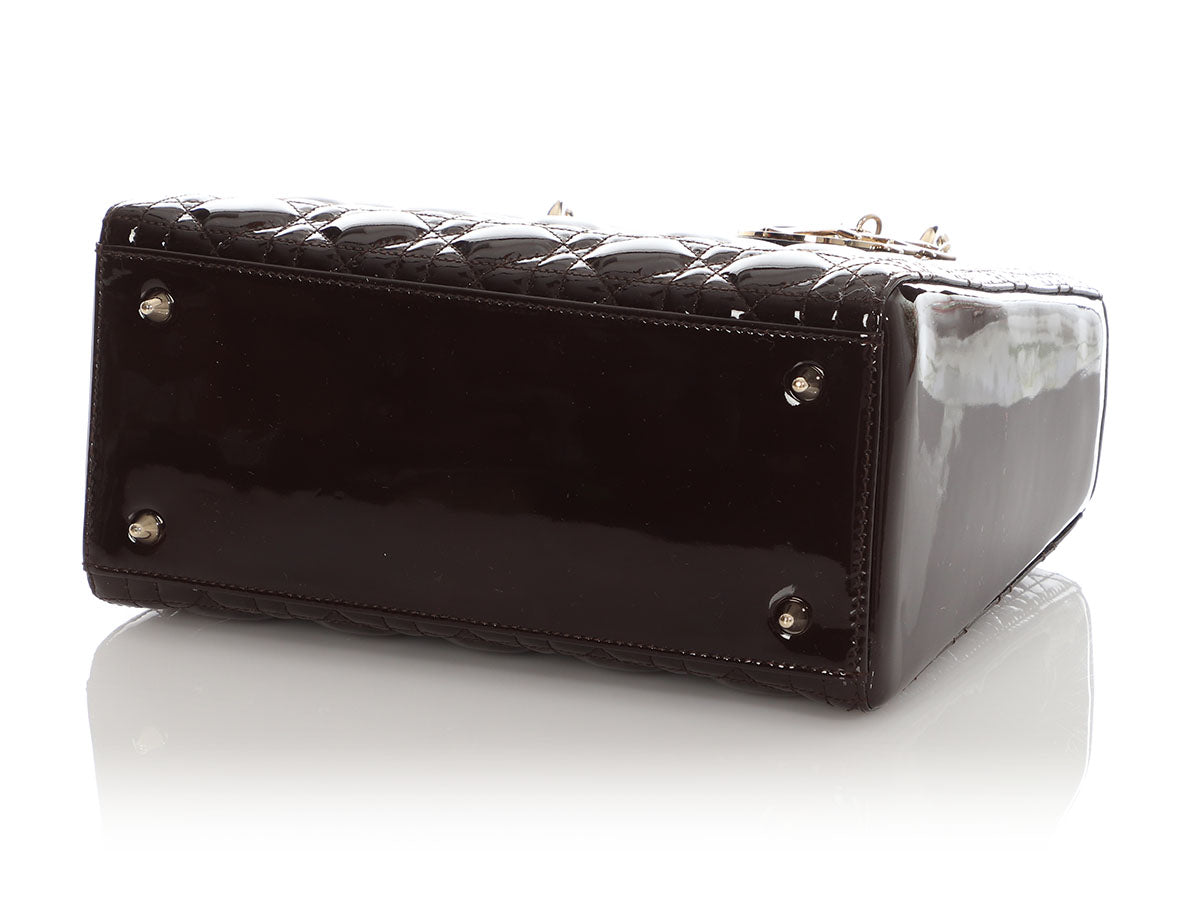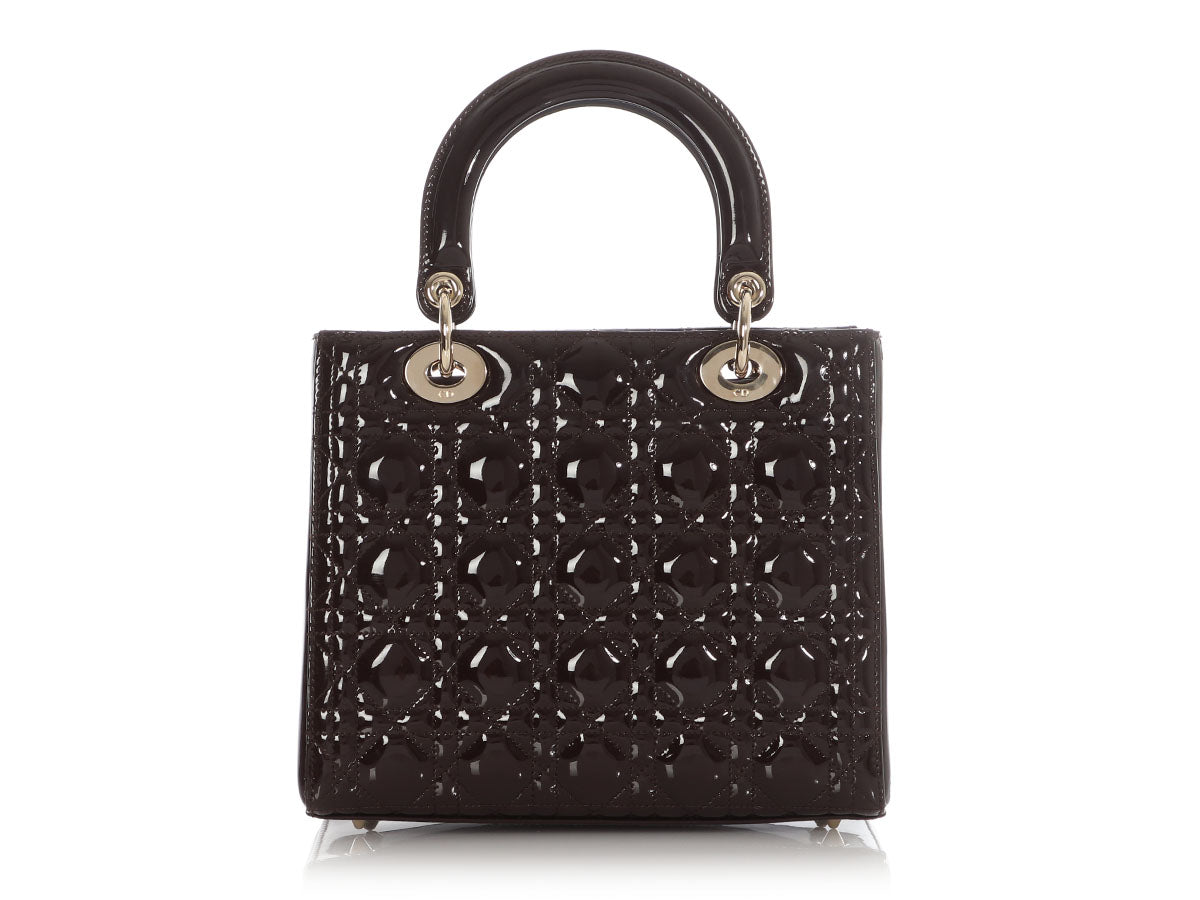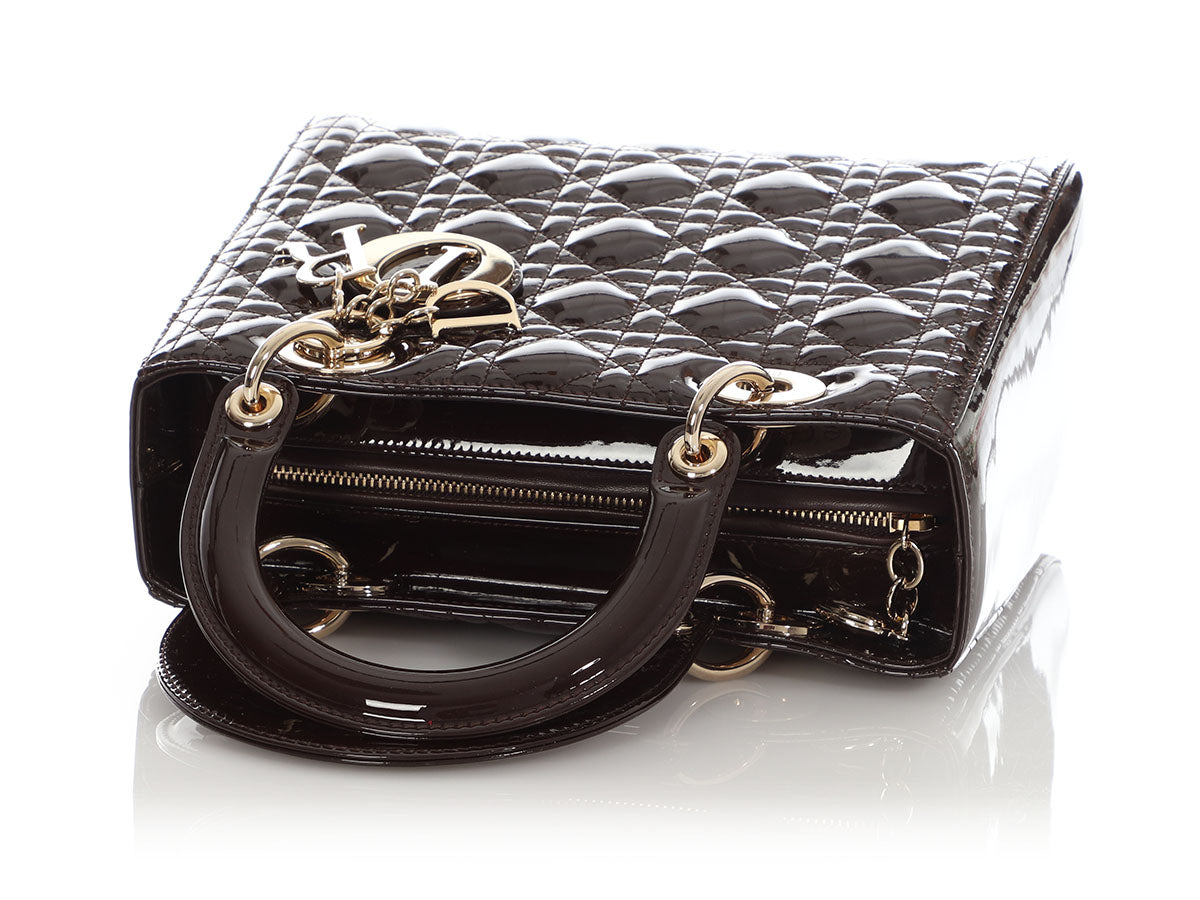With its cannage quilting and glossy sheen, Dior’s Small Brown Patent Lady Dior is a ladylike bag for day or evening! Made of very dark-brown patent leather with light-gold hardware, it has dual handles with a 4-inch drop and a detachable patent shoulder strap with a 17.5-inch drop. The top unzips to reveal black-fabric lining with one zipped pocket inside. In great condition with a dustbag, box, and cards, it has light scratches on the hardware and a few small marks on the patent. The letter charms hanging down in front let you know this beauty is from Dior!