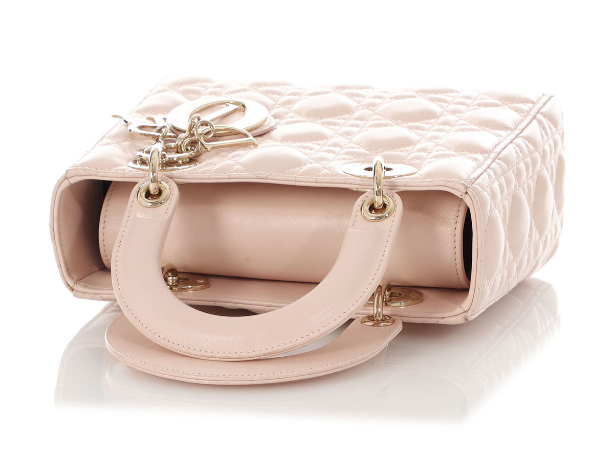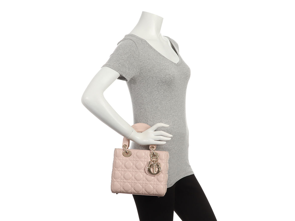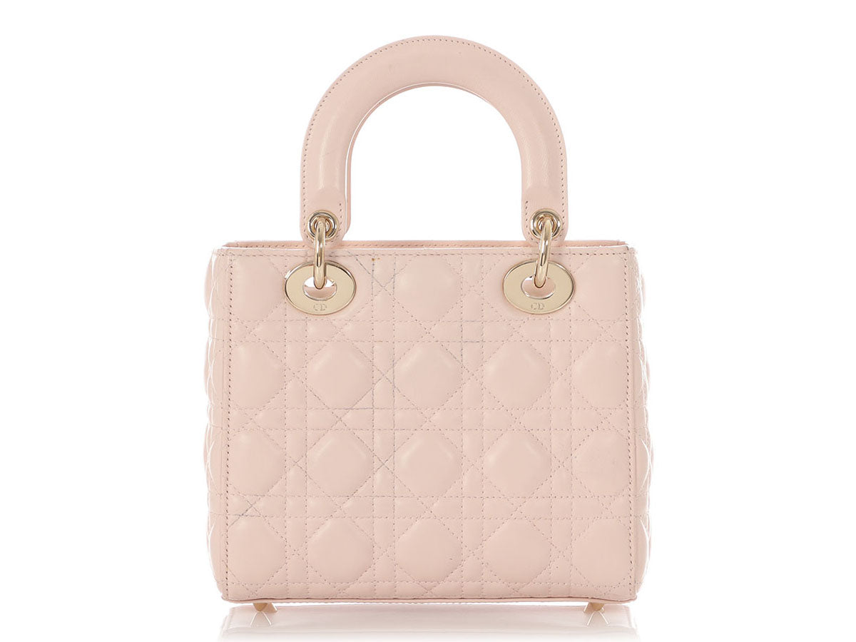 Dior’s Small Pink Lambskin Lady Dior is sweet and petite! Made of cannage-quilted light-pink lamb leather, it has rounded top handles with gold letter charms and a 3.25-inch drop. A wide internal flap tucks in to secure the top and inside you'll find dark gray cannage fabric lining with one zipped pocket. In very good condition with a dustbag, box, info book, and card, it has light scratches throughout (most notably on the sides of the flap and bottom), wear on the corners, scratches on the hardware, and a few small marks on the handles. The D-I-O-R letter charms hanging from the handle tell you this blushing beauty is from Dior!