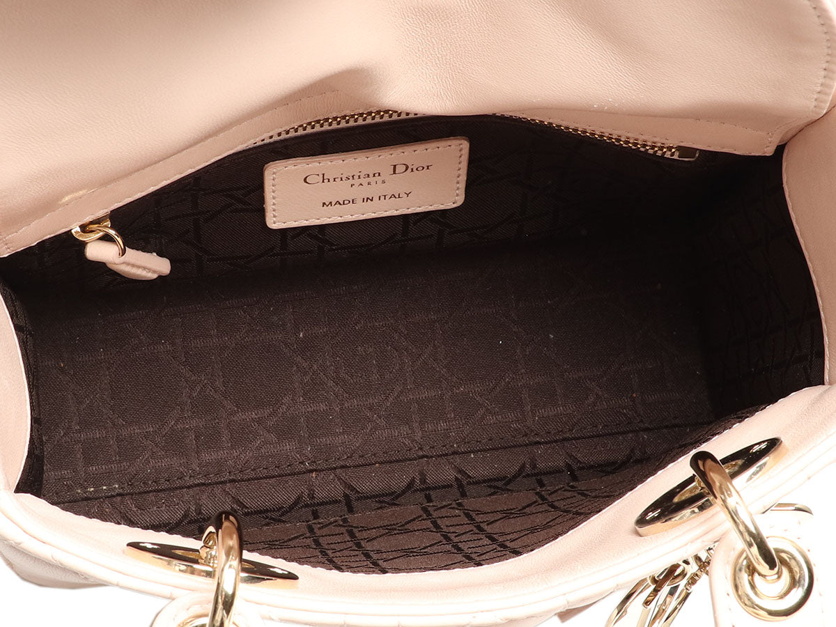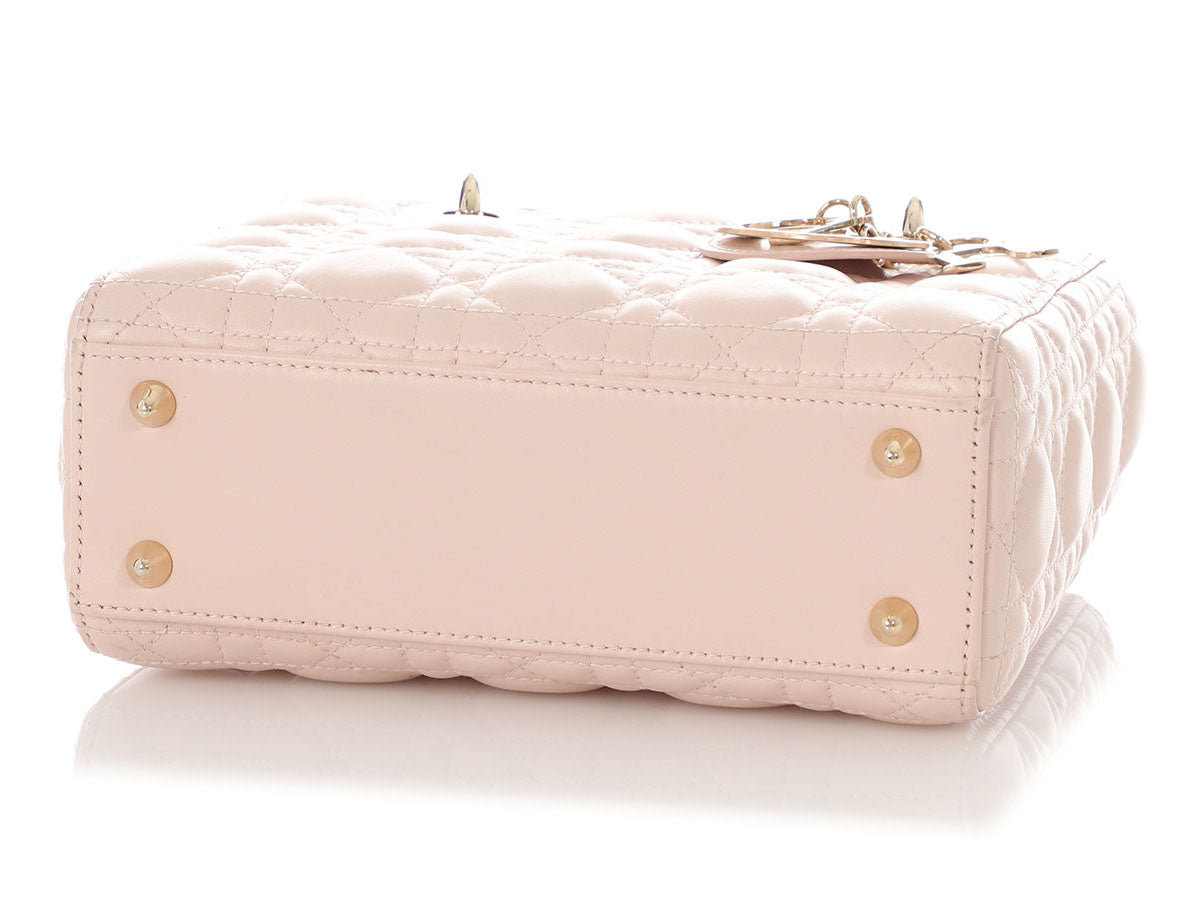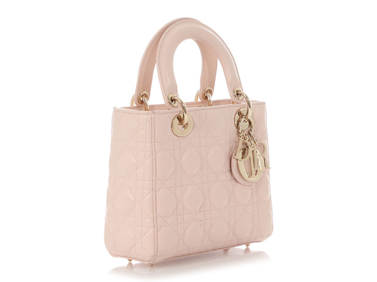 Dior’s Small Pink Lambskin Lady Dior is sweet and petite! Made of cannage-quilted light-pink lamb leather, it has rounded top handles with gold letter charms and a 3.25-inch drop. A wide internal flap tucks in to secure the top and inside you'll find dark gray cannage fabric lining with one zipped pocket. In very good condition with a dustbag, box, info book, and card, it has light scratches throughout (most notably on the sides of the flap and bottom), wear on the corners, scratches on the hardware, and a few small marks on the handles. The D-I-O-R letter charms hanging from the handle tell you this blushing beauty is from Dior!