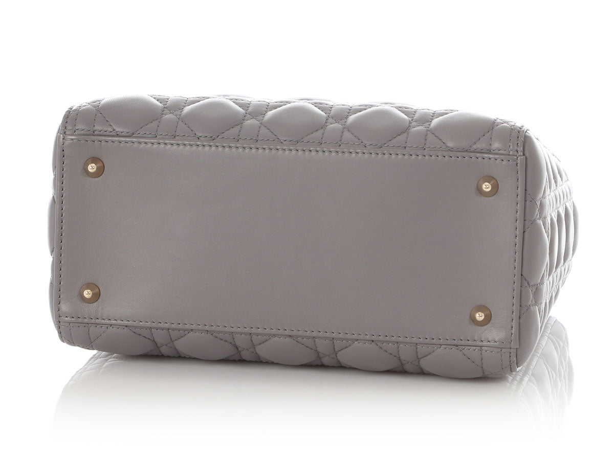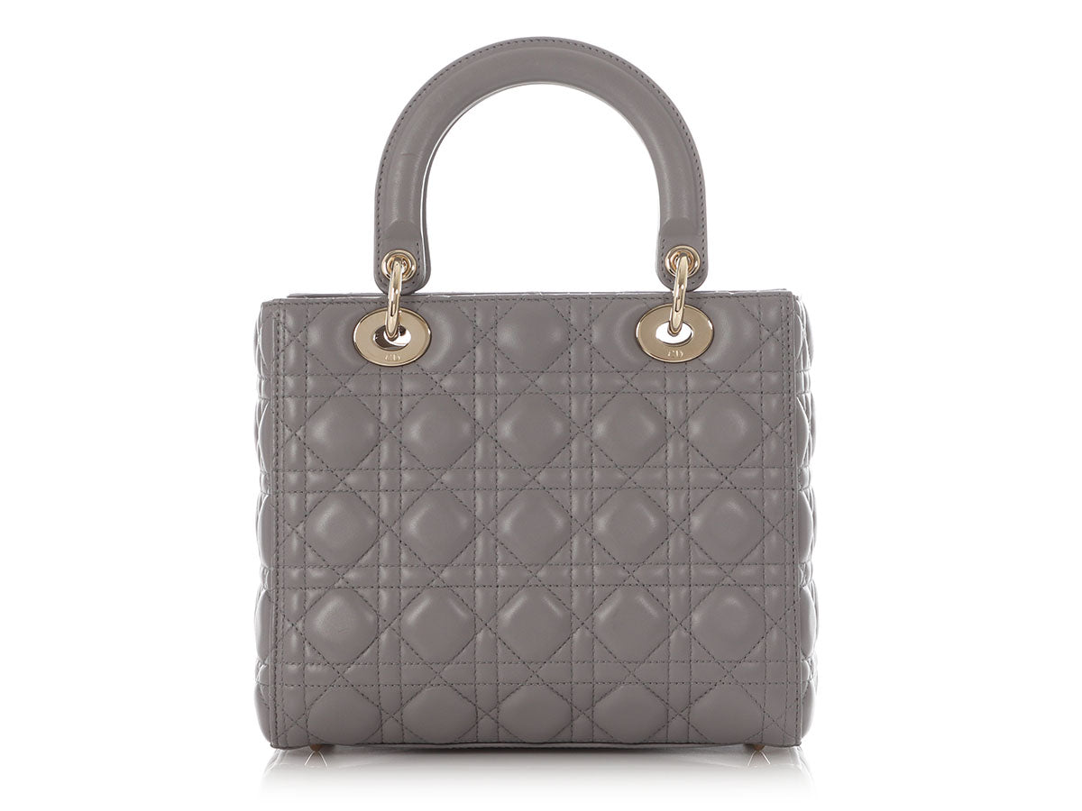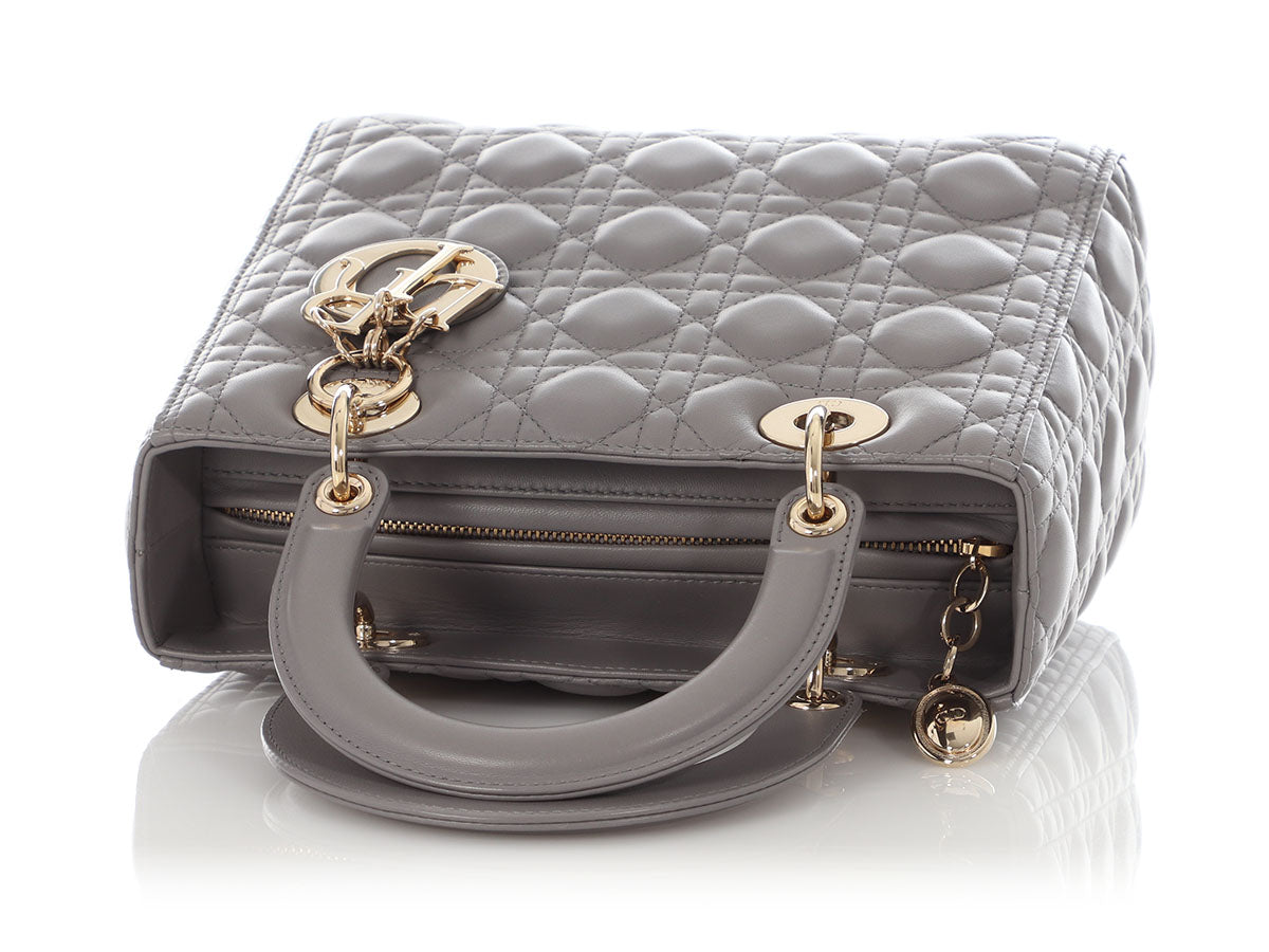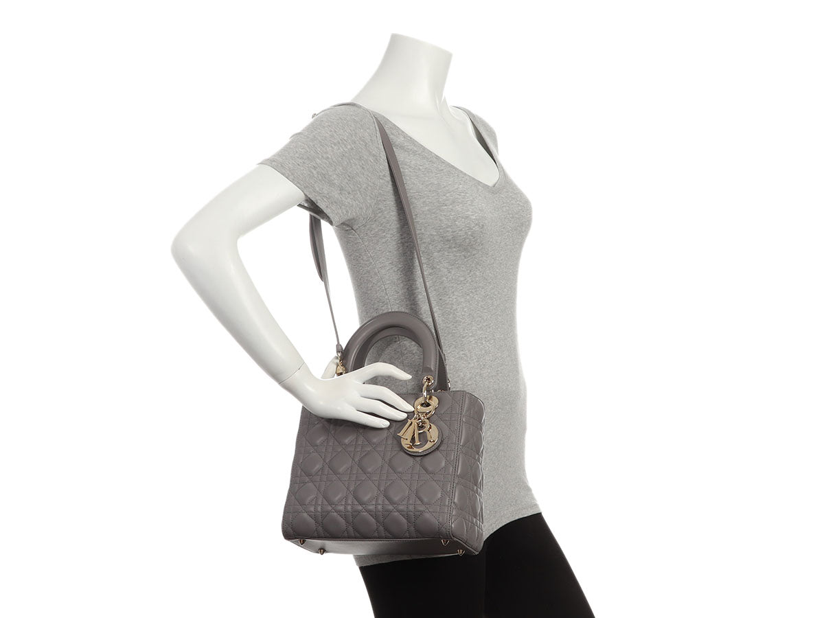 Dior’s Medium Iron Gray Lambskin Lady Dior is a chic and structured top handle with a lovely pairing of neutral gray leather and gold hardware! Made of cannage-quilted leather with gold letter charms dangling from the handles with a 4-inch drop, it unzips to reveal gray cannage-fabric lining with one zipped pocket inside. In great condition with a dustbag, card, and booklet, it has light rubbing on the hardware, rubbing on the top near the zipper, and a few light scratches on the bottom. The adjustable, detachable shoulder strap is shown with a 16.5-inch drop, so this sophisticated lady can transform into a hands-free style!