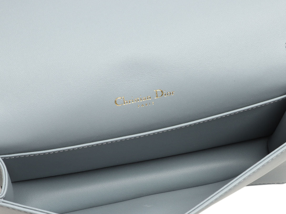 Dior’s Gray Lambskin Lady Dior Pouch With Chain has a 22.75-inch drop on the gold chain strap and dangling D-I-O-R charms, or you can detach it for a stylish clutch! Made of cannage-quilted gray-blue leather, the flap secures with a magnetic snap, opening matching leather inside with one slide pocket down the back wall and two matching inserts—one is a zipped pouch while the other has a slide pocket and eight card slots. In excellent condition with a box, dustbag, and dustbag for the charms and chain, there are light scratches on the charms and a tiny dark mark on the zipped insert. Whether you go hands-free or tuck it under your arm, it’s a sophisticated, ladylike look!