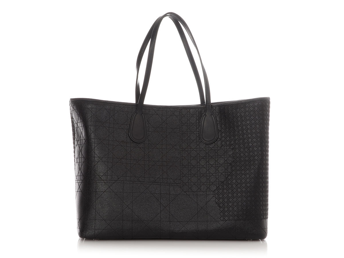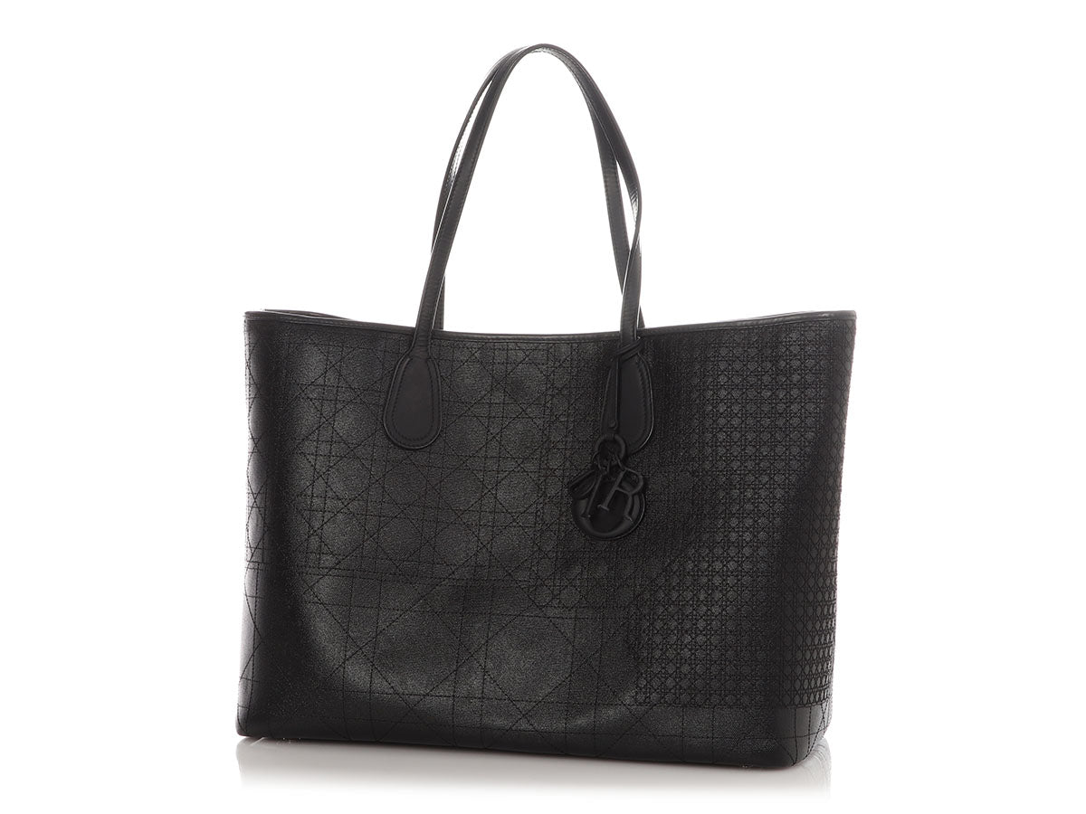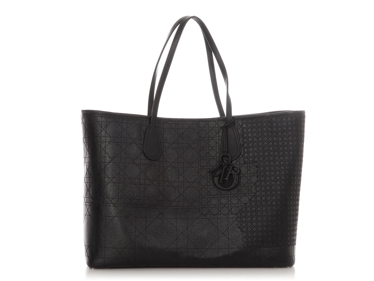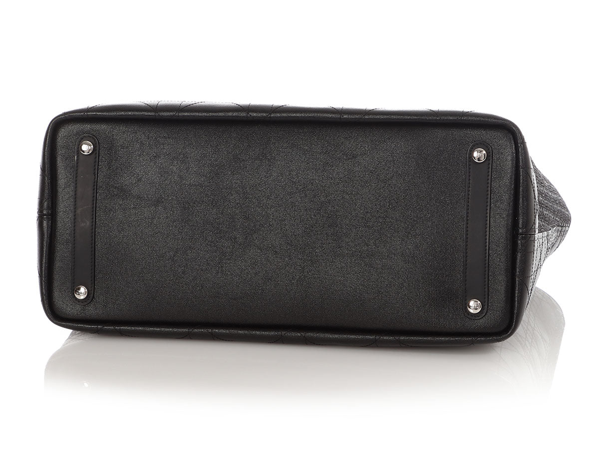 Large enough to fit a laptop along with all your daily essentials, this Dior Black Panarea Tote is a reboot of an older style! Made of black coated canvas with micro, mini, and regular cannage quilting, it has black leather shoulder straps with an 8.25-inch drop. The top secures with a magnetic snap and inside you’ll find a pink-fabric-lined interior with one zipped and two slide pockets. In pristine condition with a dustbag and cards, it has some white marks on the letter charms, although I don’t think it has been carried. Previous versions of this bag had metallic charms—this one has cool black charms!