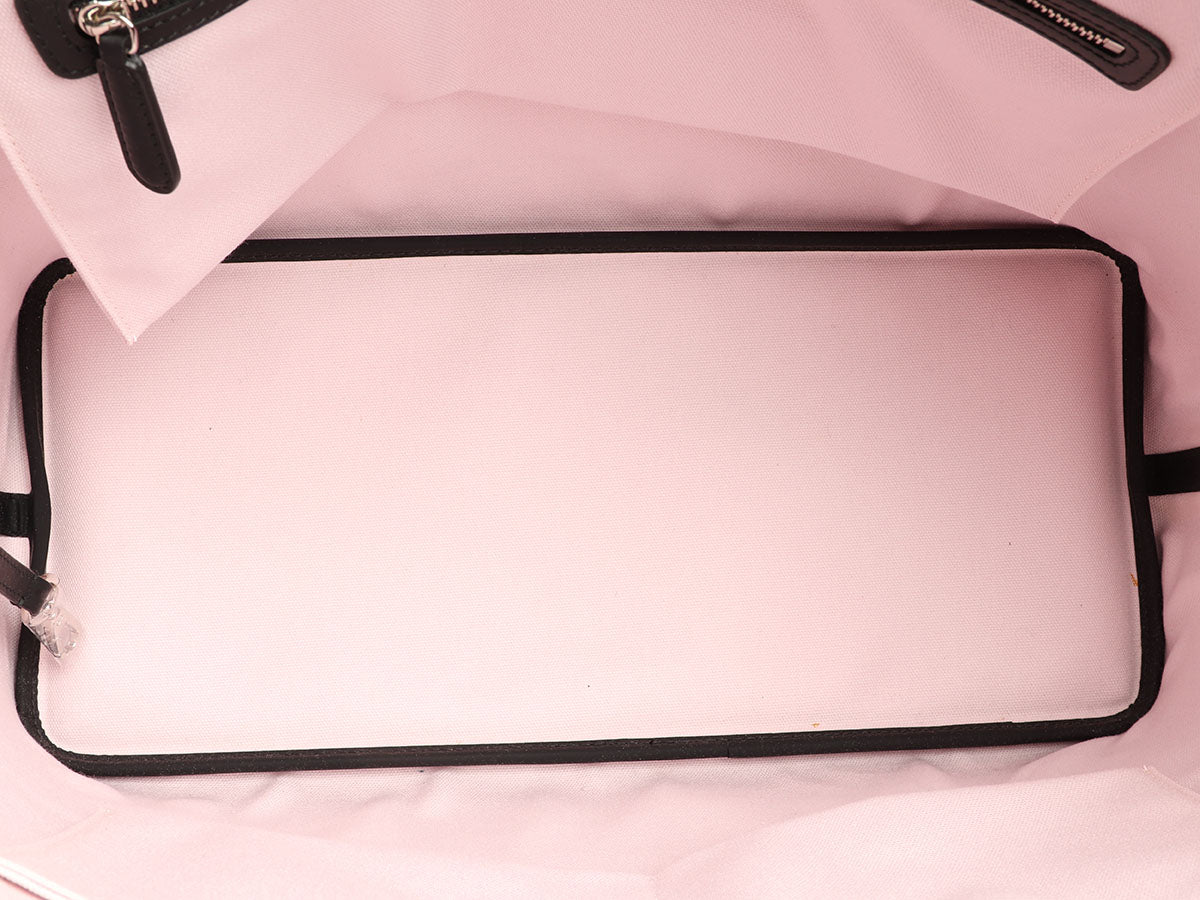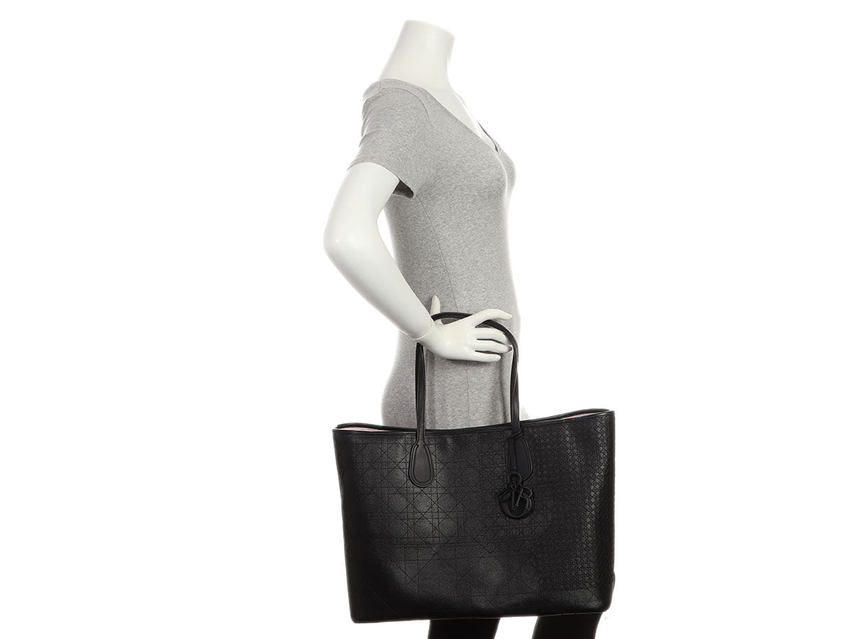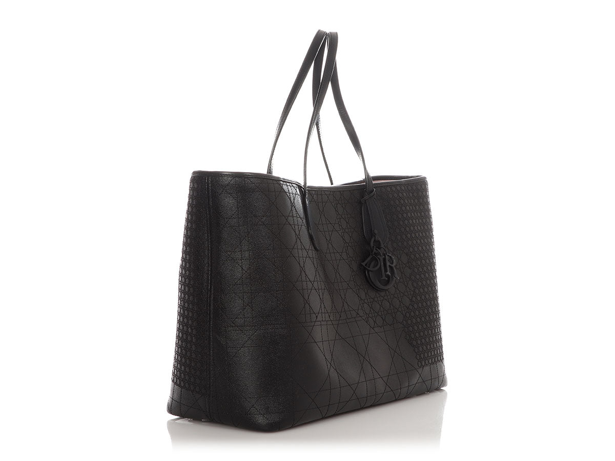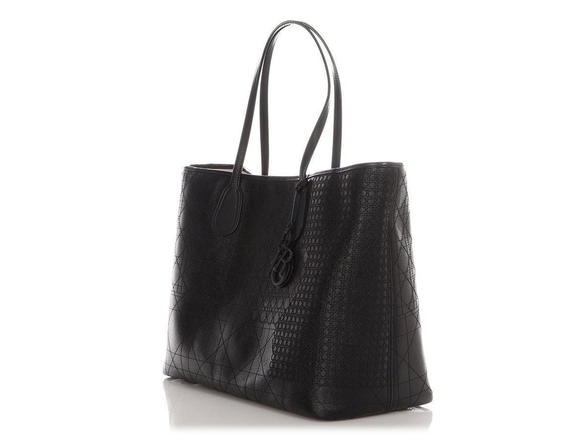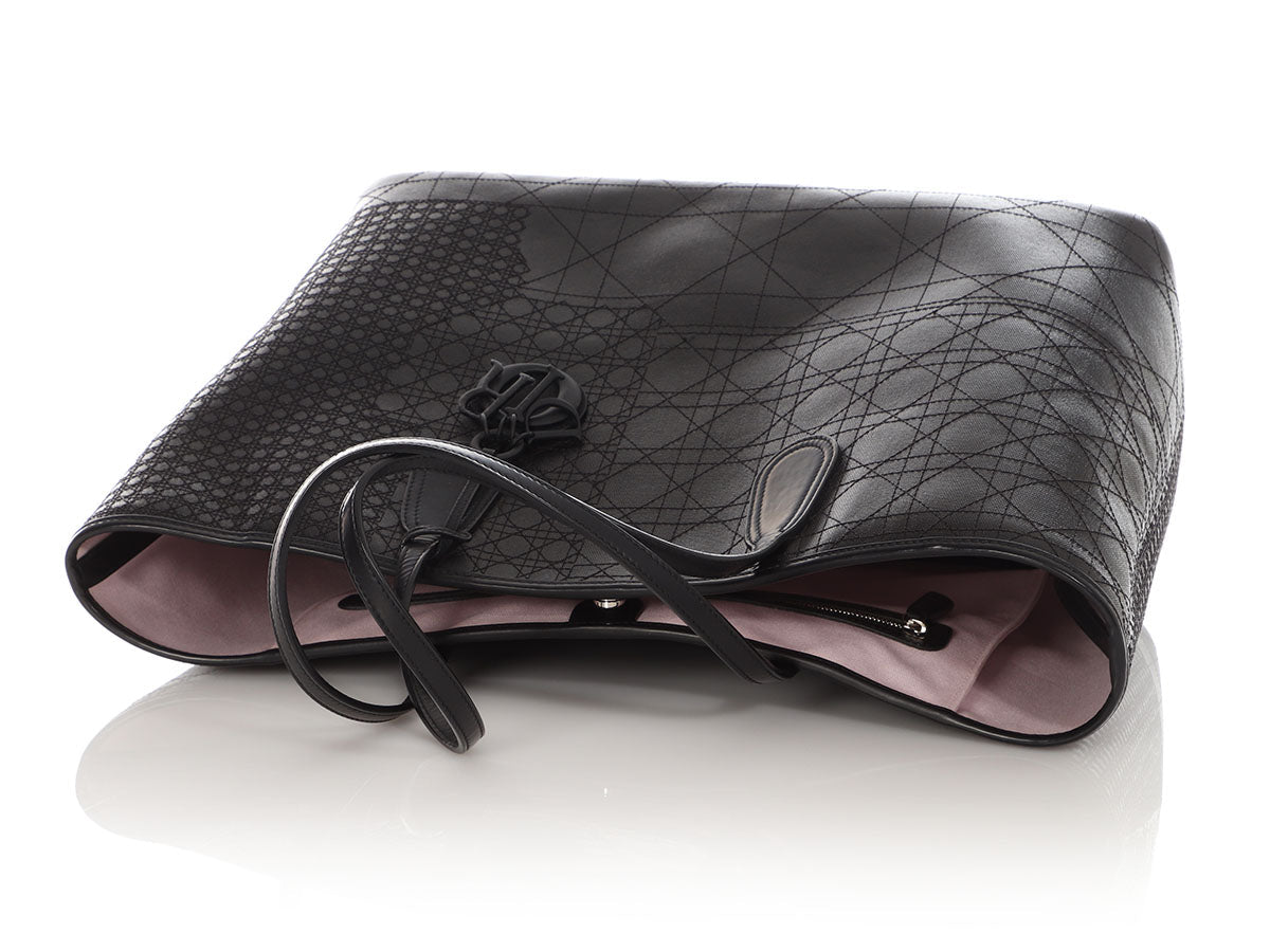 Large enough to fit a laptop along with all your daily essentials, this Dior Black Panarea Tote is a reboot of an older style! Made of black coated canvas with micro, mini, and regular cannage quilting, it has black leather shoulder straps with an 8.25-inch drop. The top secures with a magnetic snap and inside you’ll find a pink-fabric-lined interior with one zipped and two slide pockets. In pristine condition with a dustbag and cards, it has some white marks on the letter charms, although I don’t think it has been carried. Previous versions of this bag had metallic charms—this one has cool black charms!