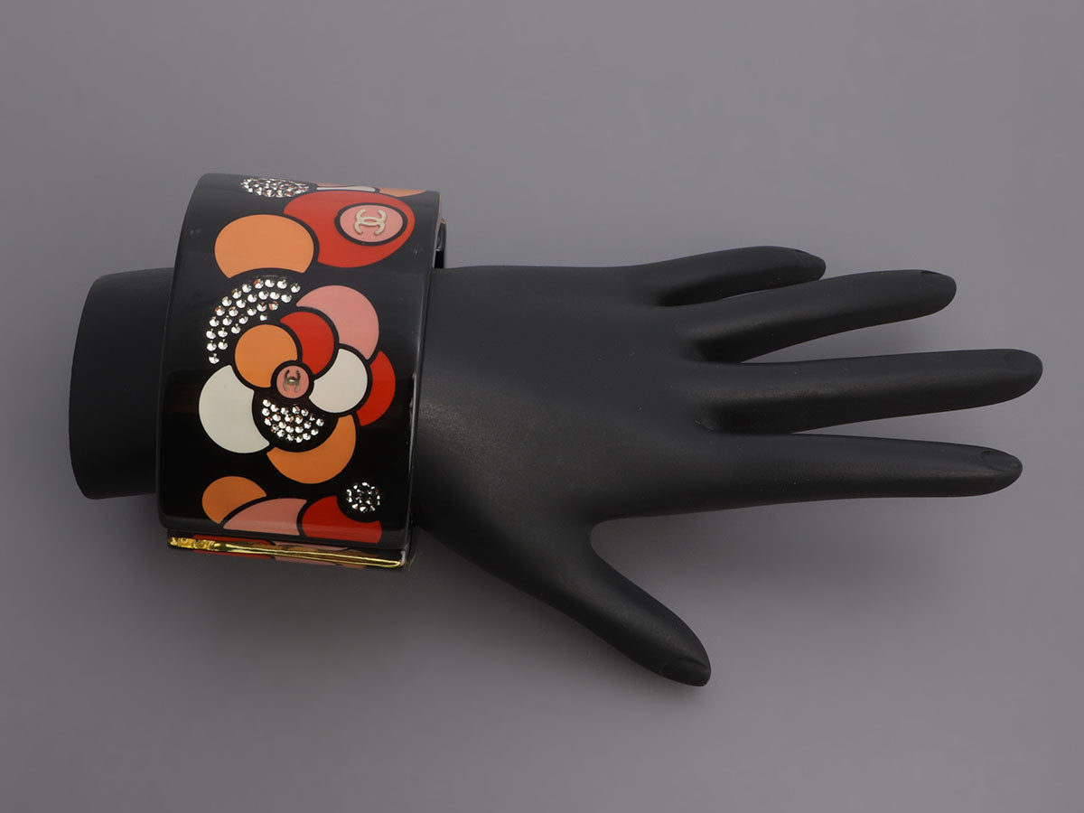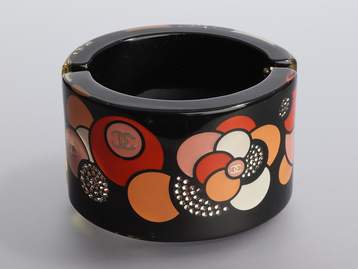 This fun Chanel Silver-Tone Resin and Crystal Camelia Bracelet is a cuff Coco, a costume-jewelry junkie, would have approved! Made of black resin, it is awash in orange, red, pink, and white circles, white crystals, and silver-tone logos. This 49-millimeter-wide bracelet fits smaller due to its width but the hinged side helps get it on. In very good condition with a box and pouch, it has marks on the resin. The pops of color this cuff give off make it the perfect accessory for day or evening!
