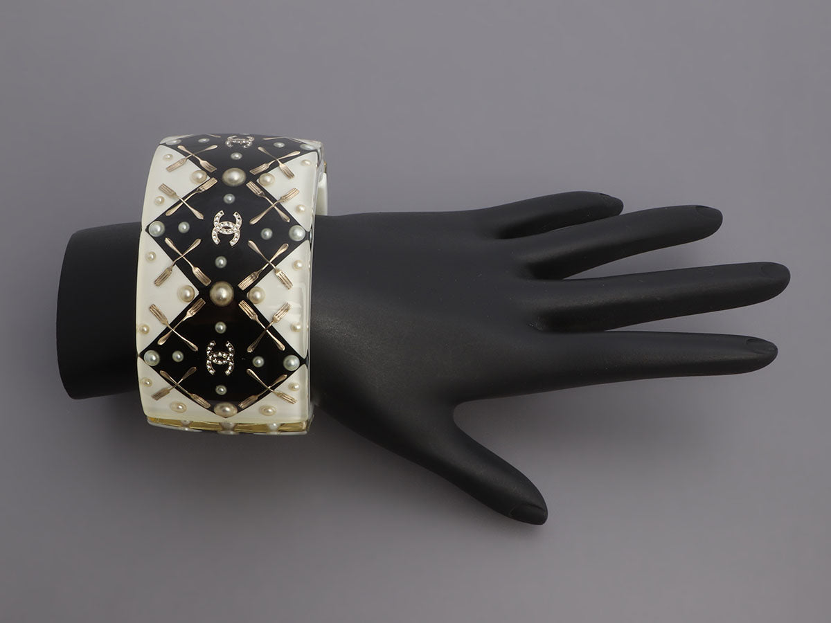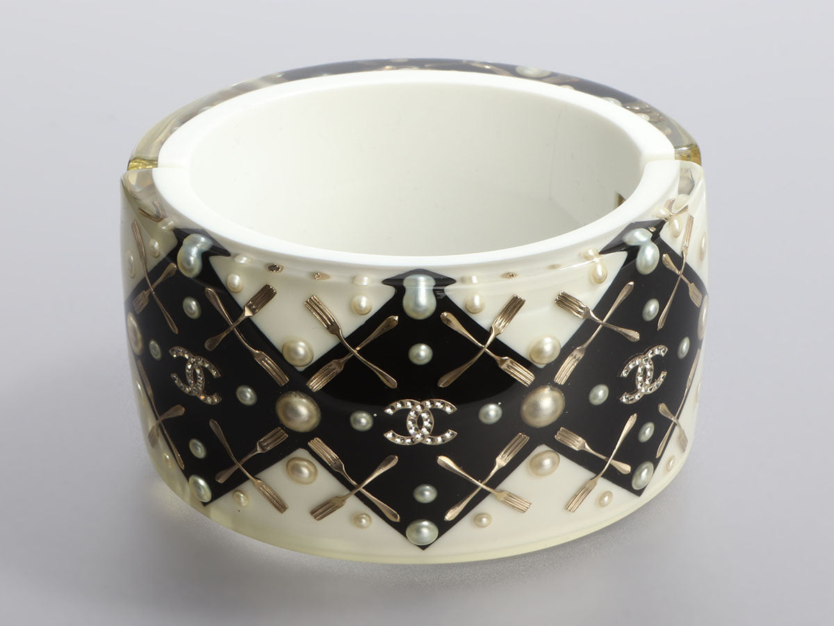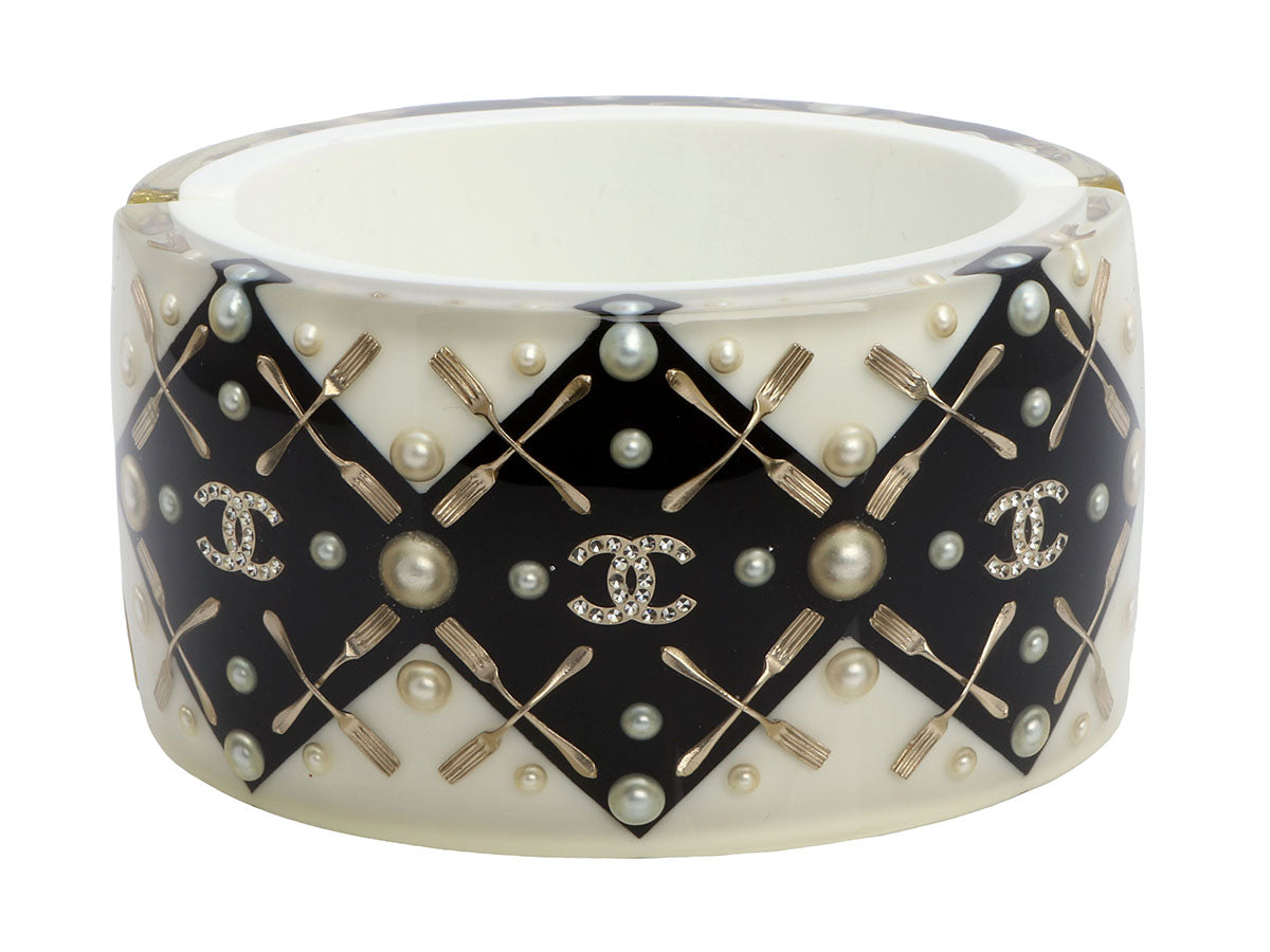 This unusual black-and-white Chanel Two-Tone Resin and Crystal Coco Brasserie CC Bracelet features an embedded gold-tone fork design! The 43-millimeter-wide cuff fits smaller because of its width but it is oval in shape and opens with a silver-tone magnetic clasp and hinge. New and never worn, it comes with a box and pouch. Pearls, crystals, and logos galore complete this look!