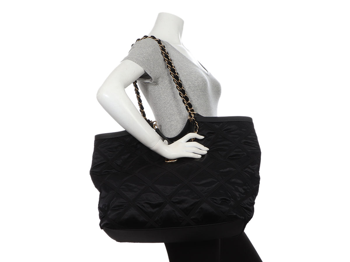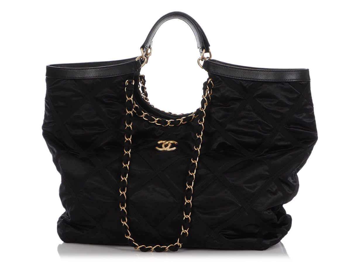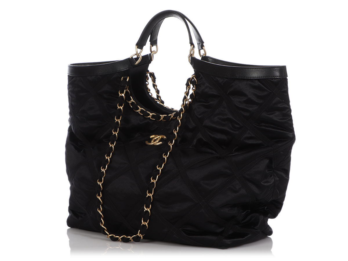When I say this Chanel Black Nylon Shopping Tote is a Maxi, I mean MAXI! Made with gold-tone hardware and lightweight part-quilted nylon, it is trimmed with black leather, has fabric-through-chain details, and a CC logo on the front. The open top has a magnetic tab and one zipped and two slide pockets in the black-fabric interior, and dual flat leather handles have a 7.5-inch drop, while the dual fabric-and-chain straps have a 12-inch drop for the shoulder. In very good condition from 2022 and still in stores, it comes with a dustbag and has light wear inside and on the exterior bottom. In a bag this size, the slide pocket on the back face is actually large enough to hold more than a valet ticket!