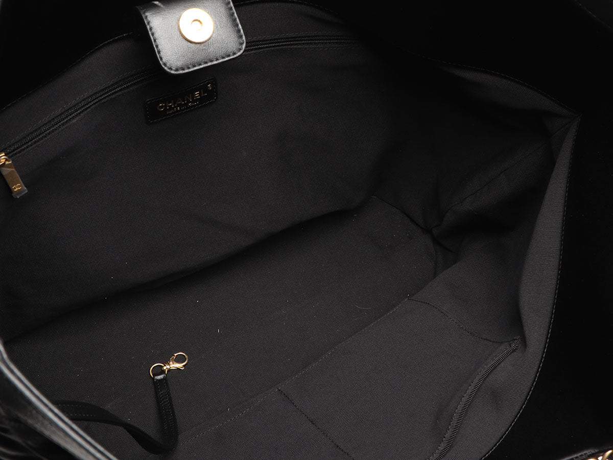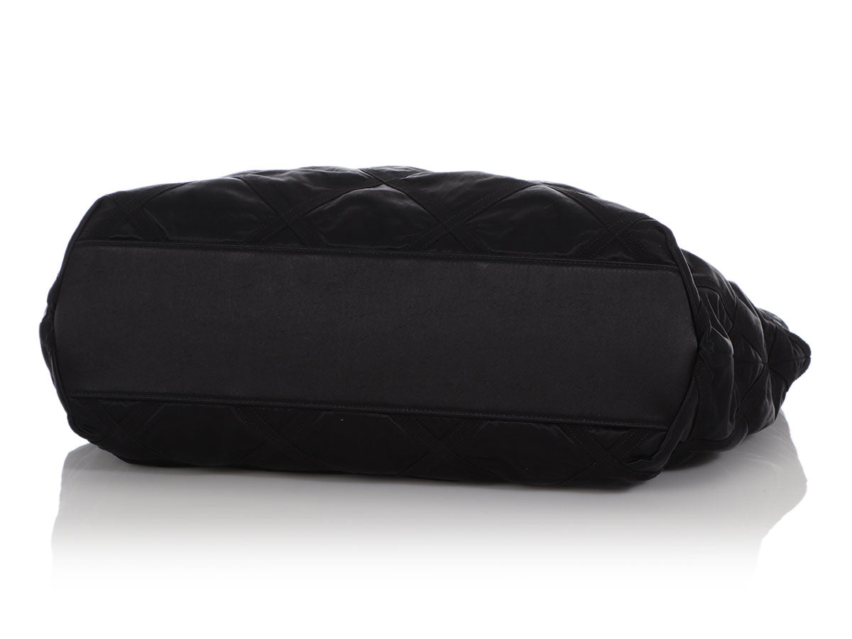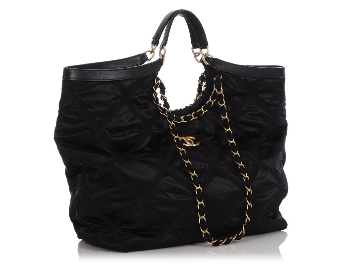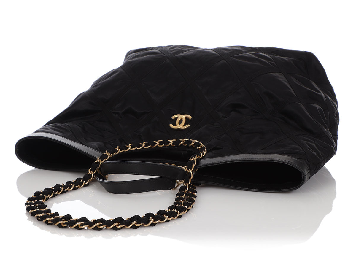 When I say this Chanel Black Nylon Shopping Tote is a Maxi, I mean MAXI! Made with gold-tone hardware and lightweight part-quilted nylon, it is trimmed with black leather, has fabric-through-chain details, and a CC logo on the front. The open top has a magnetic tab and one zipped and two slide pockets in the black-fabric interior, and dual flat leather handles have a 7.5-inch drop, while the dual fabric-and-chain straps have a 12-inch drop for the shoulder. In very good condition from 2022 and still in stores, it comes with a dustbag and has light wear inside and on the exterior bottom. In a bag this size, the slide pocket on the back face is actually large enough to hold more than a valet ticket!