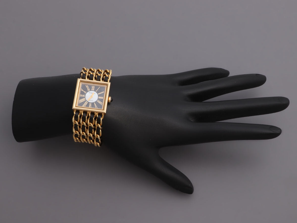 Chanel’s 18K Yellow Gold Mademoiselle Watch 23mm is a vintage piece that stands the test of time! The square 18K yellow gold case holds a black dial with gold-tone Roman numeral hour markers and a mother of pearl circle at the center. The bracelet is made of four strands of chains interwoven with black leather and has a flip-lock clasp. In very good condition, it has marks on the metal, wear on the leather in the chain, and is a bit perfume-y. This Swiss-made quartz watch has the weight of quality!