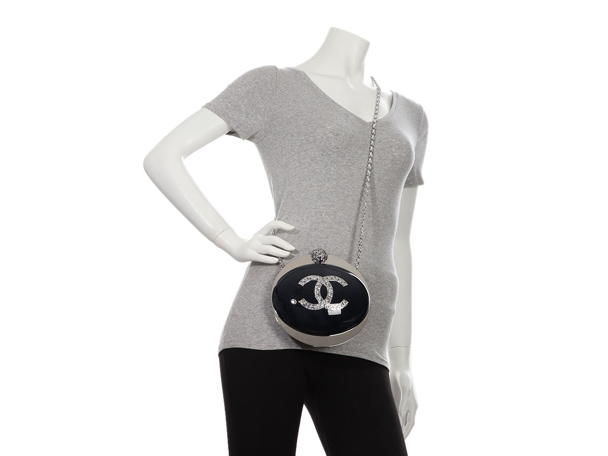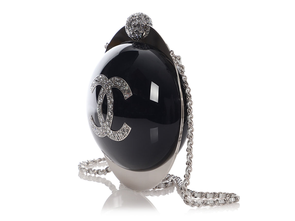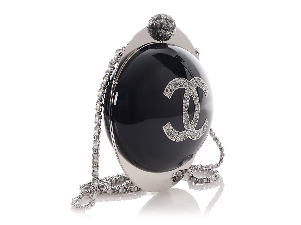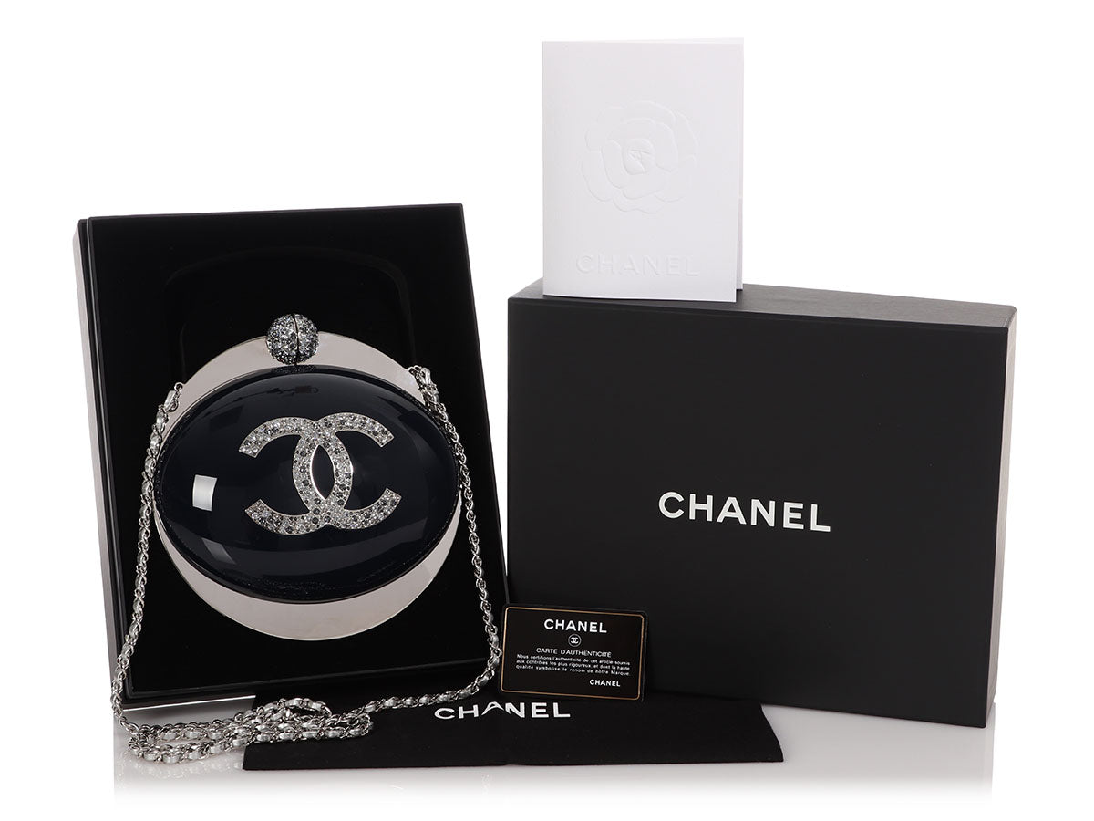 Chanel’s Navy Evening on the Moon Minaudière is the perfect accessory for a night on the town or a daytime stroll! Made of navy-blue resin, this round frame bag is decked out with silver-tone hardware, a Swarovski crystal ball clasp and a crystal-studded CC logo on the front face. It has a silver-leather interior with no pockets and the leather-threaded chain strap has a generous 22-inch crossbody drop. In pristine condition from 2017-18, it comes with a dustbag, box, and card and was probably not worn but there are a few very faint marks on the metal. This very cool bag is truly out of this world!