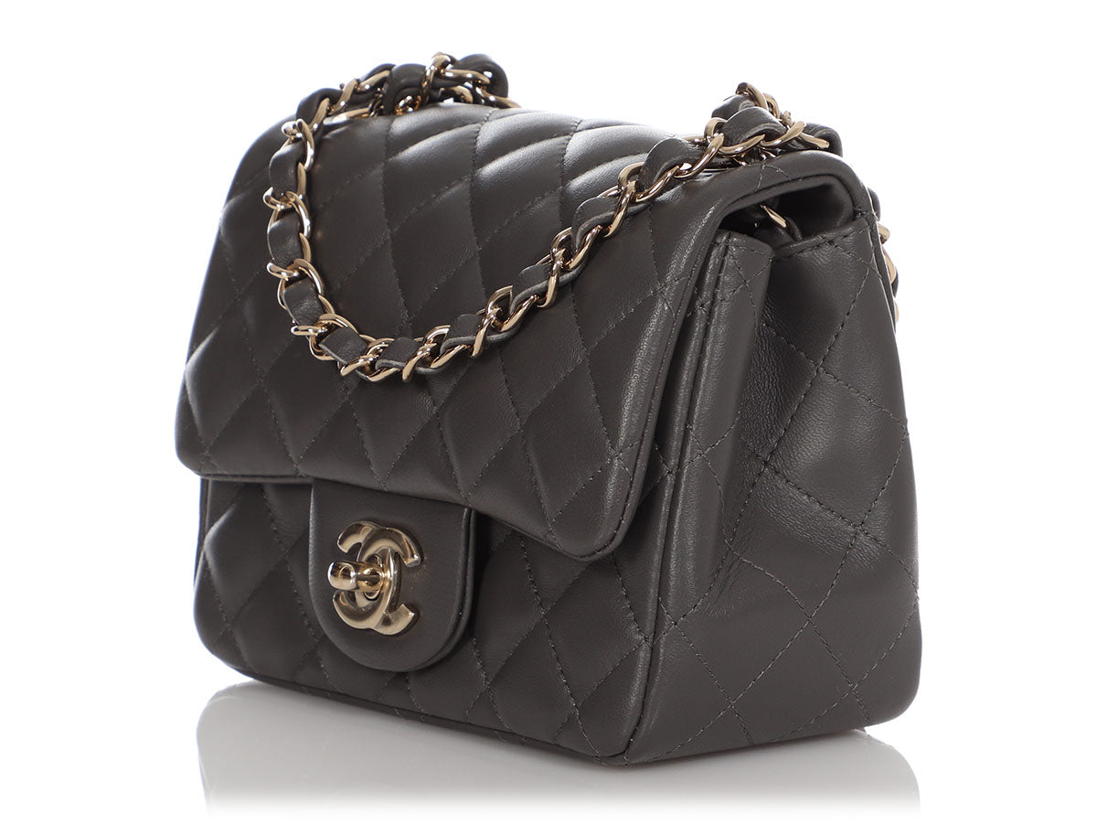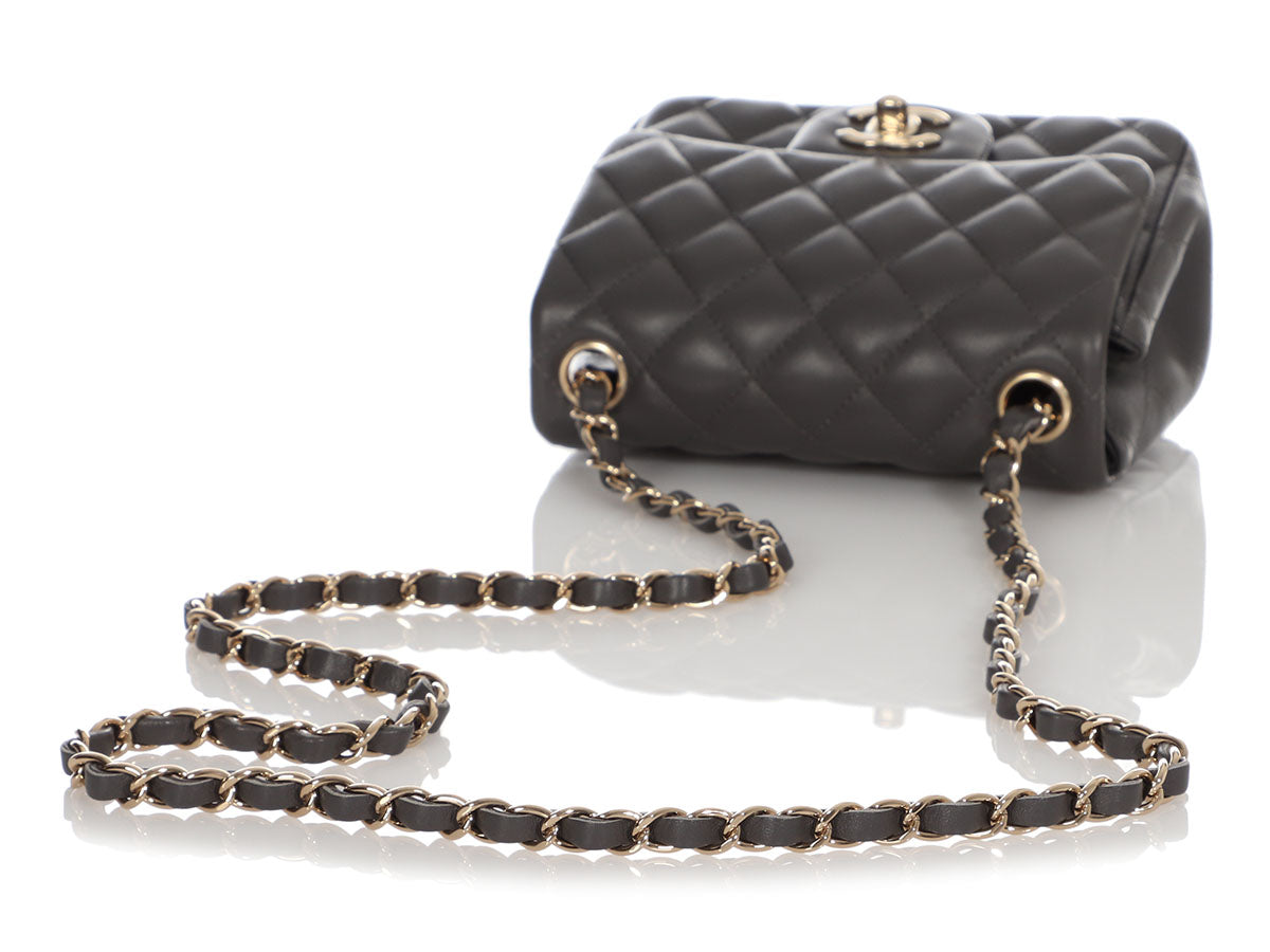 Chanel’s Mini Dark Gray Lambskin Classic is a petite piece that lives up to its classic moniker! Made of gray diamond-quilted lambskin leather with a slide pocket on the back and a 20-inch drop to the champagne gold chain and matching leather strap, a turnlock secures the flap, opening to gray leather lining inside with one zipped and one slide pocket. In very good condition with a box, dustbag, card, and tag, There are small scratches on the turnlock and under the flap as well as very faint wear on the corners. Classic styling and classic good looks really make this bag live up to its name!