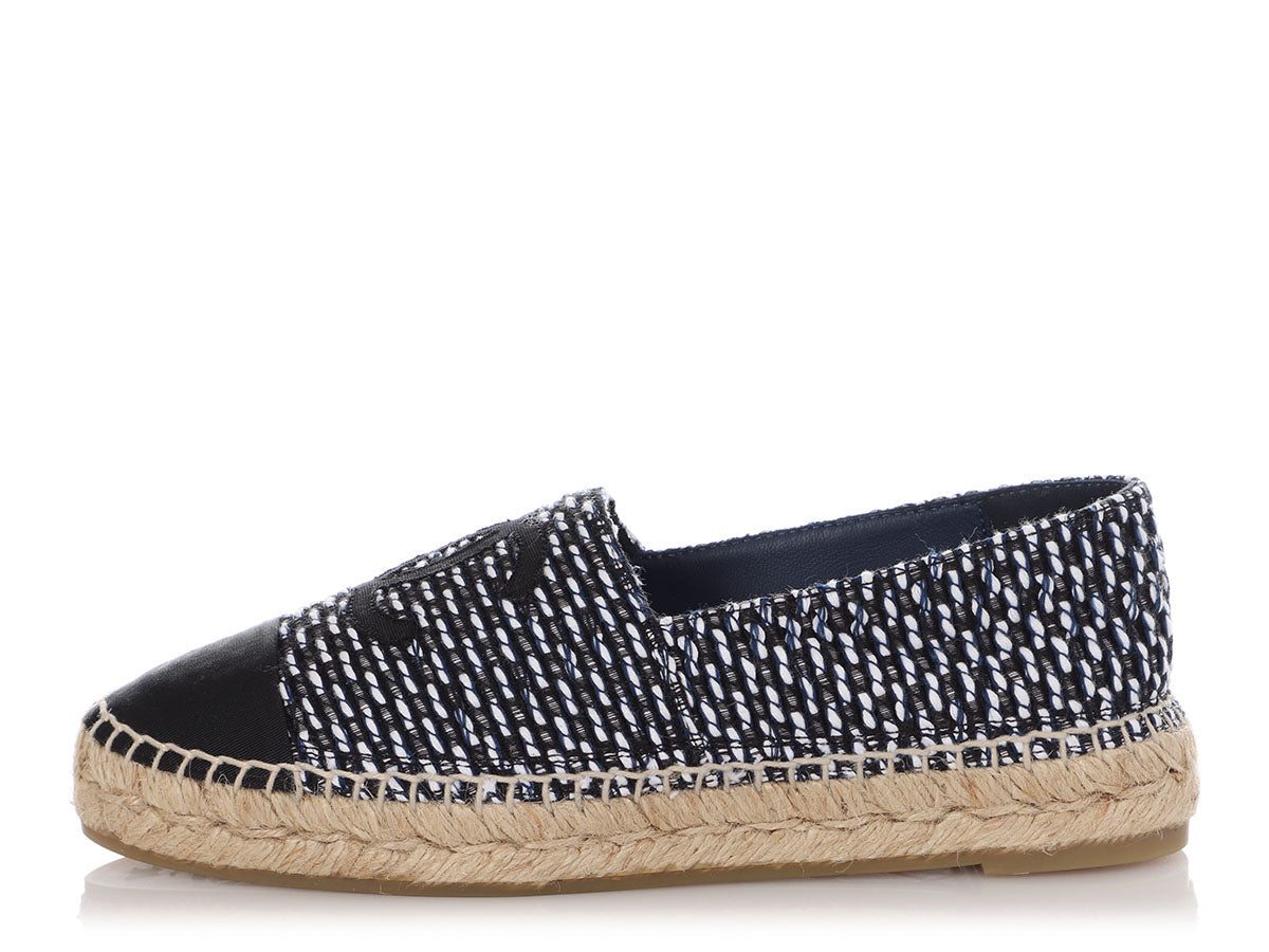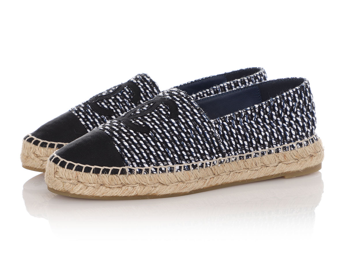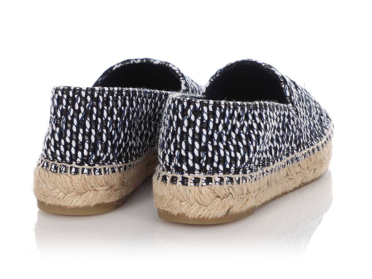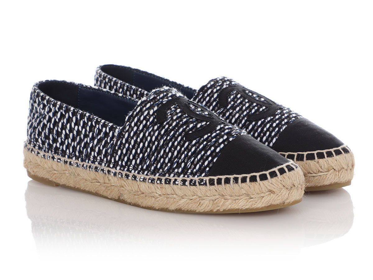 Chanel’s Black, Navy, and White Tweed Espadrilles have a cool, classic look! Made of black, navy, and white tweed with jute-wrapped edges, the toes are capped in black fabric and they have black CCs on the tops. New and never worn with a box, two dustbags, and info booklet, they have leather inners, manmade soles, and a casual Chanel style!