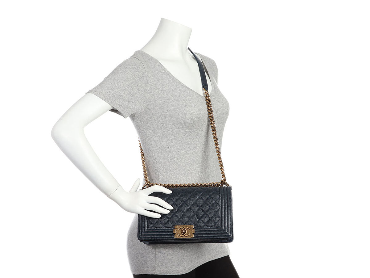You’re in the Dark Navy now when you set sail with Chanel’s Old Medium Quilted Caviar Boy in tow! The blue color is so dark, it appears to be black in some light and is paired with antiqued gold-tone hardware. The faces are diamond-quilted with channel stitched edges and the flap secures with a push-lock Boy clasp that opens to tonal-fabric lining with one slide pocket inside. New and never worn from 2014-15, it comes with a dustbag, box, and card. The chunky chain strap with a leather top is adjustable and can be worn doubled to an 11-inch drop for the shoulder or with a 19.5-inch crossbody drop for an easy-breezy hands-free carry!