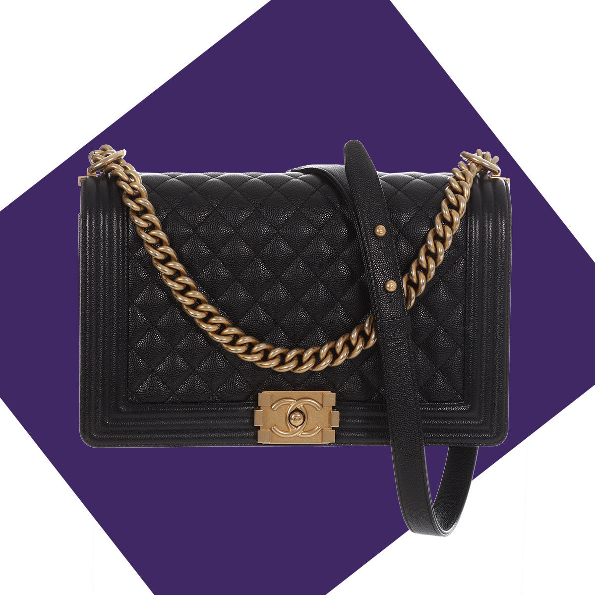 This Chanel New Medium Quilted Boy Bag is a classic in Black Caviar with antiqued-gold hardware! The faces are diamond quilted and the edges are channel stitched in true Boy fashion and the leather-and-chain strap with a leather top has drops of 11 inches for the shoulder when doubled and 19 inches when worn singly as a crossbody. The flap secures with a Boy push clasp and opens to black-fabric lining with one zipped and one slide pocket inside. In very good condition from 2019, it comes with a dustbag and card and has a few marks on the leather, corners, and edges. This style is here to stay, let’s hear it for the Boy!