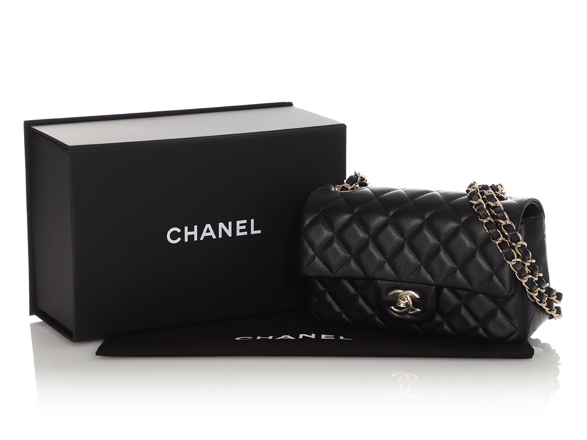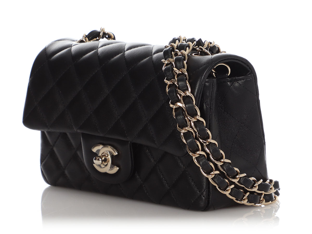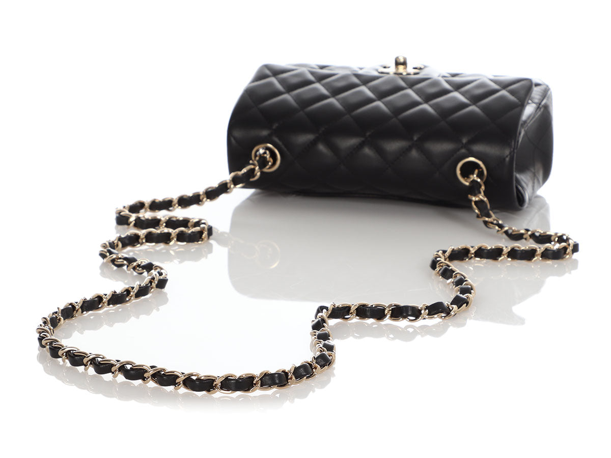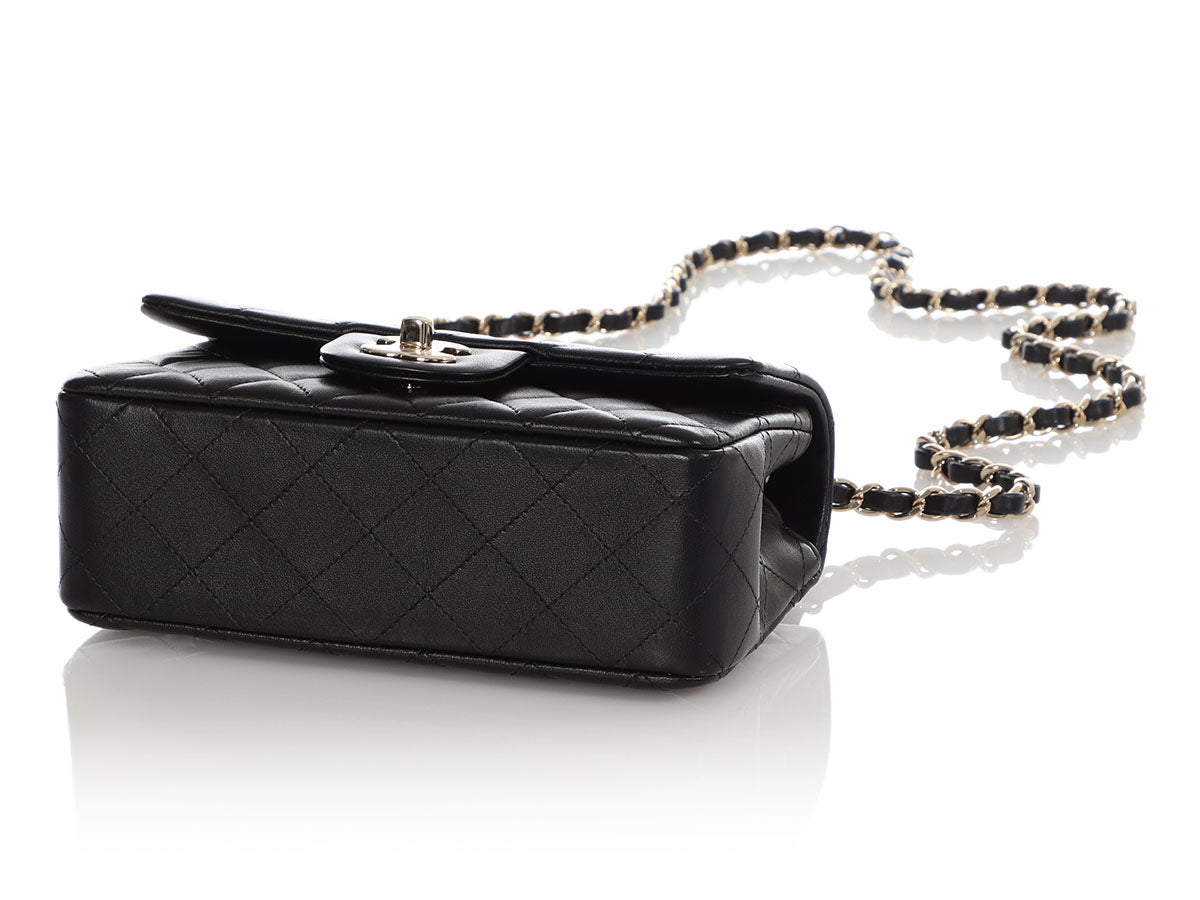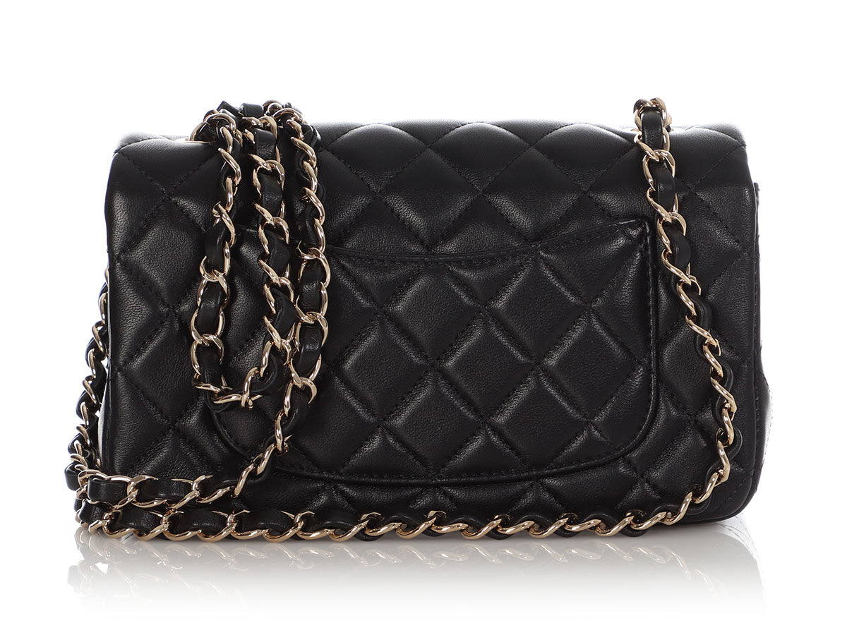 This timeless, classique Chanel is brought to you as a Mini in Black Quilted Lambskin! It has light-gold hardware in the logo turnlock that opens to black-leather lining with one zipped and one slide pocket inside. The leather-and-chain strap has a generous 21.5-inch crossbody drop. New and never worn from 2022, it comes with a dustbag and box and hs a Mona Lisa slide pocket on the back face for incidentals!