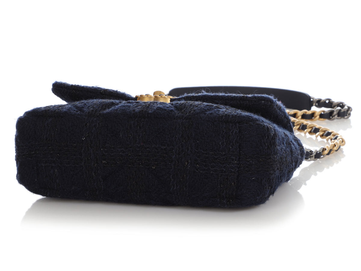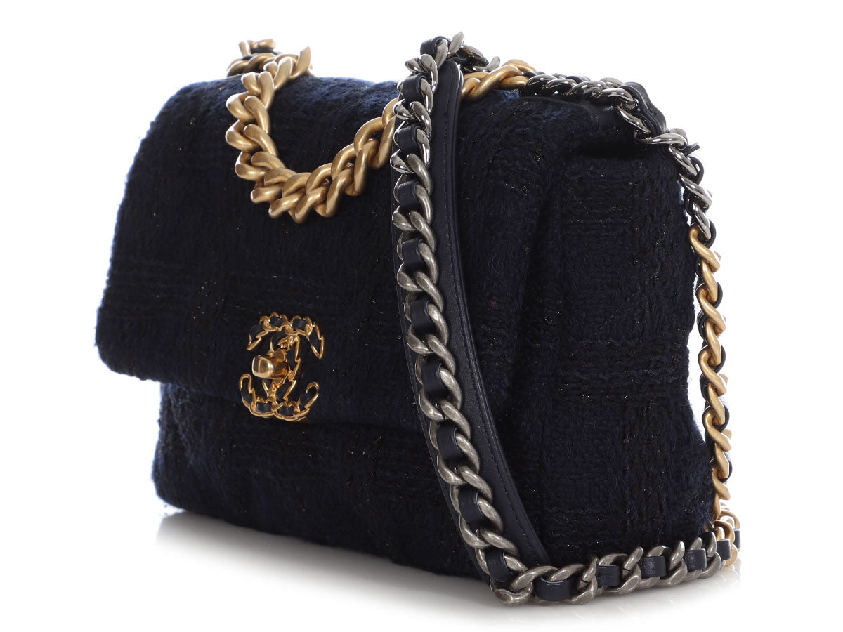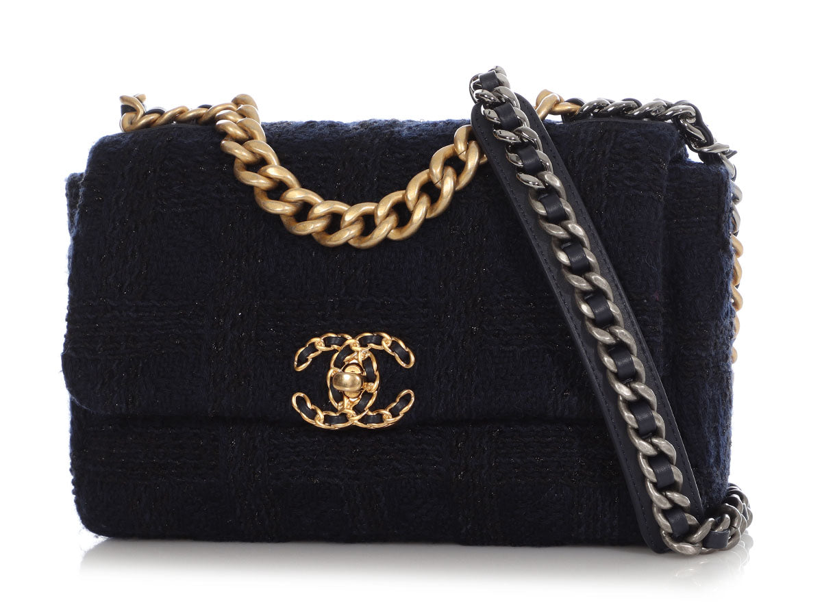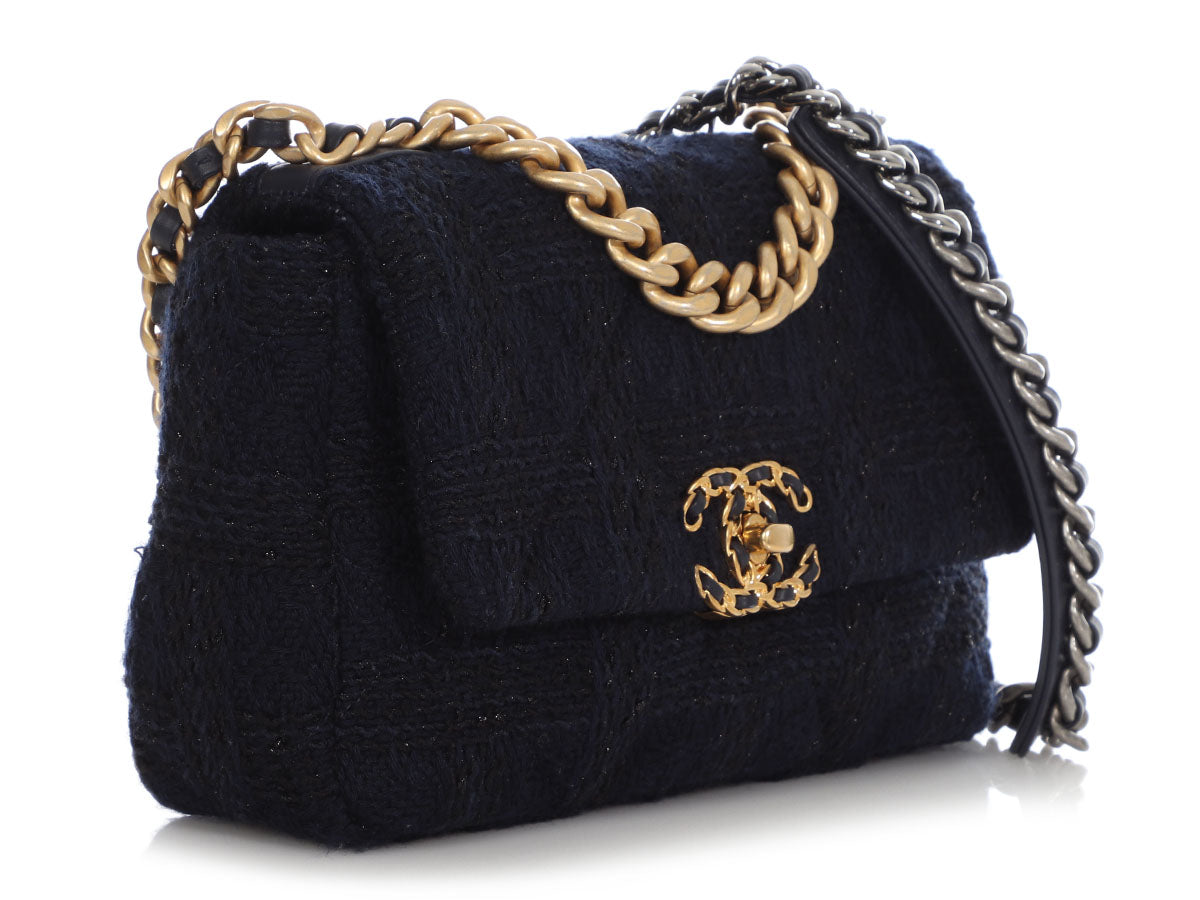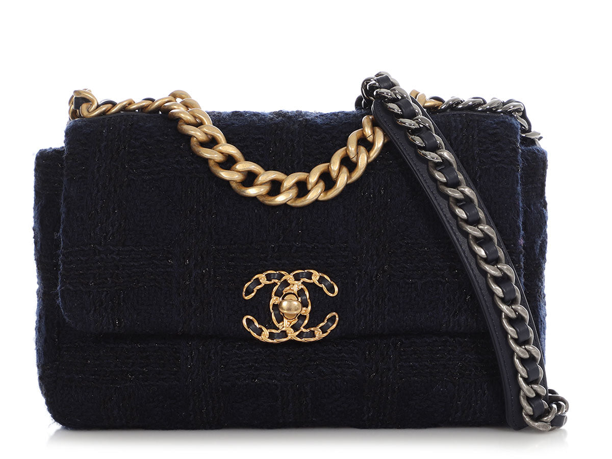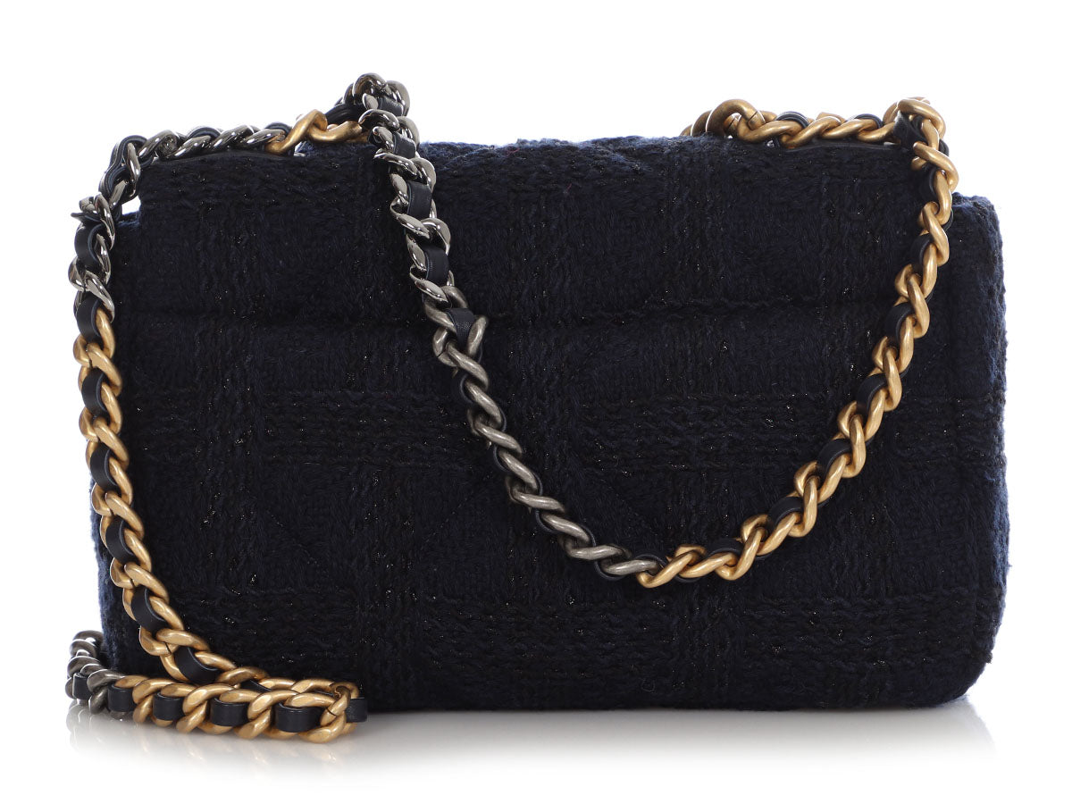 Chanel’s Small Navy Tweed 19 Flap has a bit of a shimmer thanks to a metallic thread running through the fabric! It features tricolor hardware (antiqued gold, antiqued silver, and ruthenium) in the leather-and-chain crossbody strap with an 18-inch drop. The leather-and-metal logo turnlock opens to a navy-fabric lining with one zipped pocket inside, while the back face has one magnetic slide pocket. New and never worn from 2019, it comes with a dustbag, box, and card. When you want to give your shoulder a break, carry this little lovely by the all-chain top handle with a 3-inch drop!