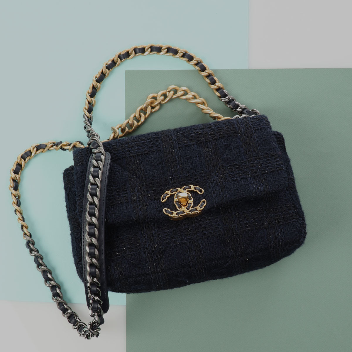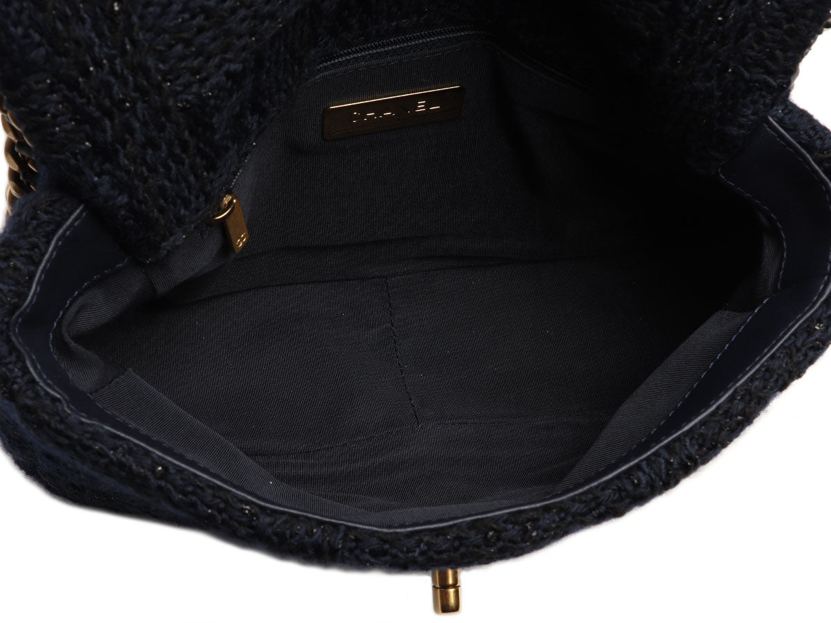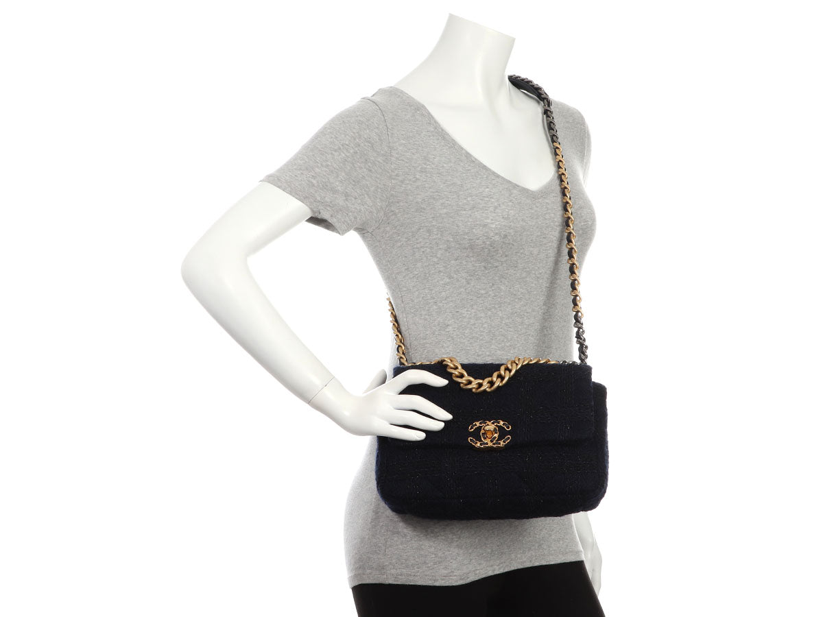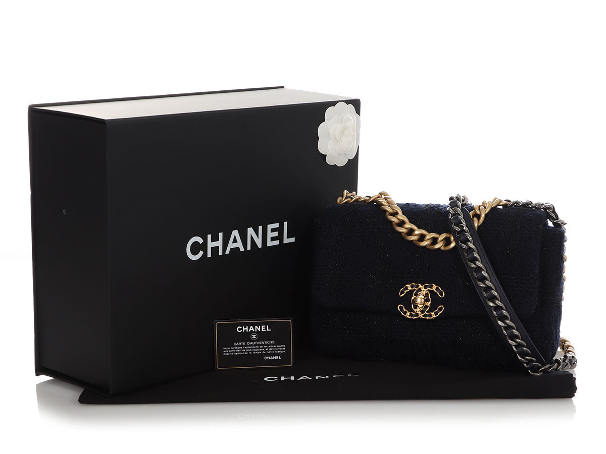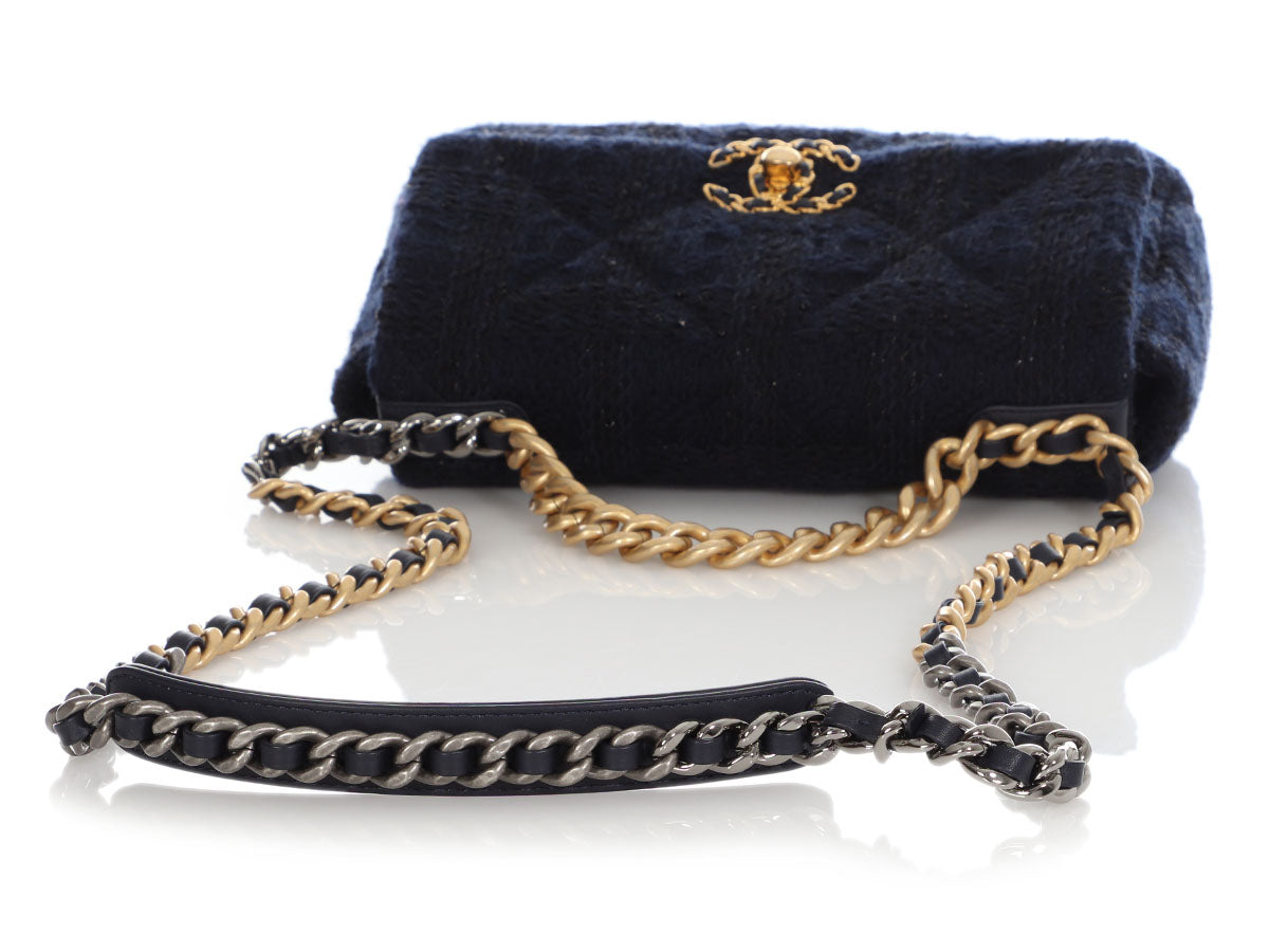 Chanel’s Small Navy Tweed 19 Flap has a bit of a shimmer thanks to a metallic thread running through the fabric! It features tricolor hardware (antiqued gold, antiqued silver, and ruthenium) in the leather-and-chain crossbody strap with an 18-inch drop. The leather-and-metal logo turnlock opens to a navy-fabric lining with one zipped pocket inside, while the back face has one magnetic slide pocket. New and never worn from 2019, it comes with a dustbag, box, and card. When you want to give your shoulder a break, carry this little lovely by the all-chain top handle with a 3-inch drop!