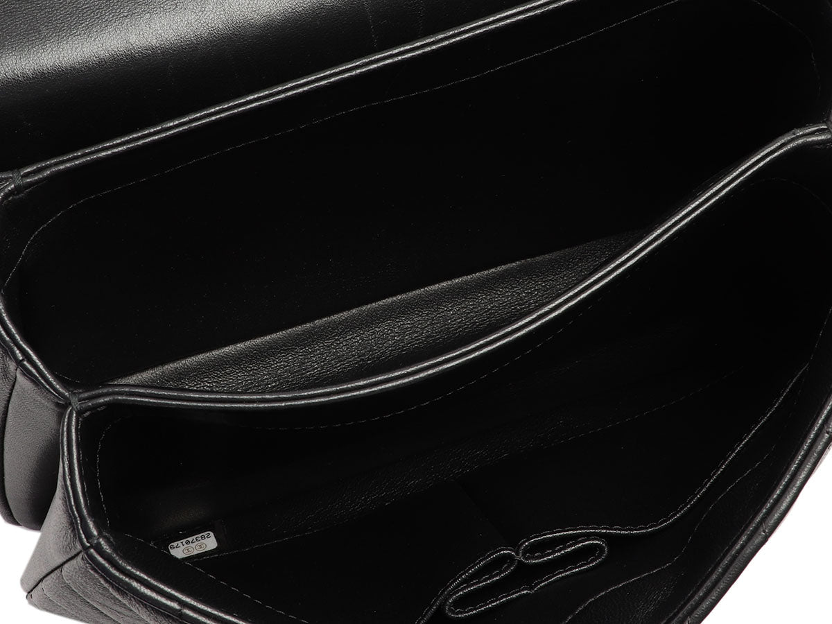 The golden nameplate between the handles of Chanel’s Medium Chevron-Quilted Black Lambskin Trendy CC Flap leaves no doubt as to who designed this beauty! It’s paired with gold-tone hardware in the logo turnlock, attachments for the single rolled handle with a 3.75-inch drop and leather-and-chain crossbody strap with a leather shoulder pad and a drop of 19 inches. The flap opens to an interior divided into three sections and lined with black leather with two slide pockets in the front compartment, nothing in the middle, and a zipped pocket in the back, while the back face has an additional slide pocket. In very good condition from 2019, it comes with a dustbag and card and has scratches on the metal, wear on the corners, edges, and inside, and marks on the leather. The Trendy CC is a style introduced in the spring 2014 collection and considered to be the working woman's alternative to the Classic Flap!
