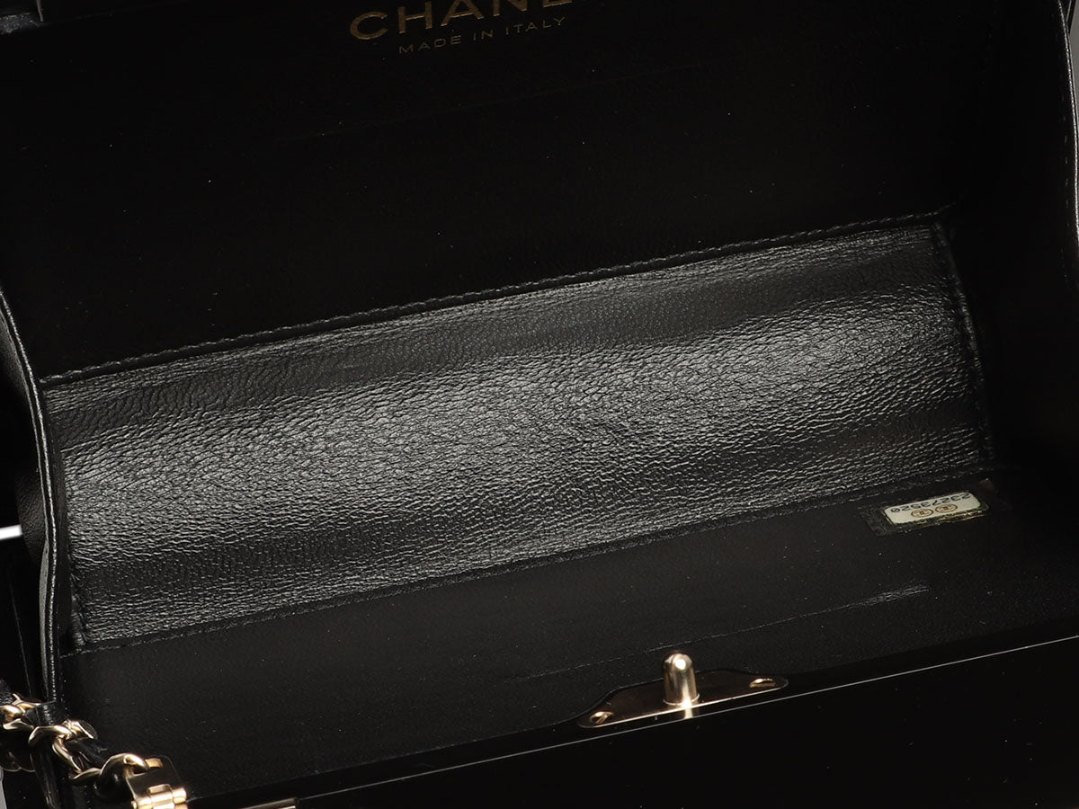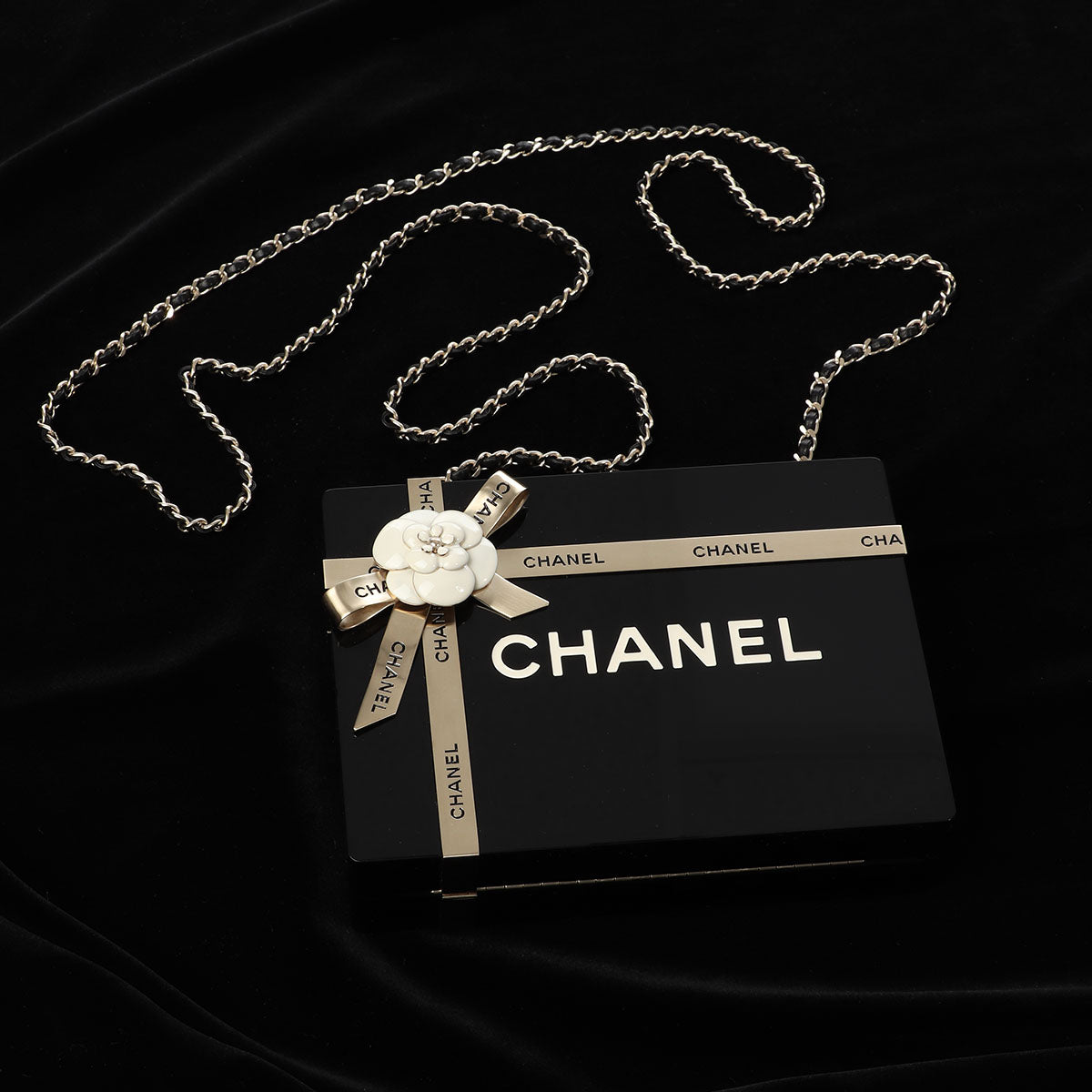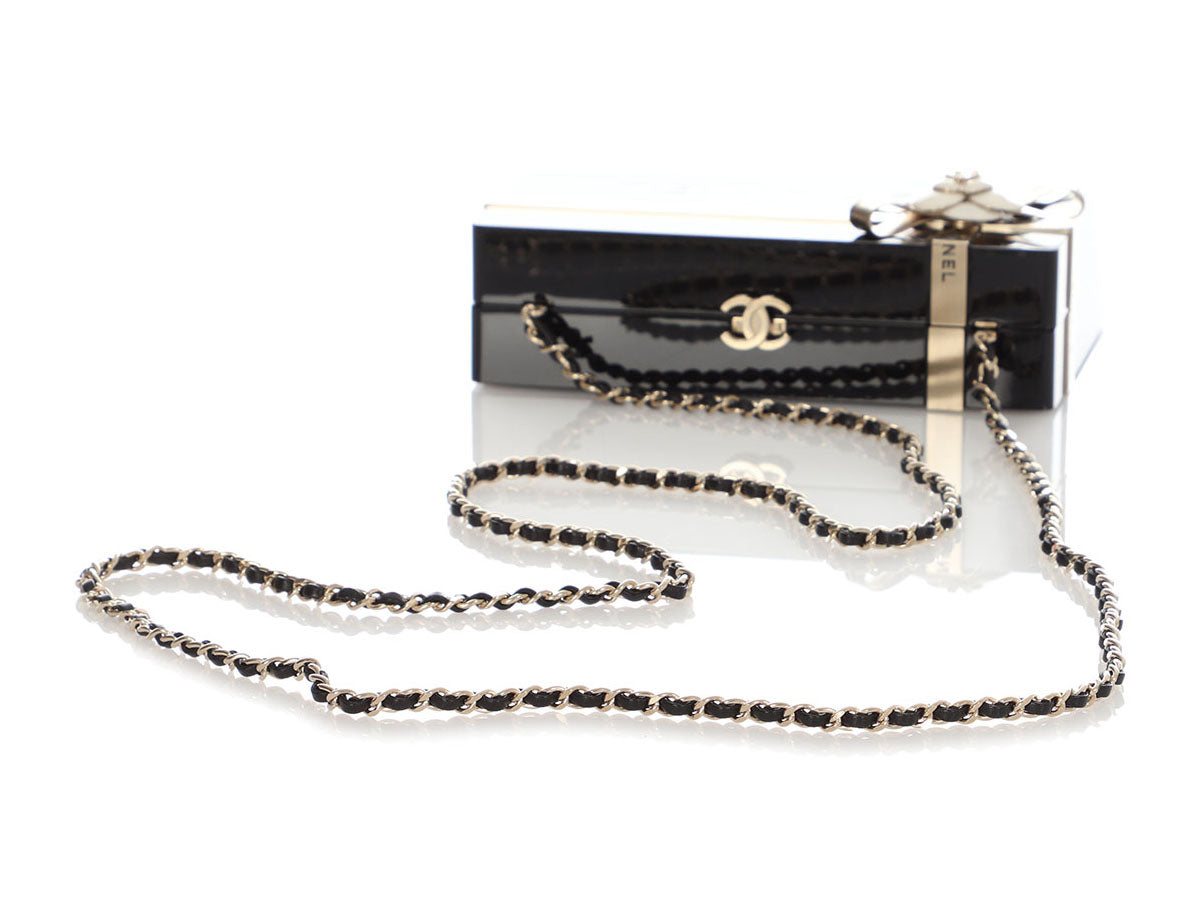 Chanel’s Black Plexiglass Gift Box Minaudière is a small, structured little bag that looks like a wrapped present! The shiny Plexiglass is embellished with a white resin camellia flower and gold-tone hardware in the metal ribbon detailing and CC kiss lock that opens to a black-leather interior with no pockets. The leather-and-chain strap with a 26.5-inch crossbody drop can be tucked inside but that will definitely limit how many essentials you can include. In excellent condition from 2017, this rare carry comes with a dustbag, box, and card and has a bit of wear inside, probably from the chain. When I say this bag is structured, I mean that with a capital S. Unlike a clutch, this has a finite amount of space that can’t be overstuffed and it’s too rigid to tuck under the arm—but what a whimsical, cool, showstopping bag!