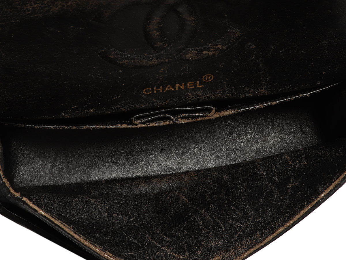 Chanel’s Medium/Large Black Chevron-Quilted Suede Classic Double Flap has six pockets for your organizational pleasure! The first flap secures with a gold-tone logo turnlock and reveals a zippered love-letter pocket on its underside, and a slide pocket beneath it. The second flap is logo-stitched on its underside and unsnaps to reveal a black-leather interior with two slide pockets inside. The suede-through-chain strap has a 9-inch drop when doubled or 16.5-inch when worn long. In fair condition, it comes with a dustbag and box and has scratches on the hardware, wear on the second flap from the love-letter zipper, the corners and edges are smooth, and a very worn interior, but the outside looks fine. The sixth pocket is represented on the back face in the form of a Monia Lisa-smile slide pocket!