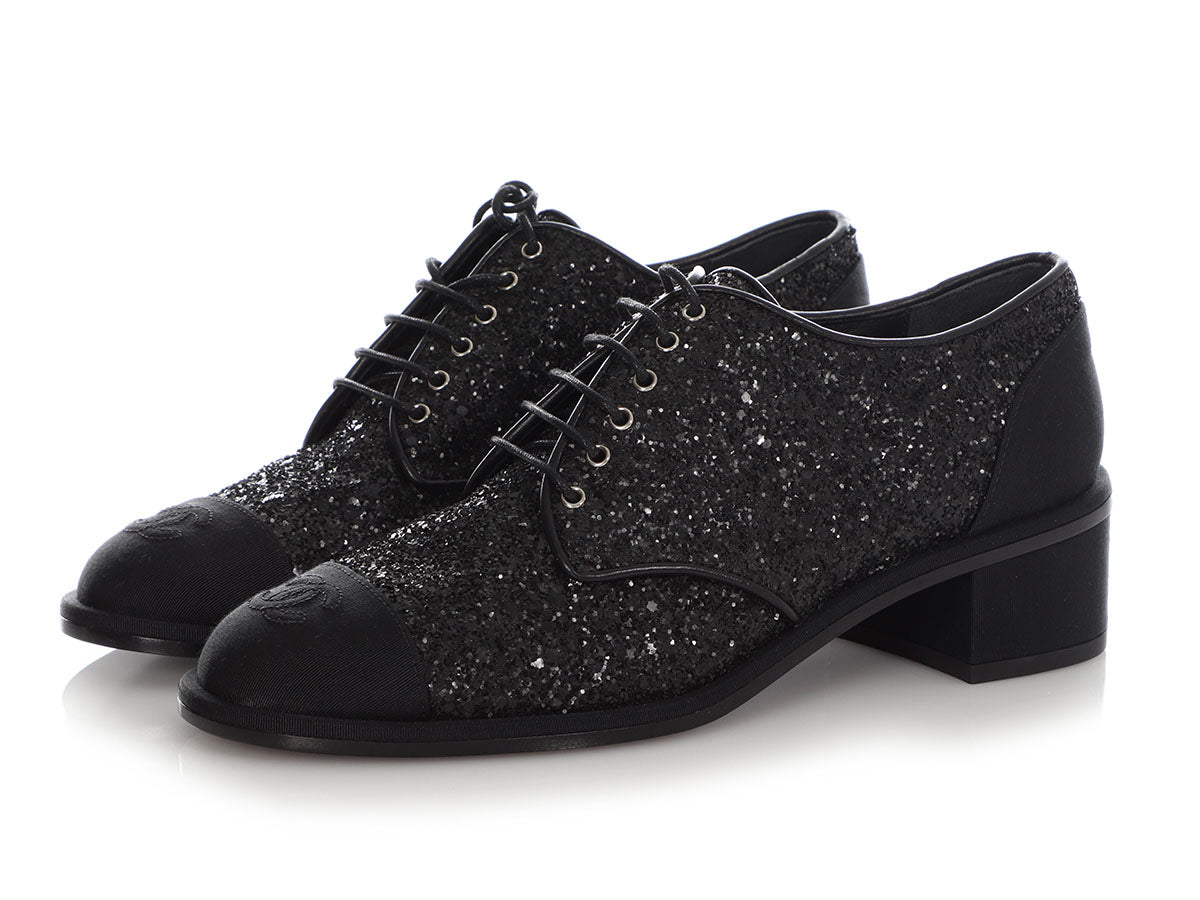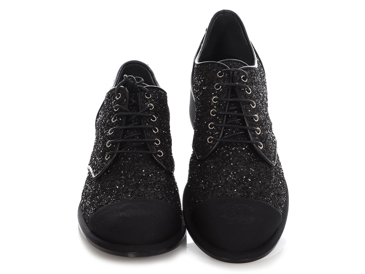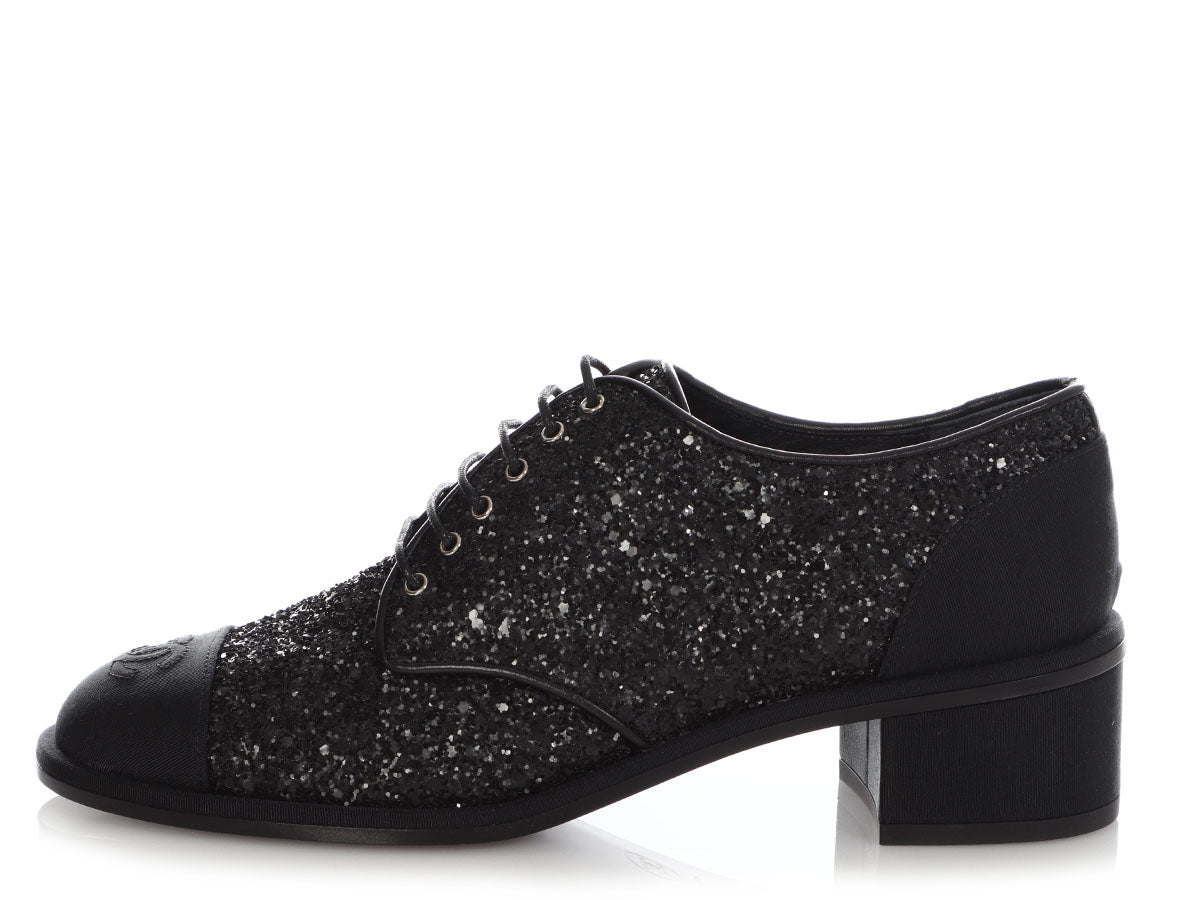 Put some razzle-dazzle in your step with these Chanel Black Glitter and Grosgrain Oxfords! These glitter-covered shoes lace up through silver eyelets and have chunky 1.5-inch heels, capped grosgrain fabric toes with the CC logo stitched in, and leather inners and soles. Brand new with a box, these sparkly Oxfords put on a show when the light hits them just right!