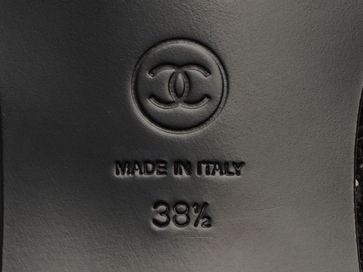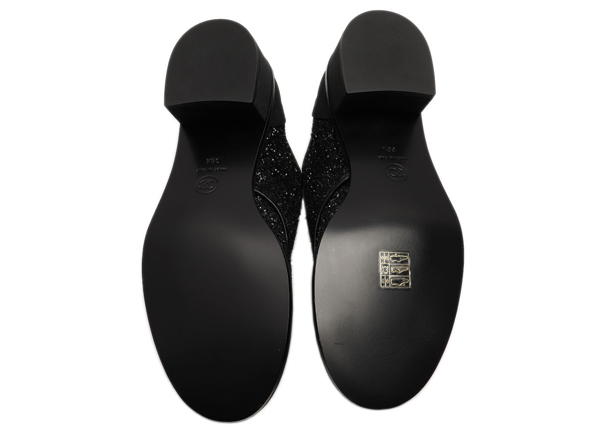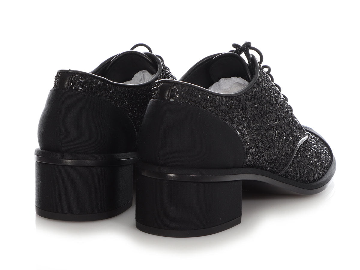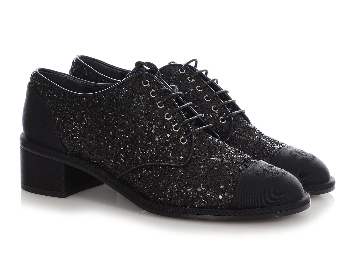 Put some razzle-dazzle in your step with these Chanel Black Glitter and Grosgrain Oxfords! These glitter-covered shoes lace up through silver eyelets and have chunky 1.5-inch heels, capped grosgrain fabric toes with the CC logo stitched in, and leather inners and soles. Brand new with a box, these sparkly Oxfords put on a show when the light hits them just right!