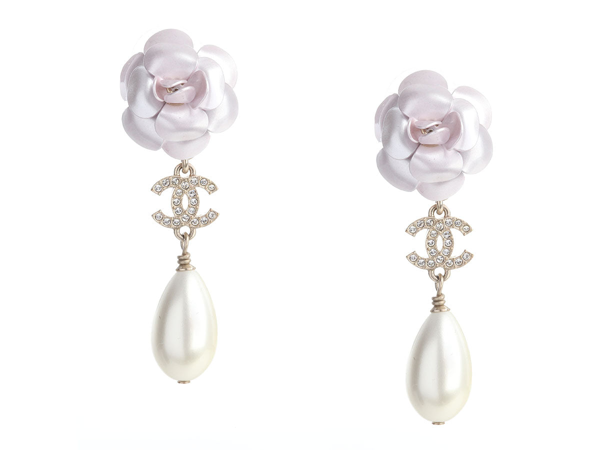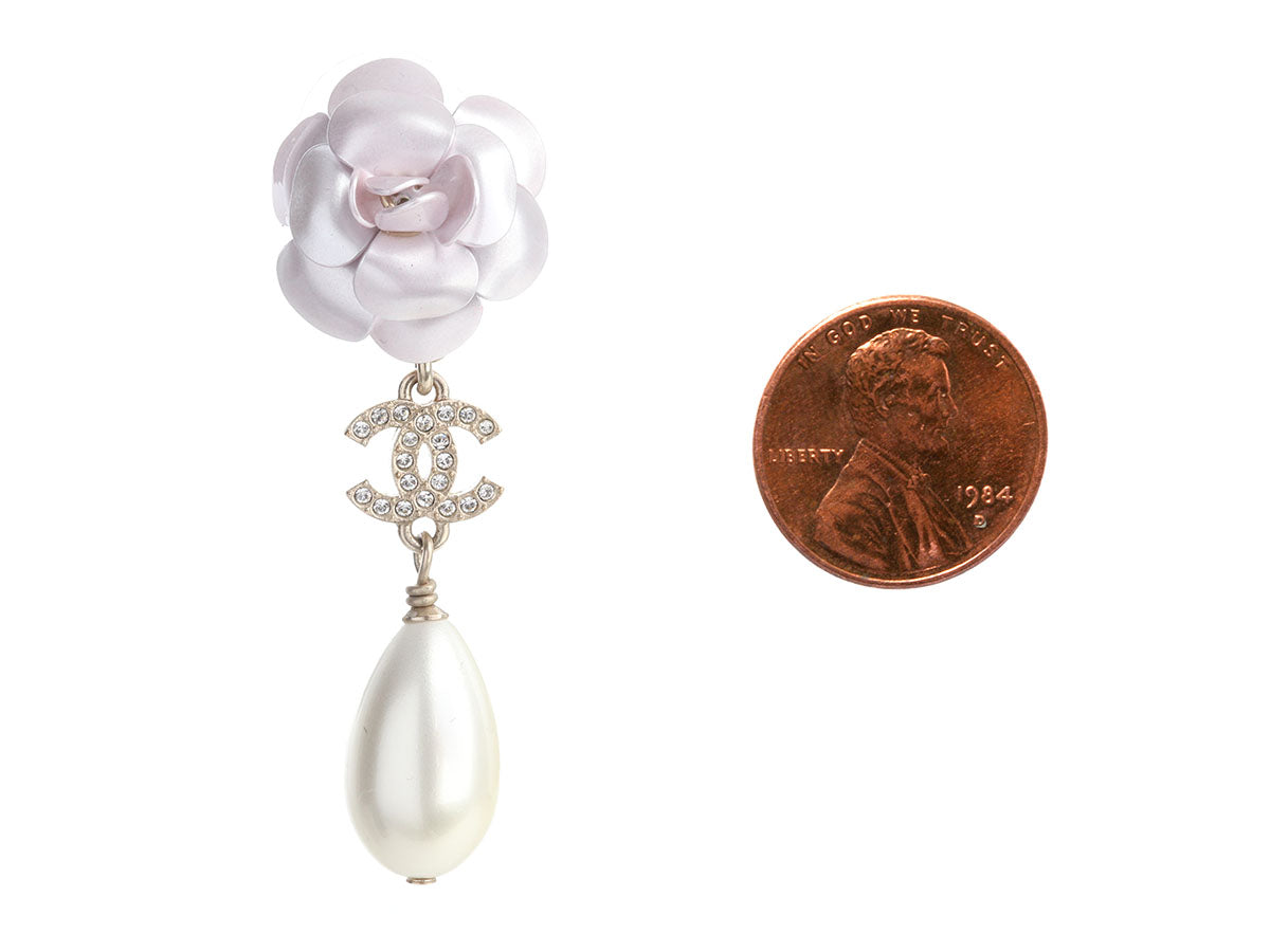 Chanel Large Pearl and Crystal Camellia Pierced Drop Earrings