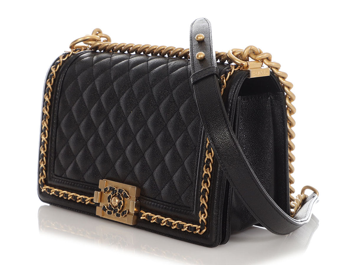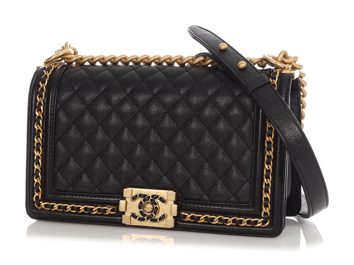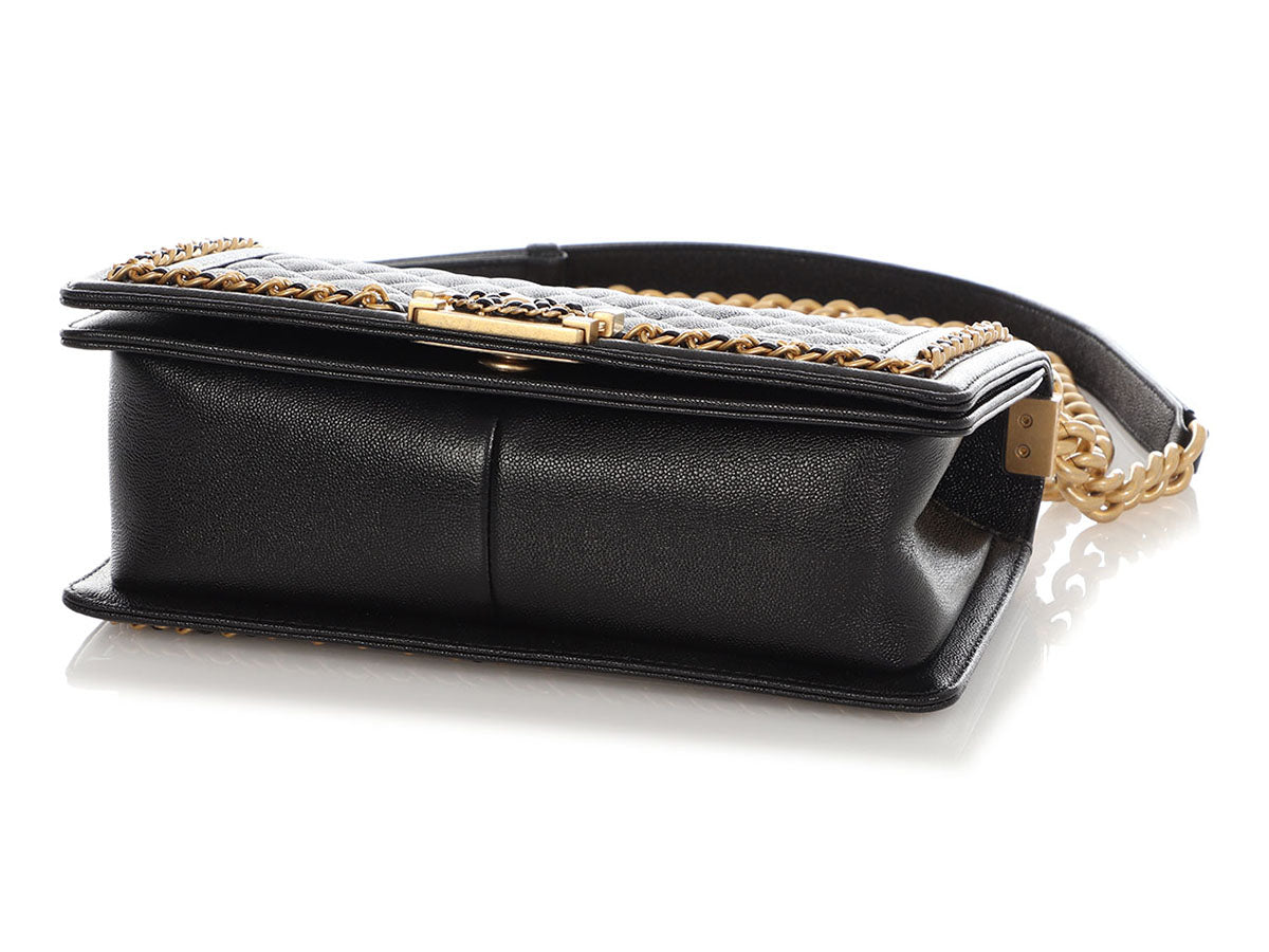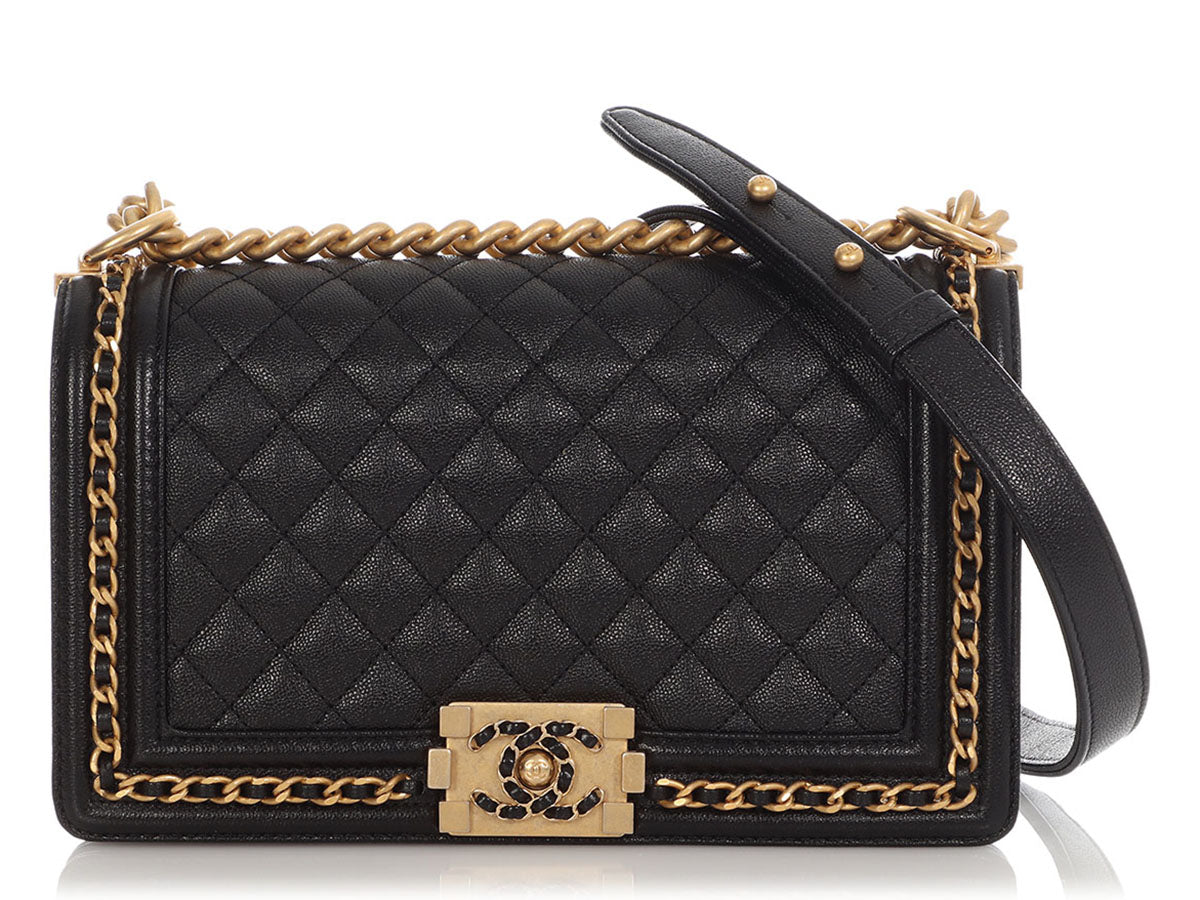 In this Chanel Old Medium Black Quilted Caviar Boy, the channel-stitched edges of a traditional Boy are replaced with leather-woven chain, giving it the name Chain Around! The diamond-quilted front face features a cool leather-and-chain antiqued gold-tone Boy clasp that opens to a black-leather interior with one long slide pocket inside. New and never worn from 2023, it comes with a box. The adjustable-length strap features a combination chunky chain and black-leather shoulder pad that can be worn doubled with an 11-inch drop or at its full length of 19.5 inches as a hands-free crossbody!